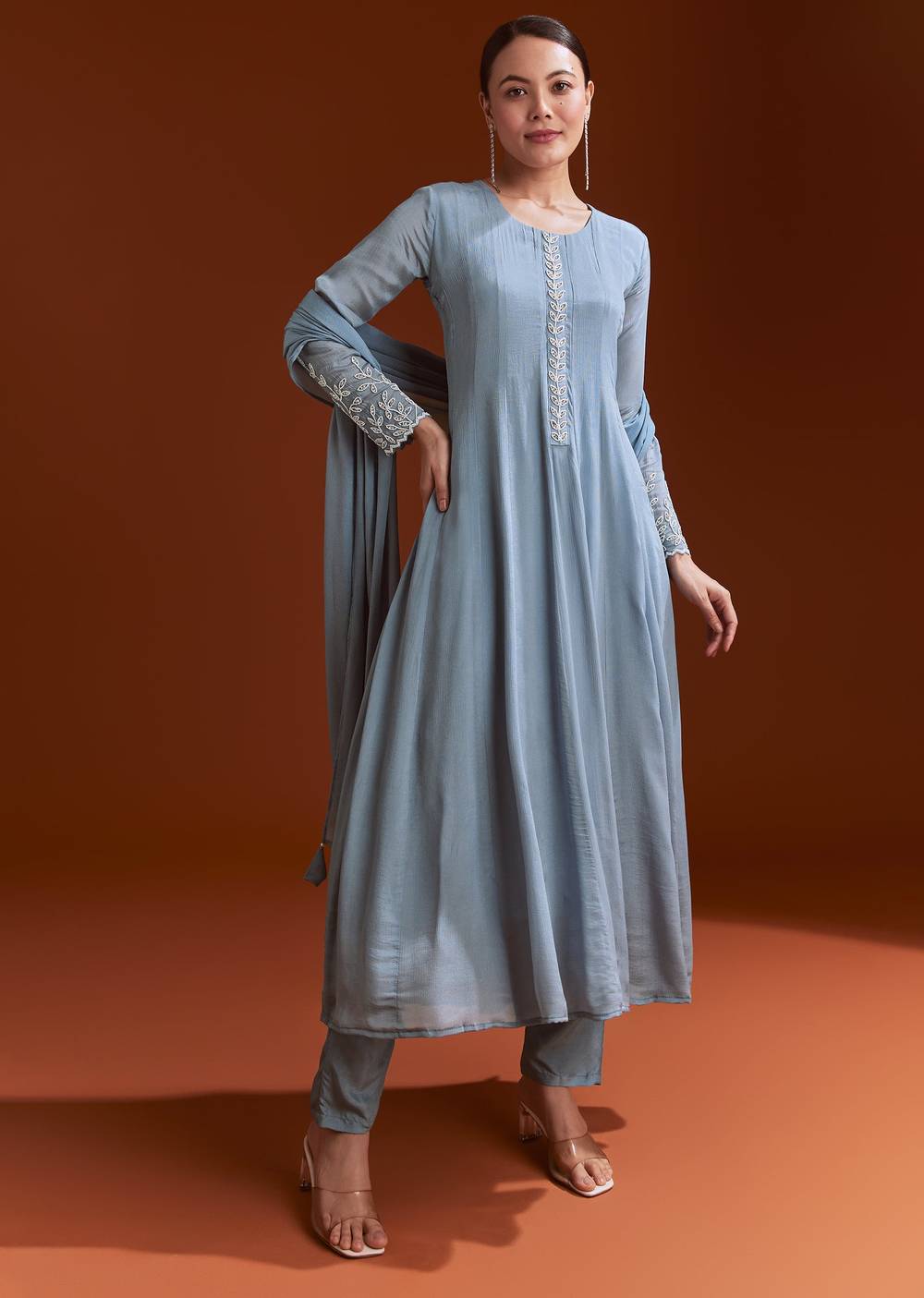 This misty blue Anarkali in chinon is highlighted with moti and stone embroidery on the neckline and sleeves. A serene choice for pooja rituals. Standard length for Anarkali is 48"... More Product Details