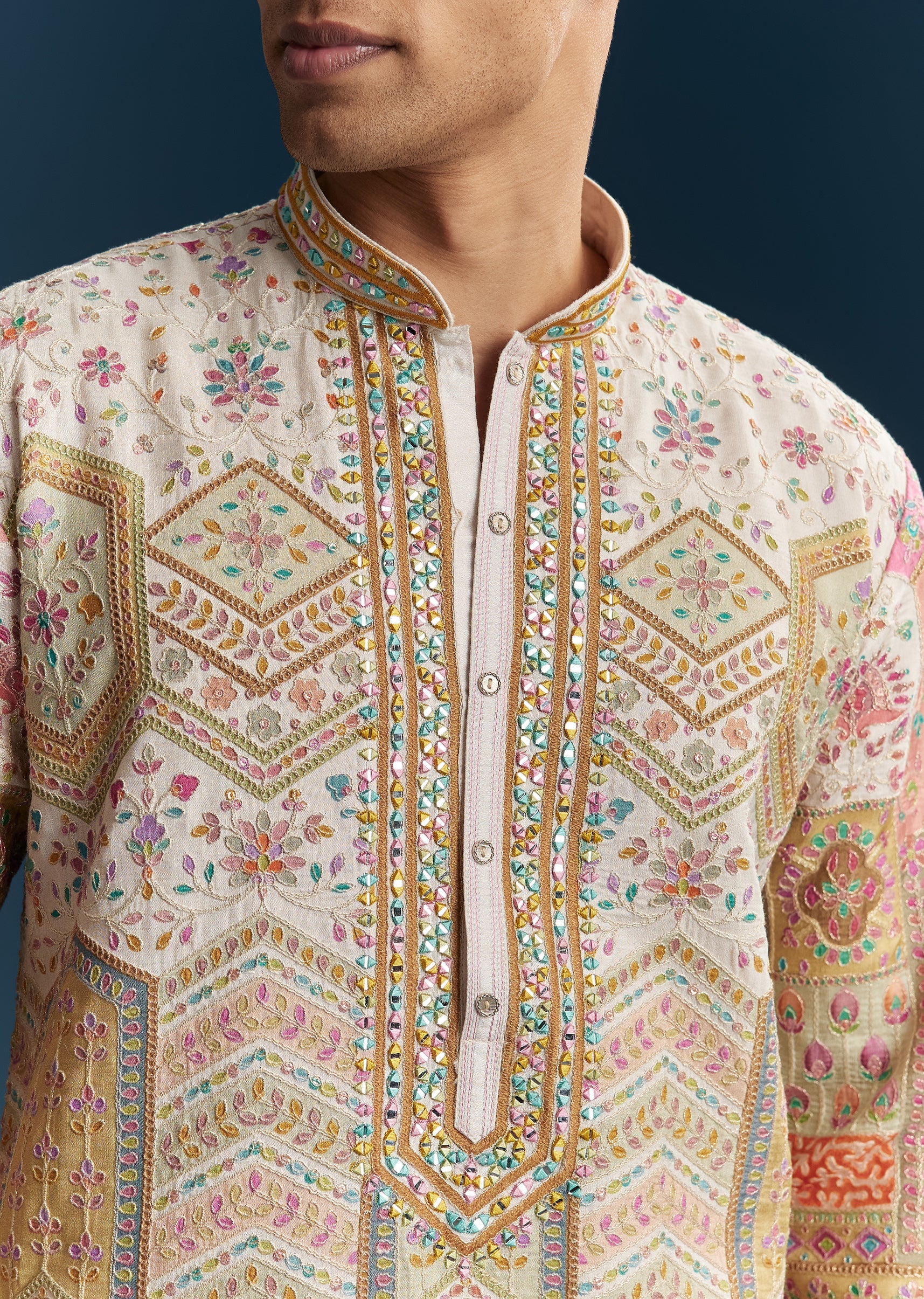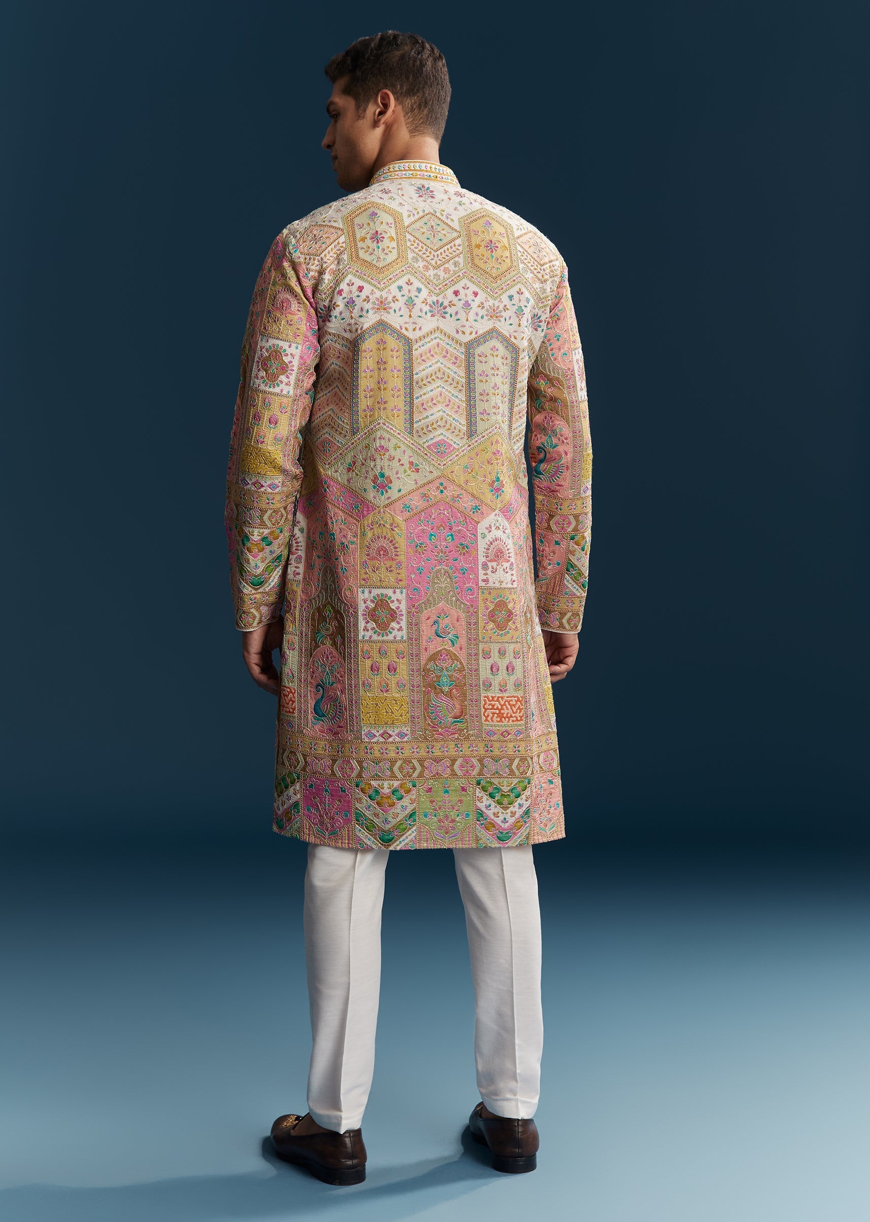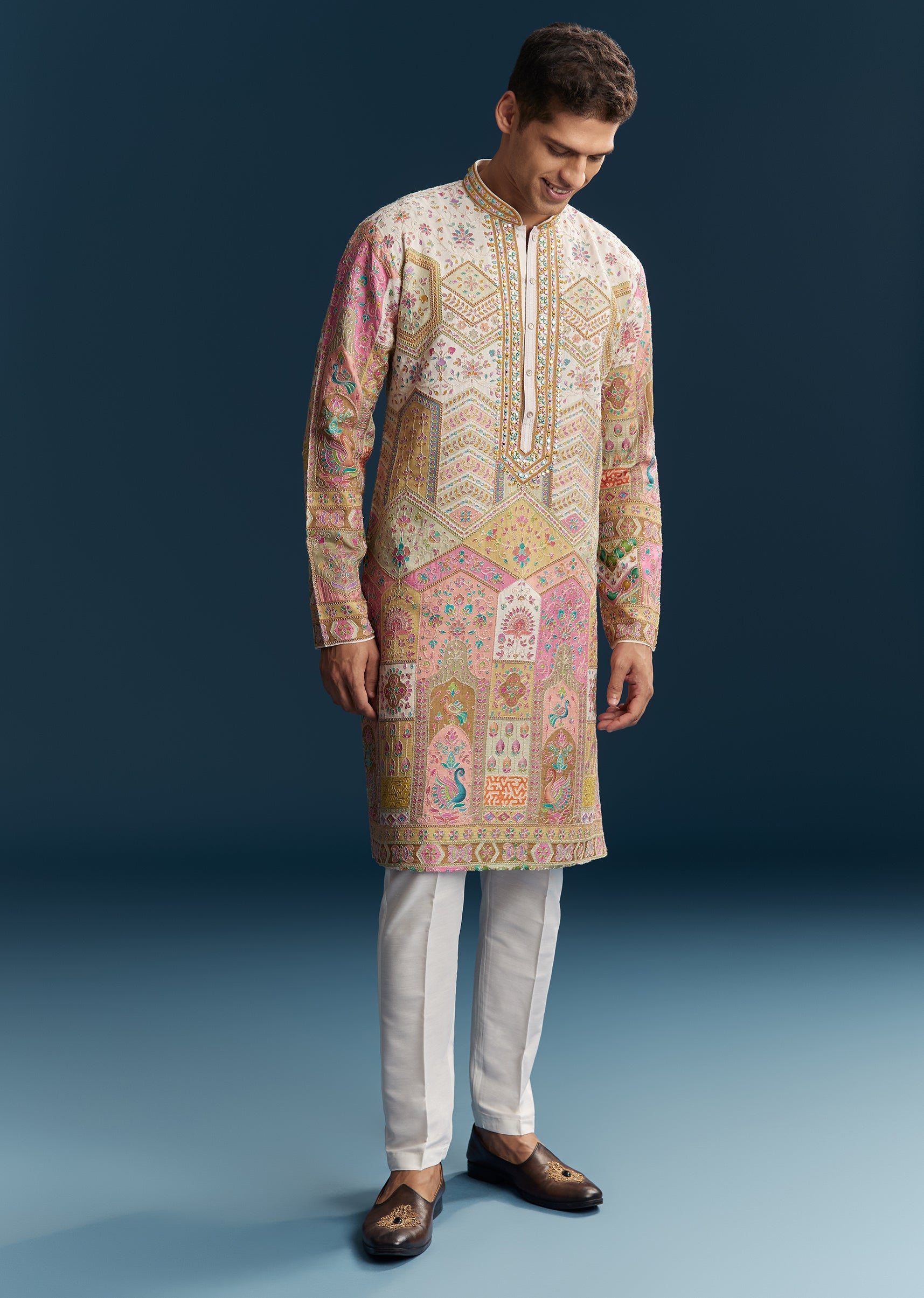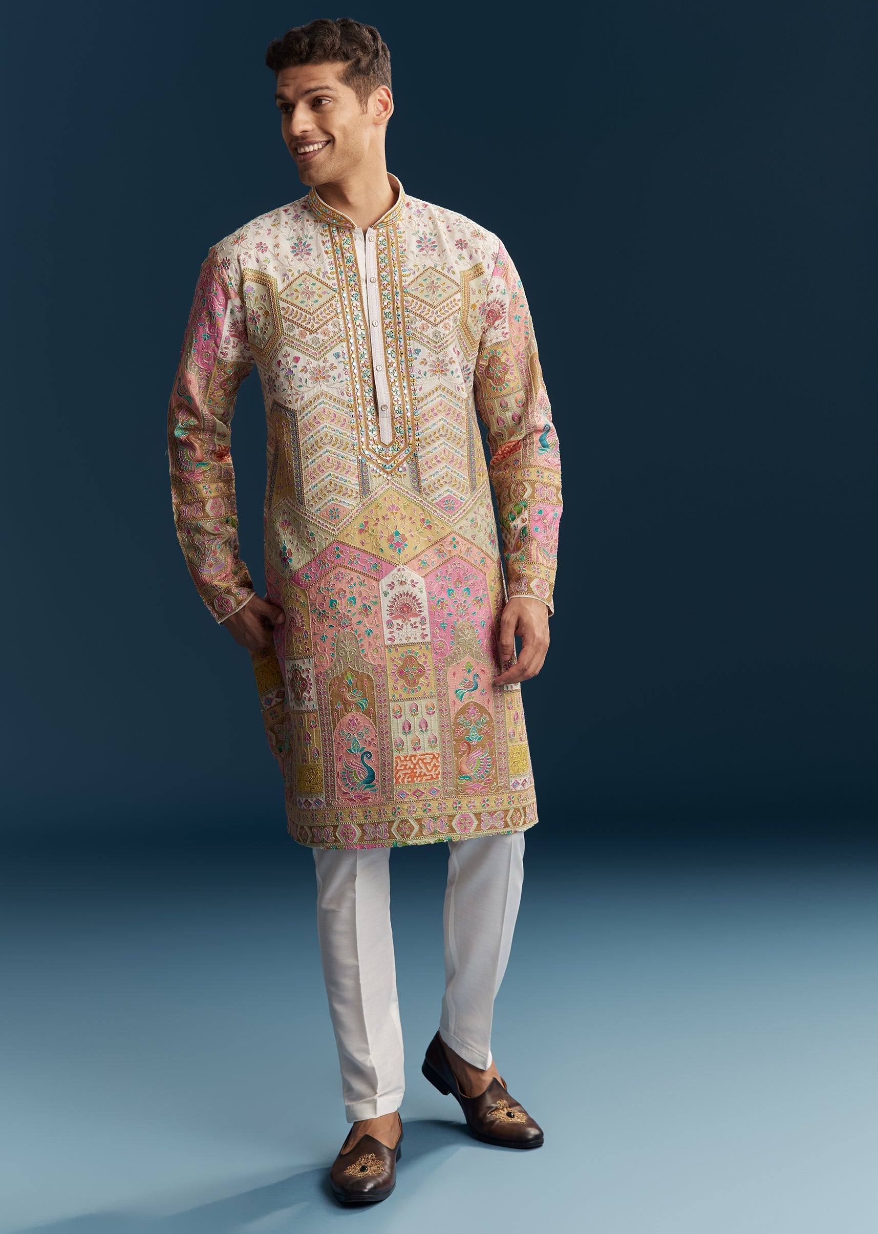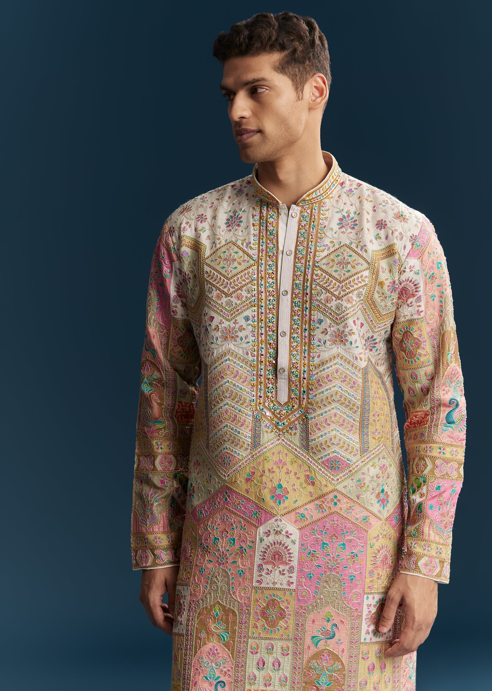 Vibrant and festive, this multi colored men’s kurta set in soft pastels is perfect for pooja, mehendi, and wedding celebrations. Crafted in smooth silk fabric, it features intricate thread work... More Product Details
