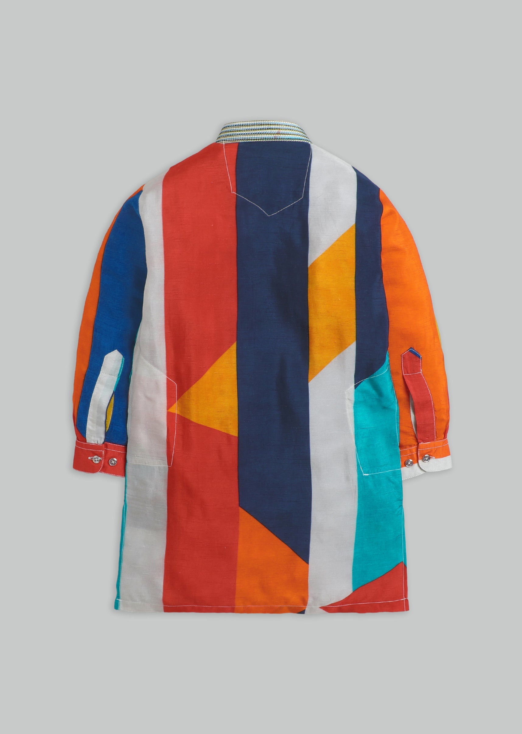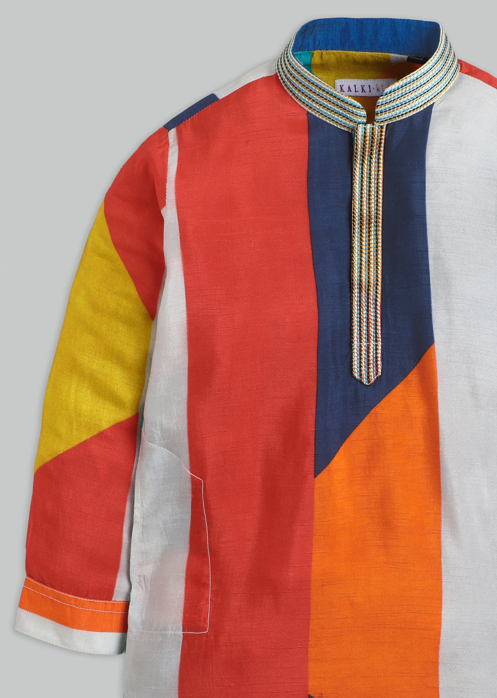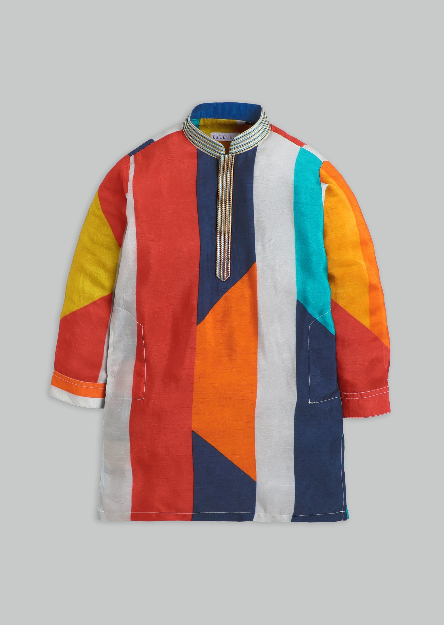 A cheerful cotton kurta set with bold colour-blocking, styled with a mandarin collar, 3/4th sleeves and button front. Comes with matching pants—made for festive photos and functions. Awarded as the... More Product Details