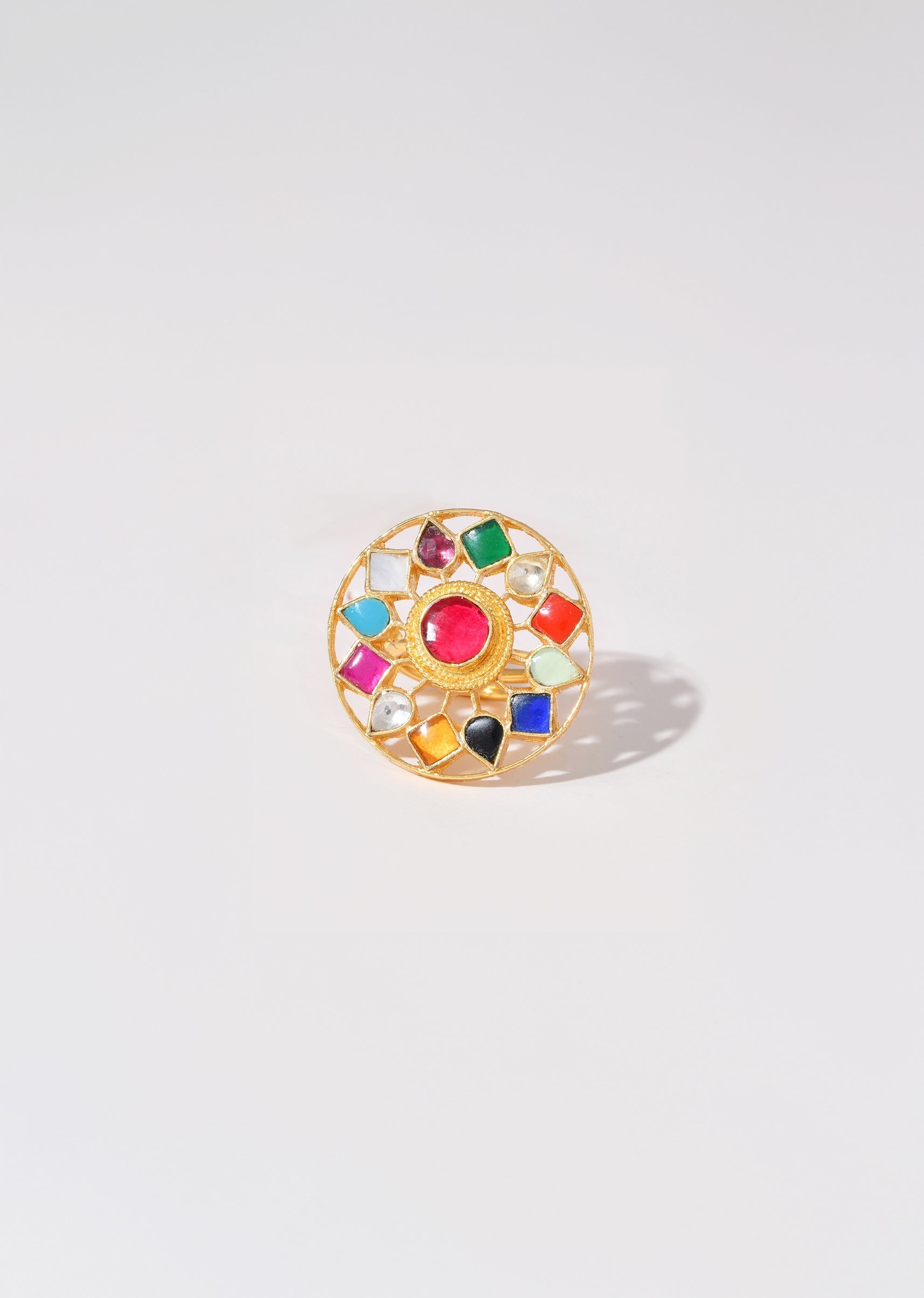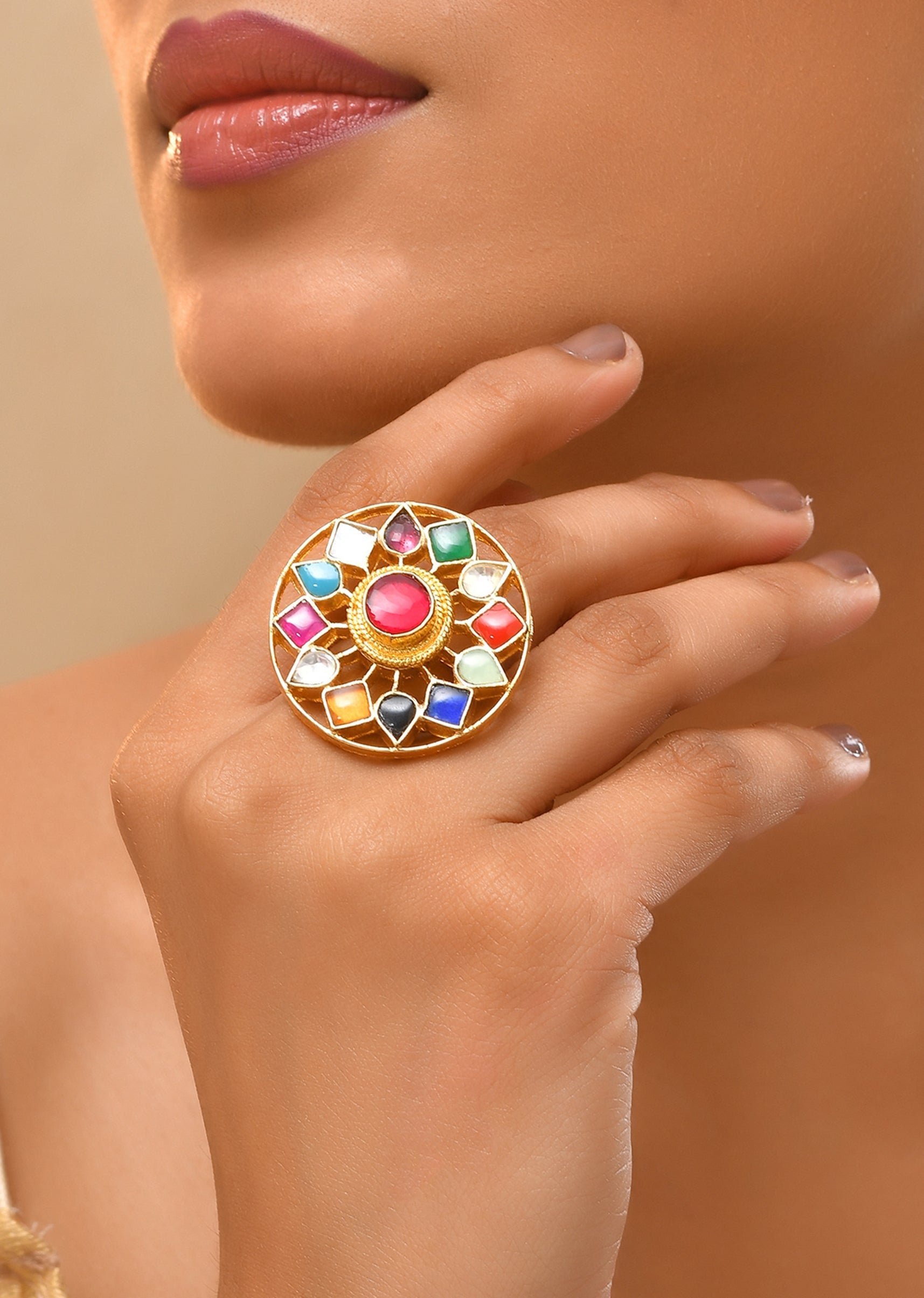 Add a vibrant touch to your look with this multi-tone kundan ring, featuring a mix of floral and geometric motifs for a striking, artistic finish. Perfect for festive occasions or statement styling, it brings color and charm to any traditional outfit.Awarded as the Most Trusted Brand, we're delivering styles you love, just as promised.