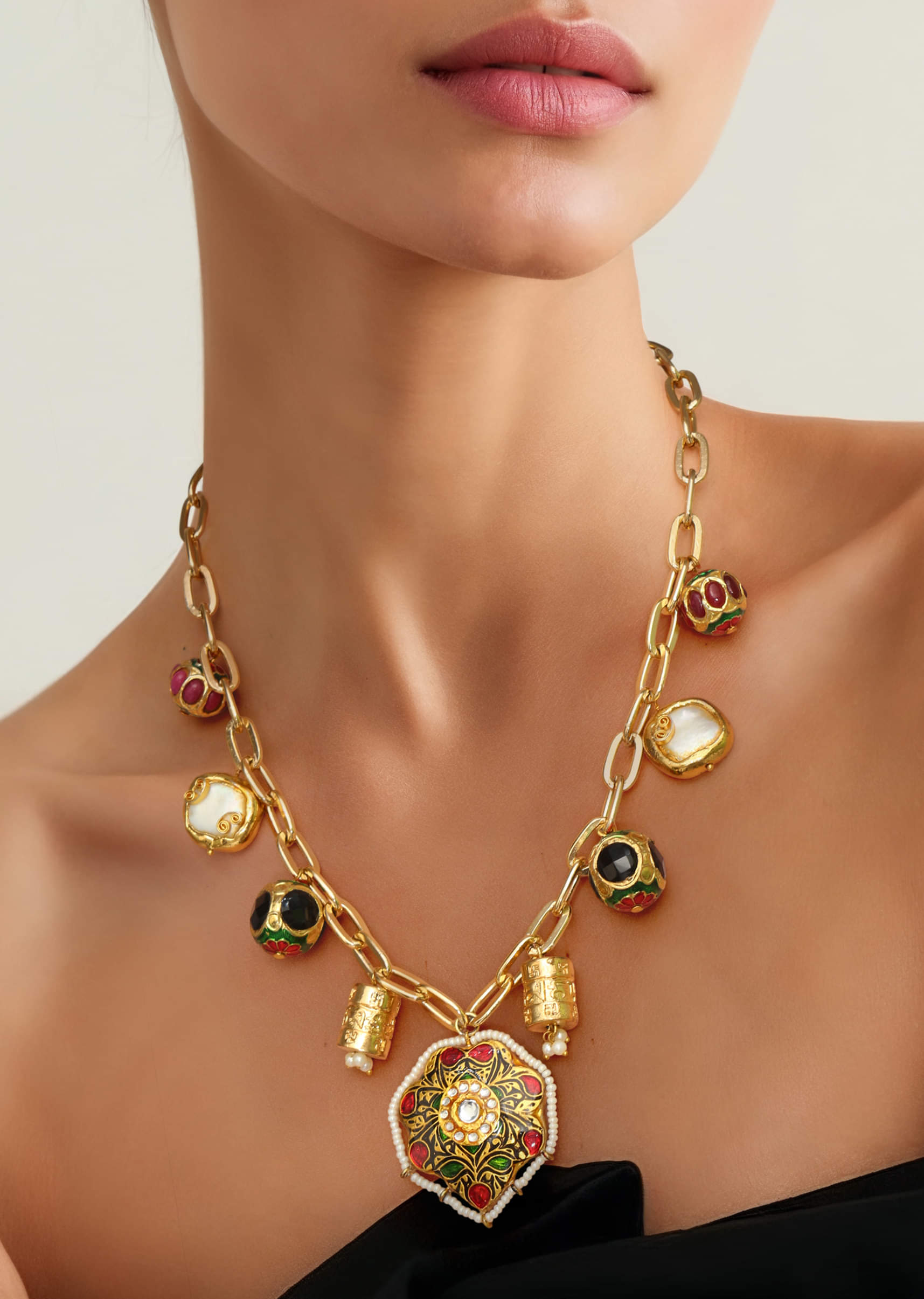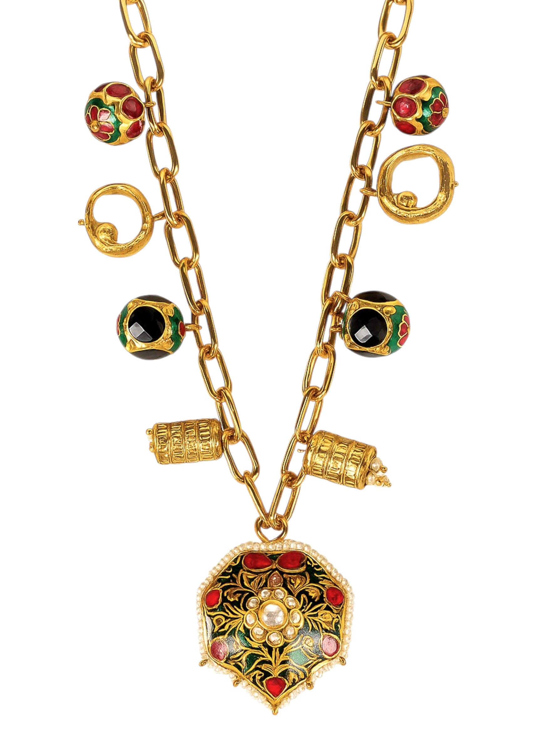 A multi fusion pendant drop necklace featuring a bold, intricately designed pendant with vibrant stones, blending contemporary style with traditional elegance. Perfect for adding a striking focal point to bridal,... More Product Details
