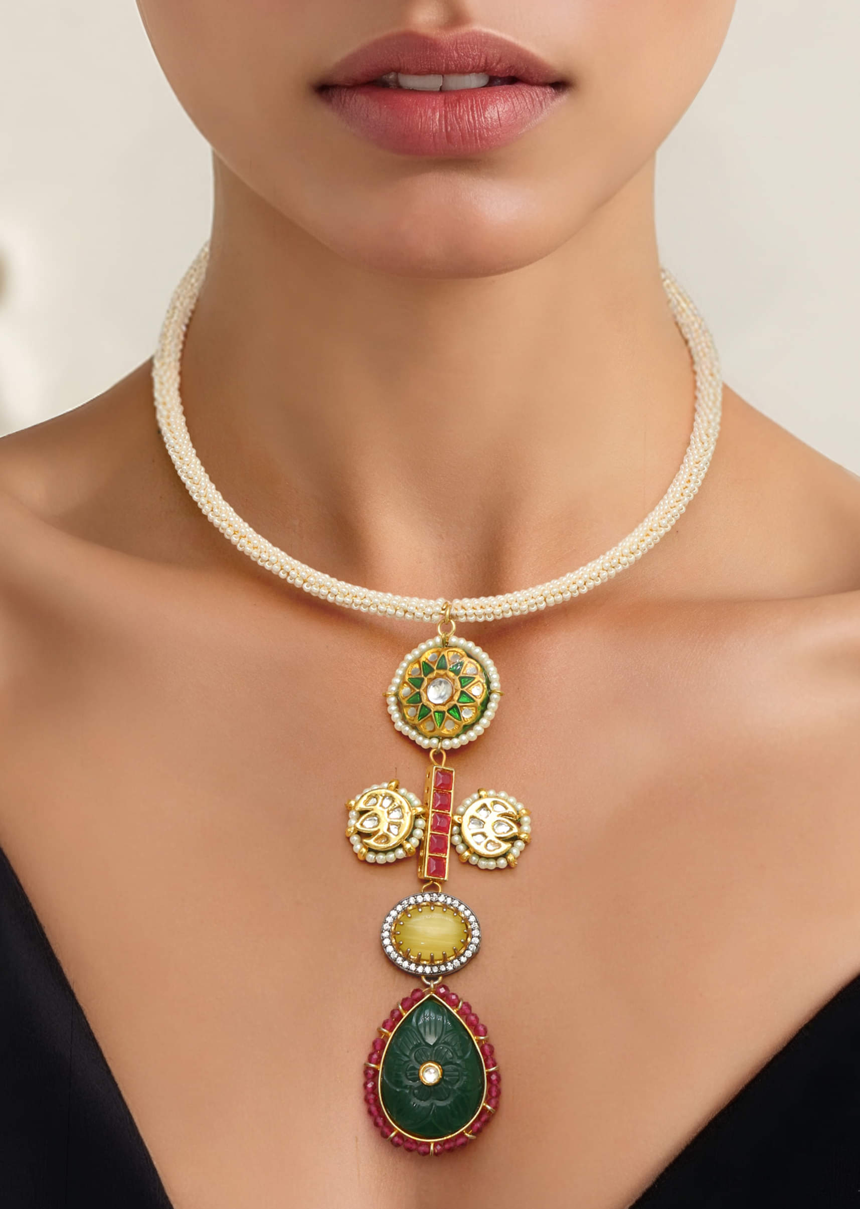 A multi fusion pendant necklace featuring a bold, intricately designed pendant with vibrant stones, blending traditional charm with contemporary elegance. Perfect for adding a striking focal point to bridal, festive, or ethnic ensembles.