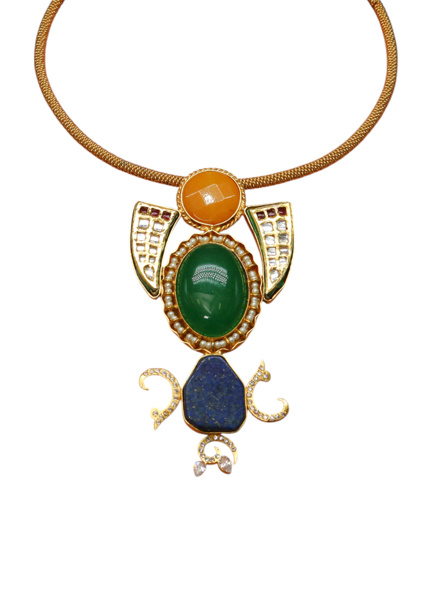 A multi fusion statement pendant necklace featuring a bold pendant with vibrant stones and intricate detailing, blending contemporary style with traditional elegance. Perfect for adding a striking focal point to bridal, festive, or ethnic ensembles.