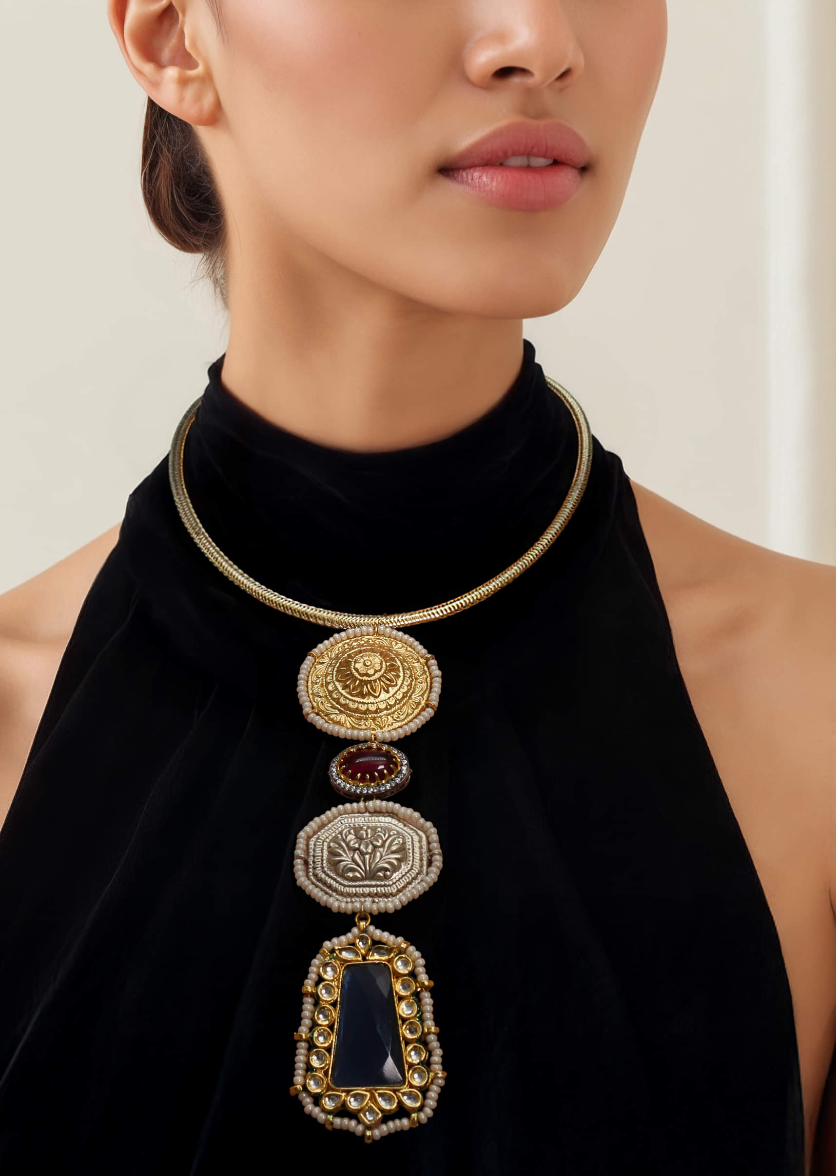 A multi fusion tiered oversized pendant necklace featuring layered designs with vibrant stones and intricate detailing, blending bold contemporary style with traditional elegance. Perfect for adding a statement-making touch to bridal, festive, or ethnic ensembles.