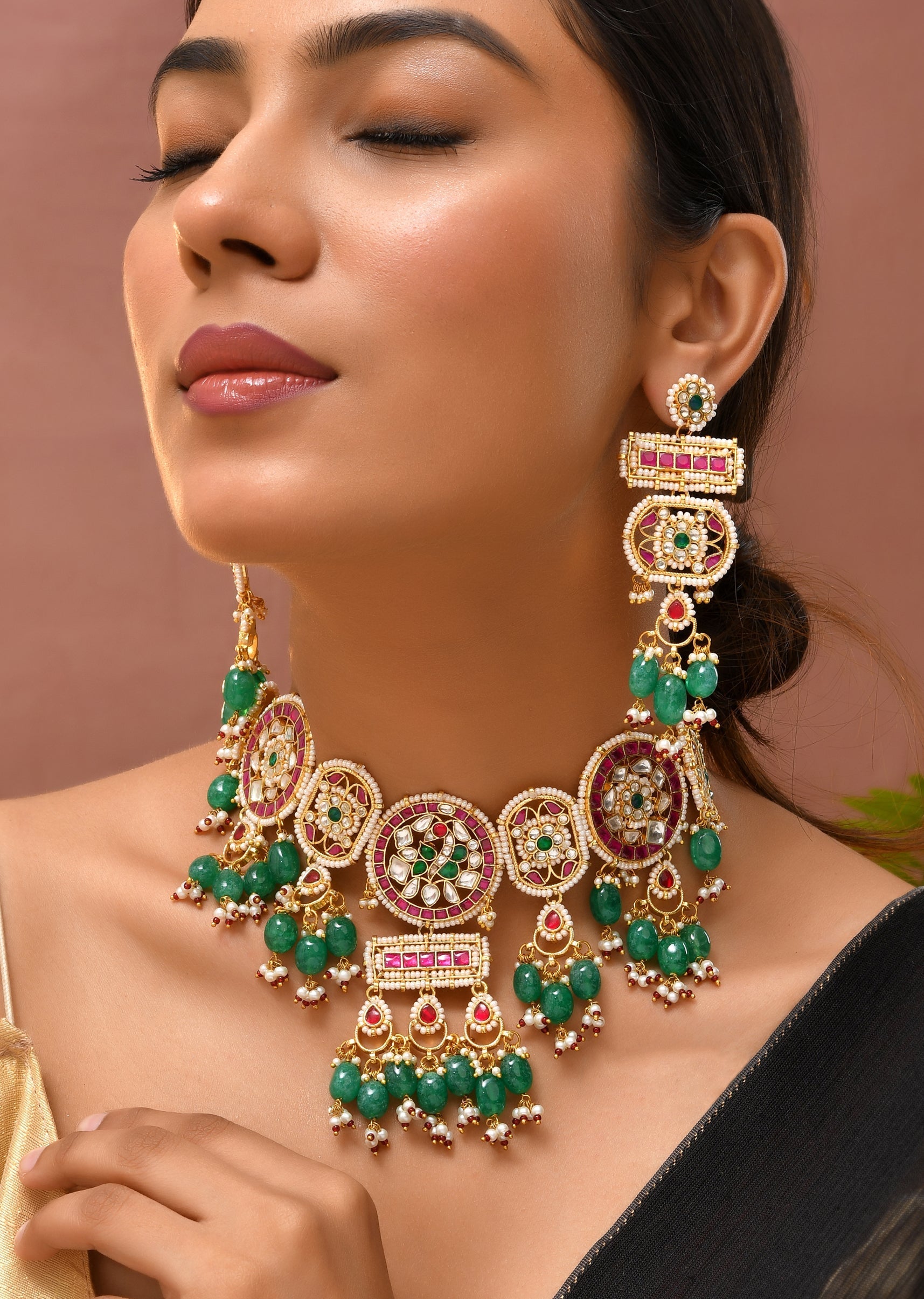 Add vibrant elegance to your festive look with this multi-tone kundan necklace and earrings set, featuring delicate bead drops for a graceful finish. Perfect for weddings or celebrations, it brings... More Product Details