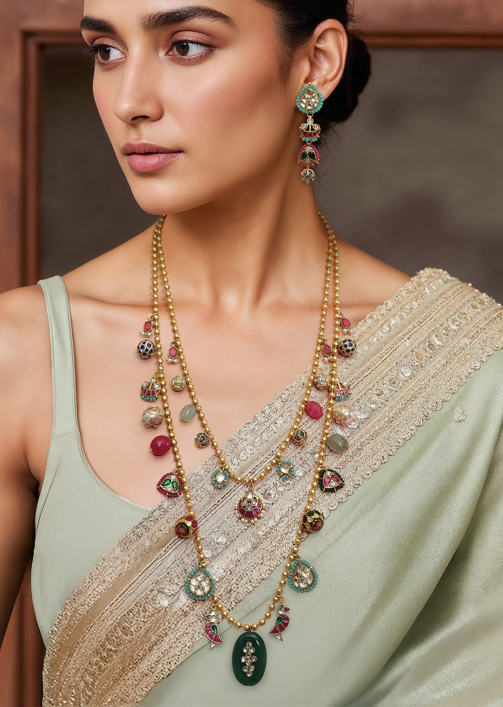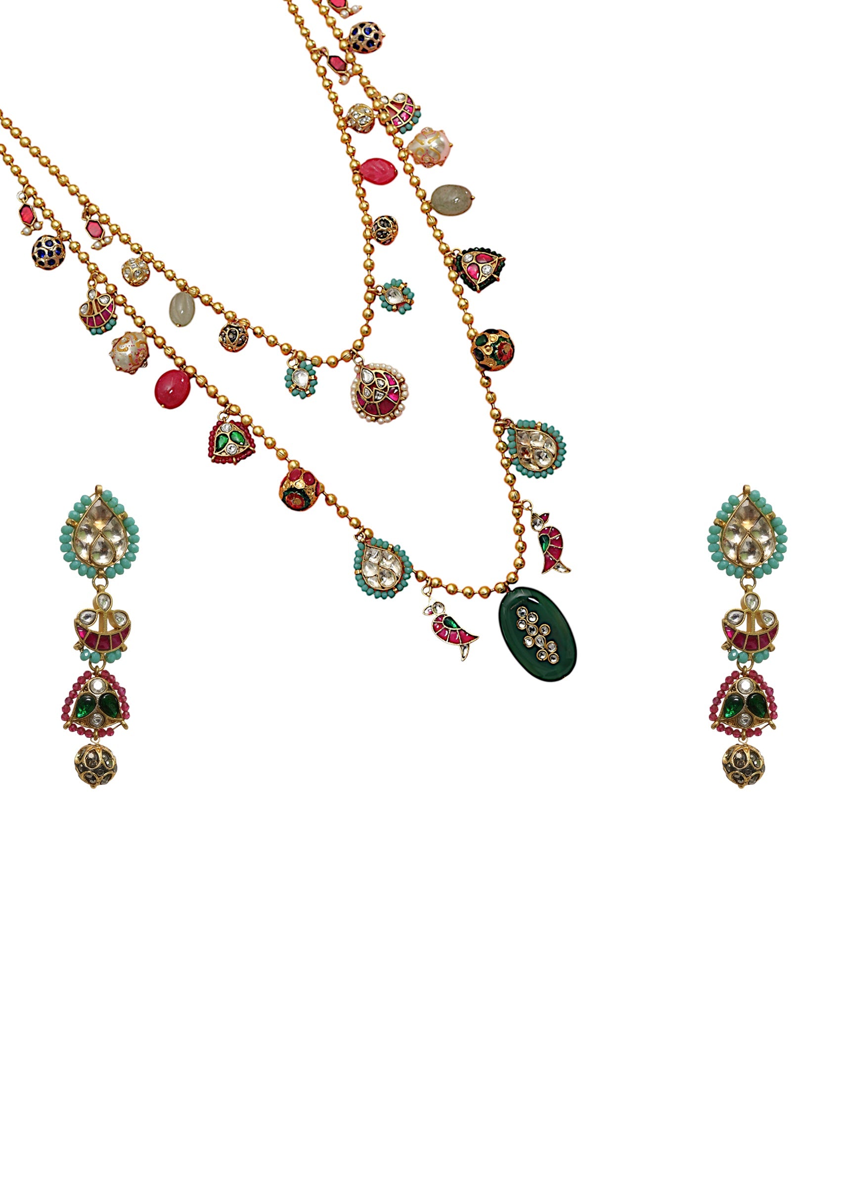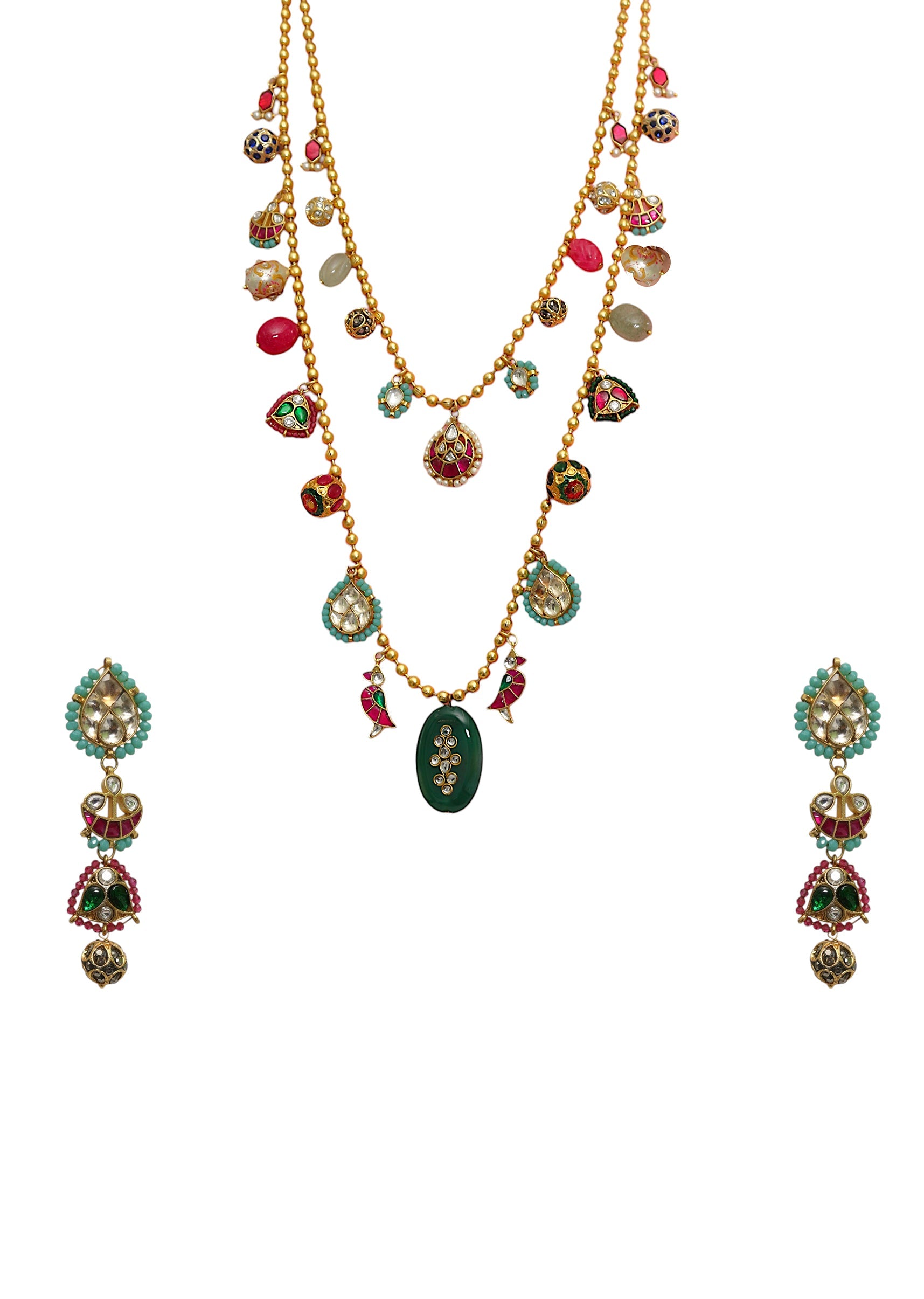 A multi layered fusion stone drop necklace and earring set featuring cascading layers of vibrant stones with intricate detailing, blending modern design with traditional elegance. Perfect for adding a bold and radiant touch to bridal, festive, or ethnic ensembles.