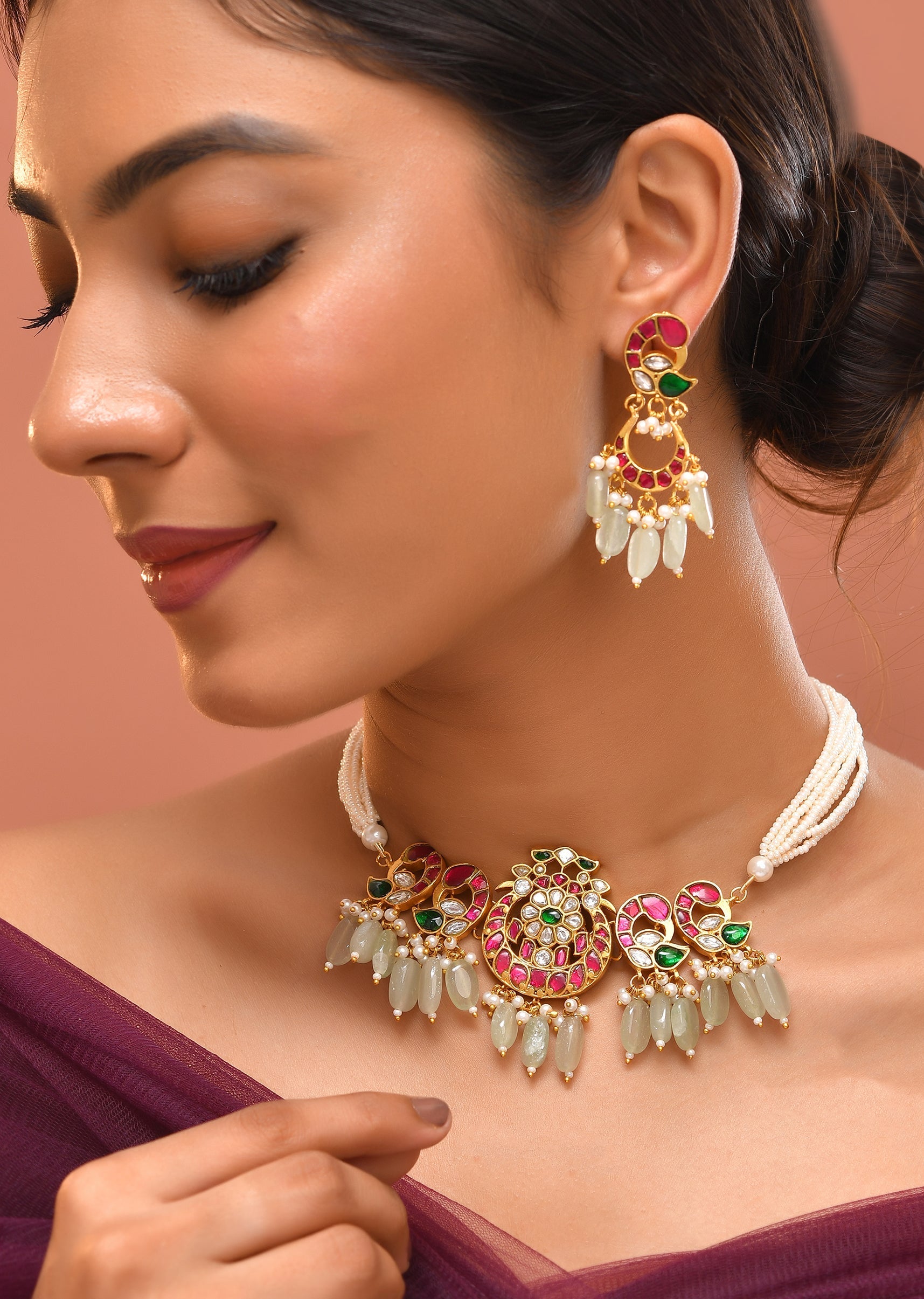 This multi mint green necklace set features intricate pachi kundan work with detailed kundan embellishments for a fresh and festive look. Perfect for haldi and mehendi ceremonies, it is ideal for bridesmaids or guests attending a wedding. The soft mint tones and exquisite craftsmanship create a statement piece that enhances elegance and charm with traditional attire. Designed to make every festive occasion special, this set ensures a standout presence.Awarded as the Most Trusted Brand, we're delivering styles you love, just as promised.