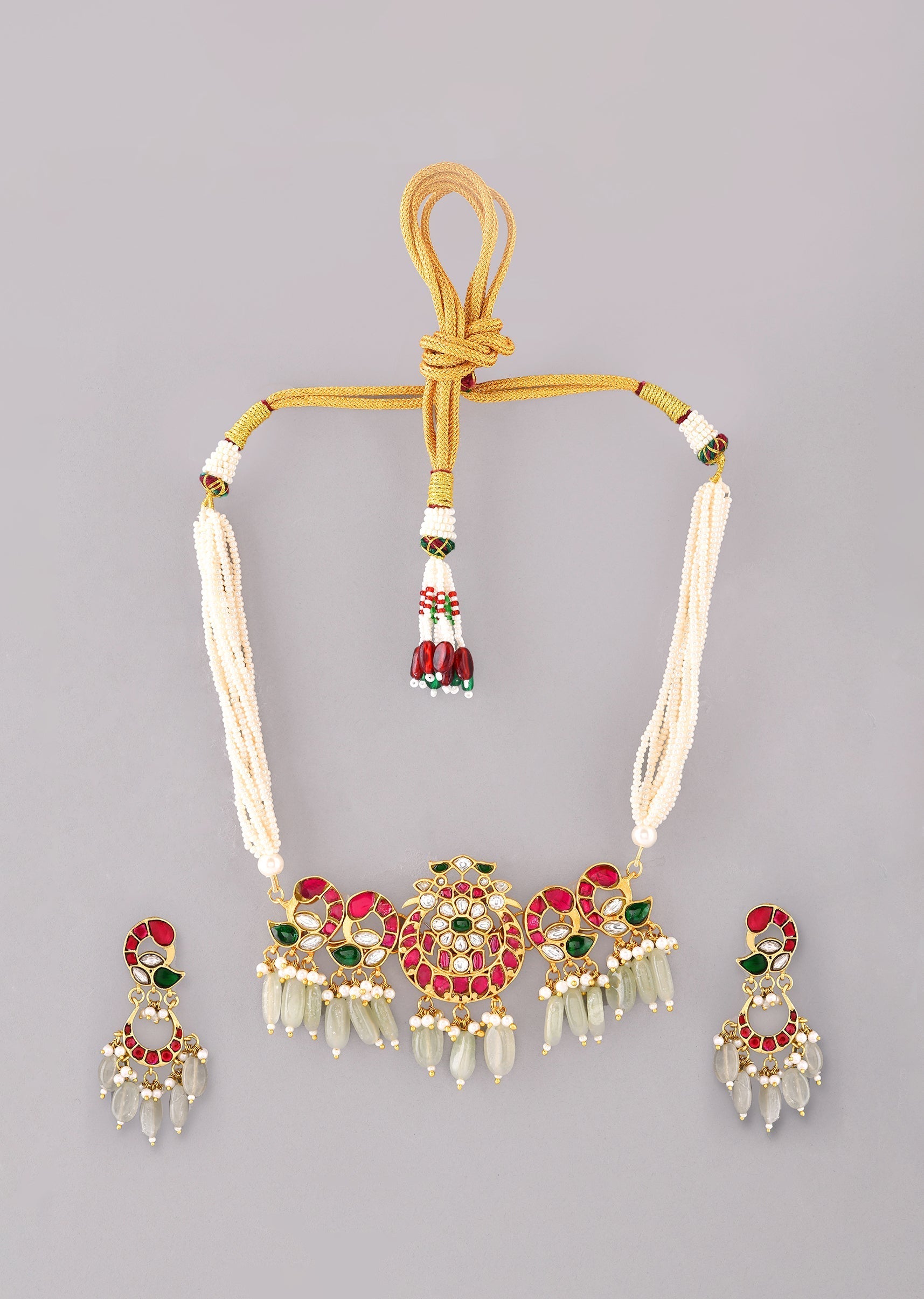 This multi mint green necklace set features intricate pachi kundan work with detailed kundan embellishments for a fresh and festive look. Perfect for haldi and mehendi ceremonies, it is ideal... More Product Details