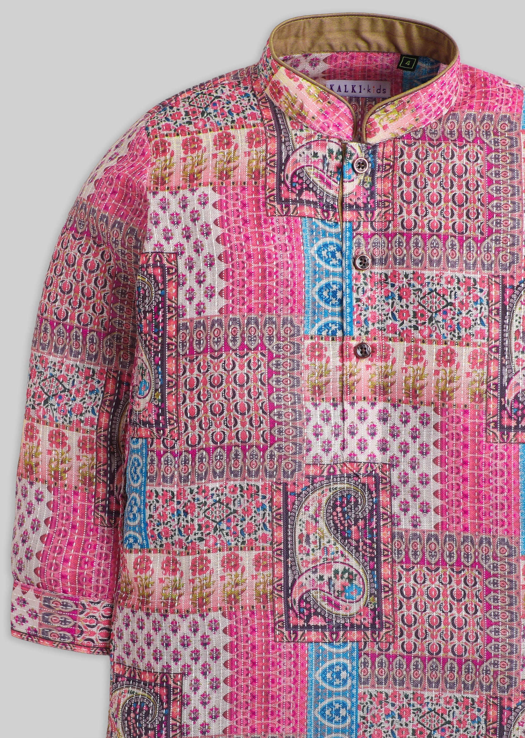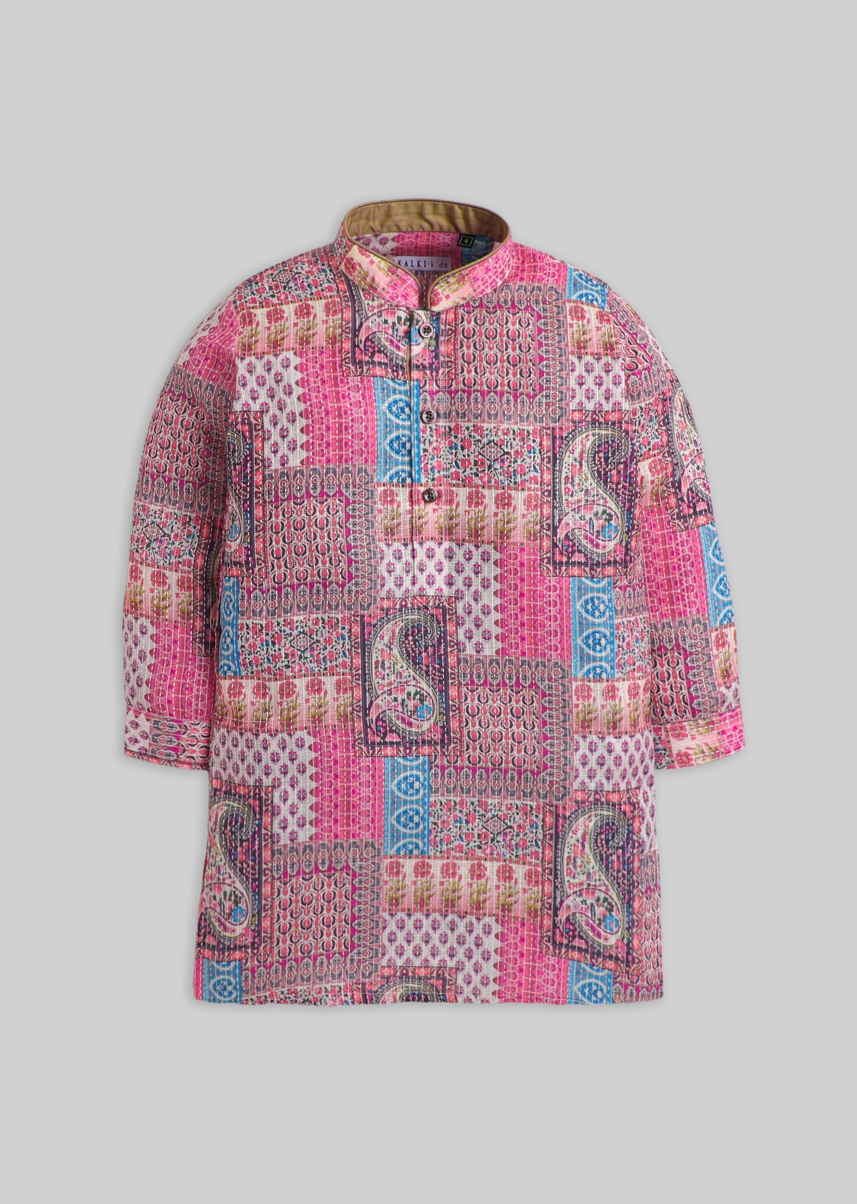 A playful cotton kurta set with a mix of paisley and geometric prints, styled with a mandarin collar and button placket. Comes with matching pants—made for all-day festive comfort. Awarded... More Product Details