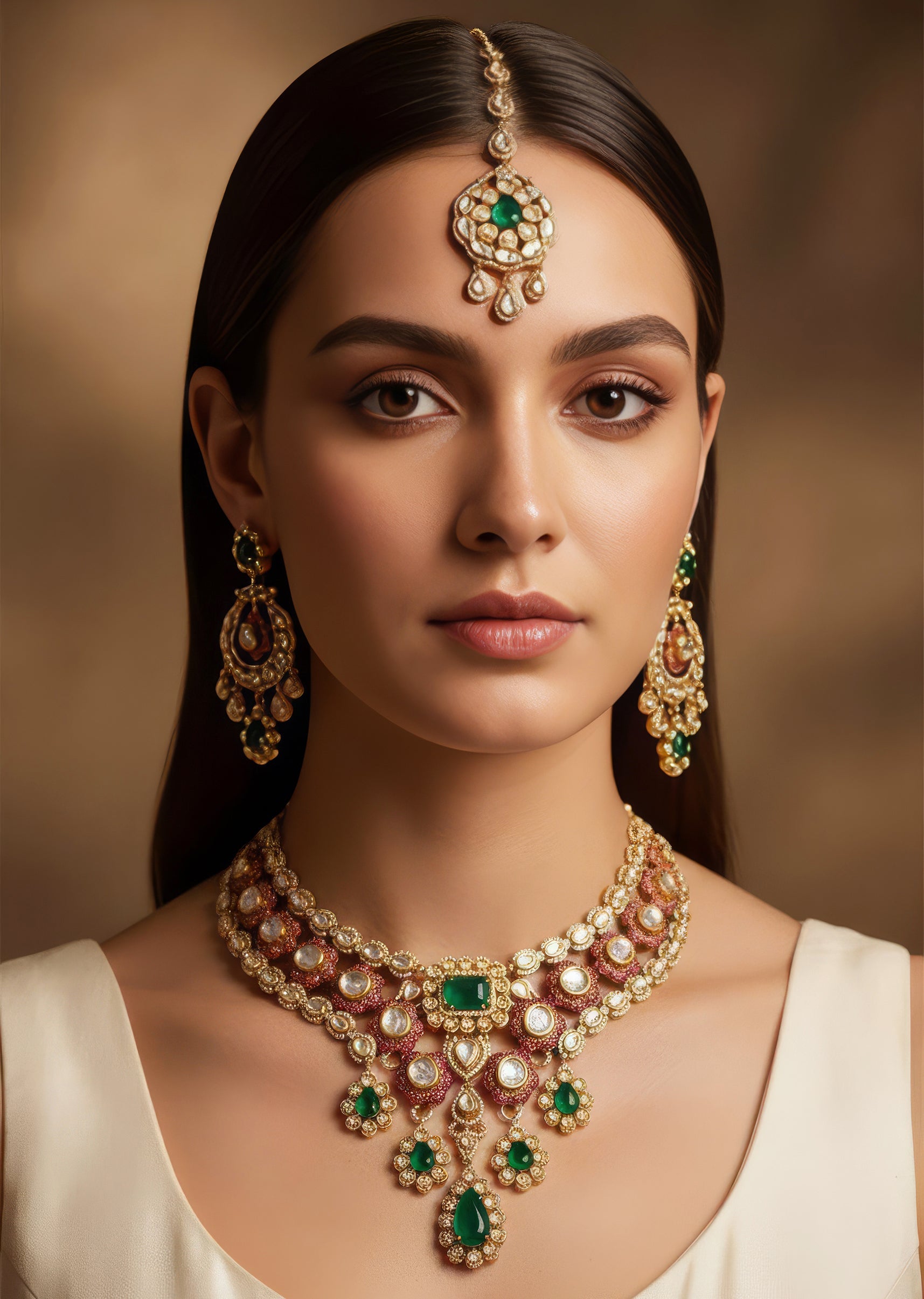 This statement necklace set features the use of Polki uncut diamonds set in traditional Kundan and Jadau craftsmanship with semi precious stones in rich red tones. Handcrafted Indian jewelry that blends royal heritage with festive elegance and refined detailing.