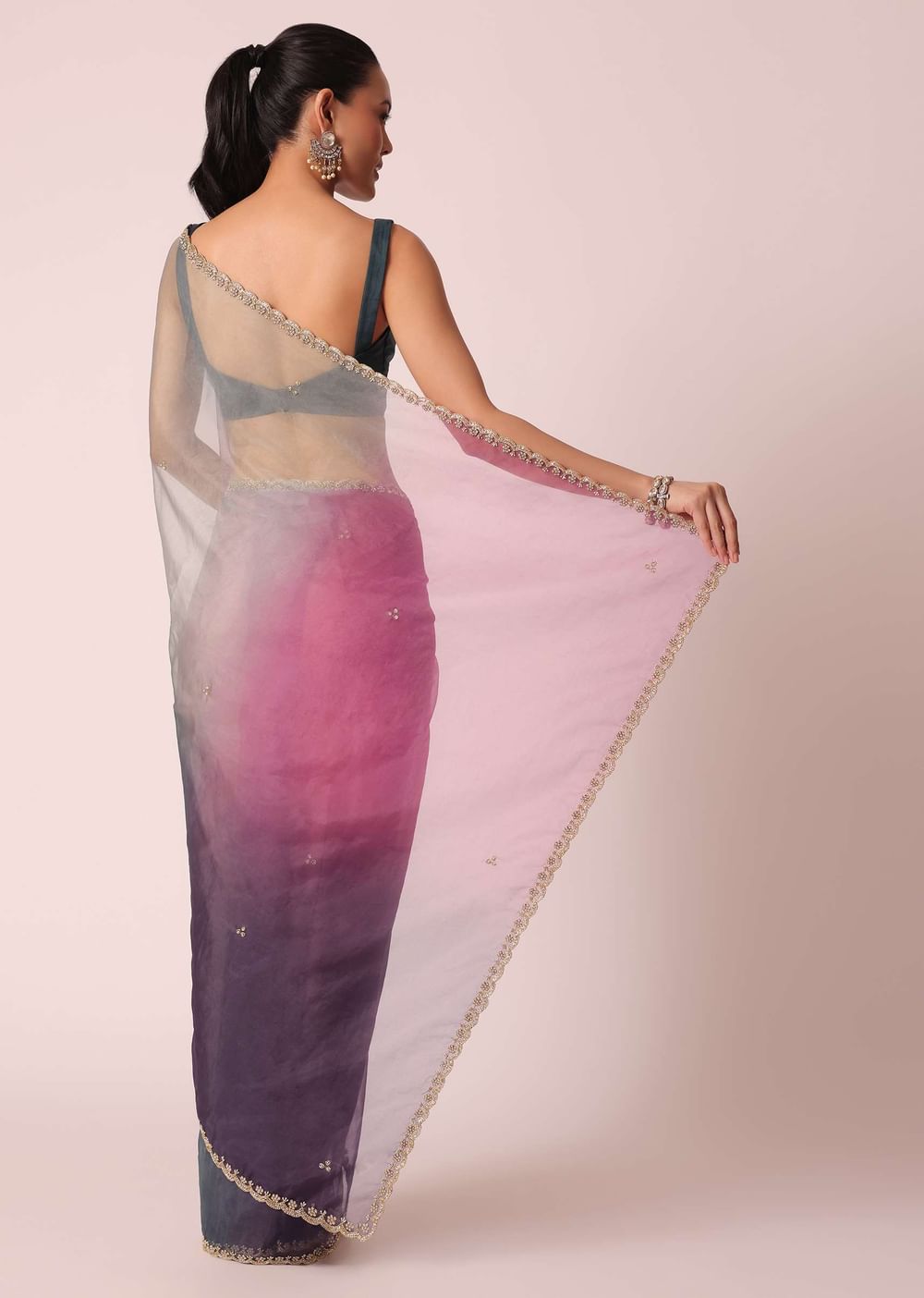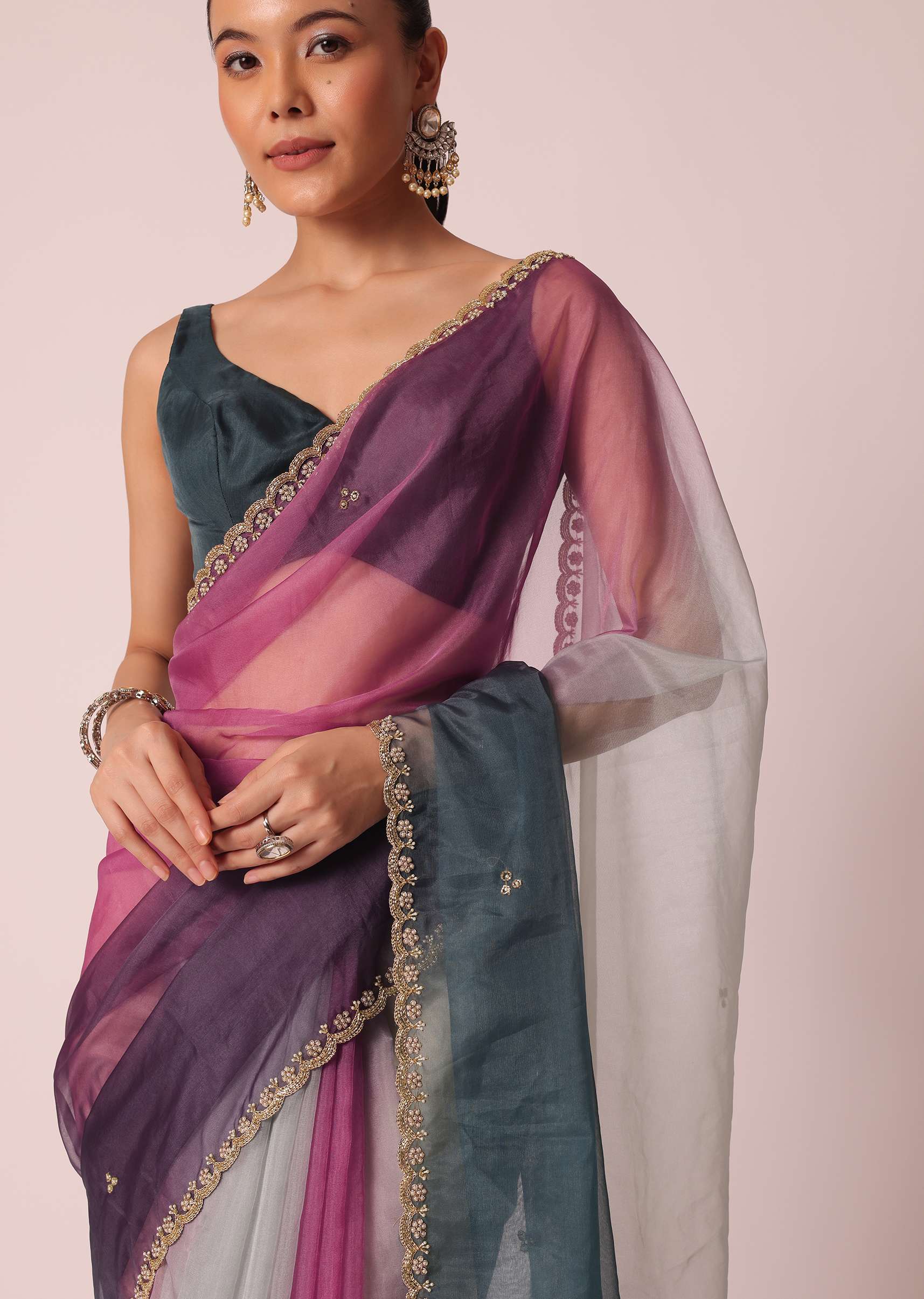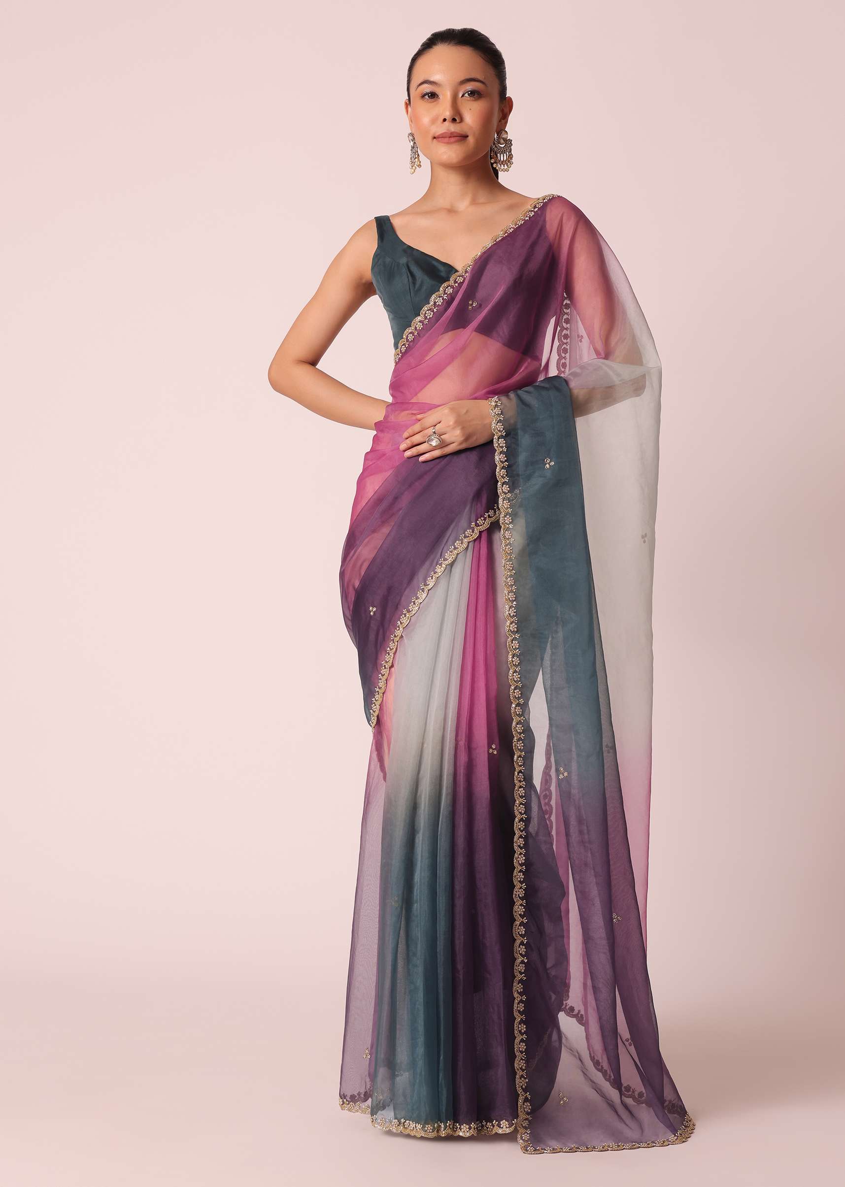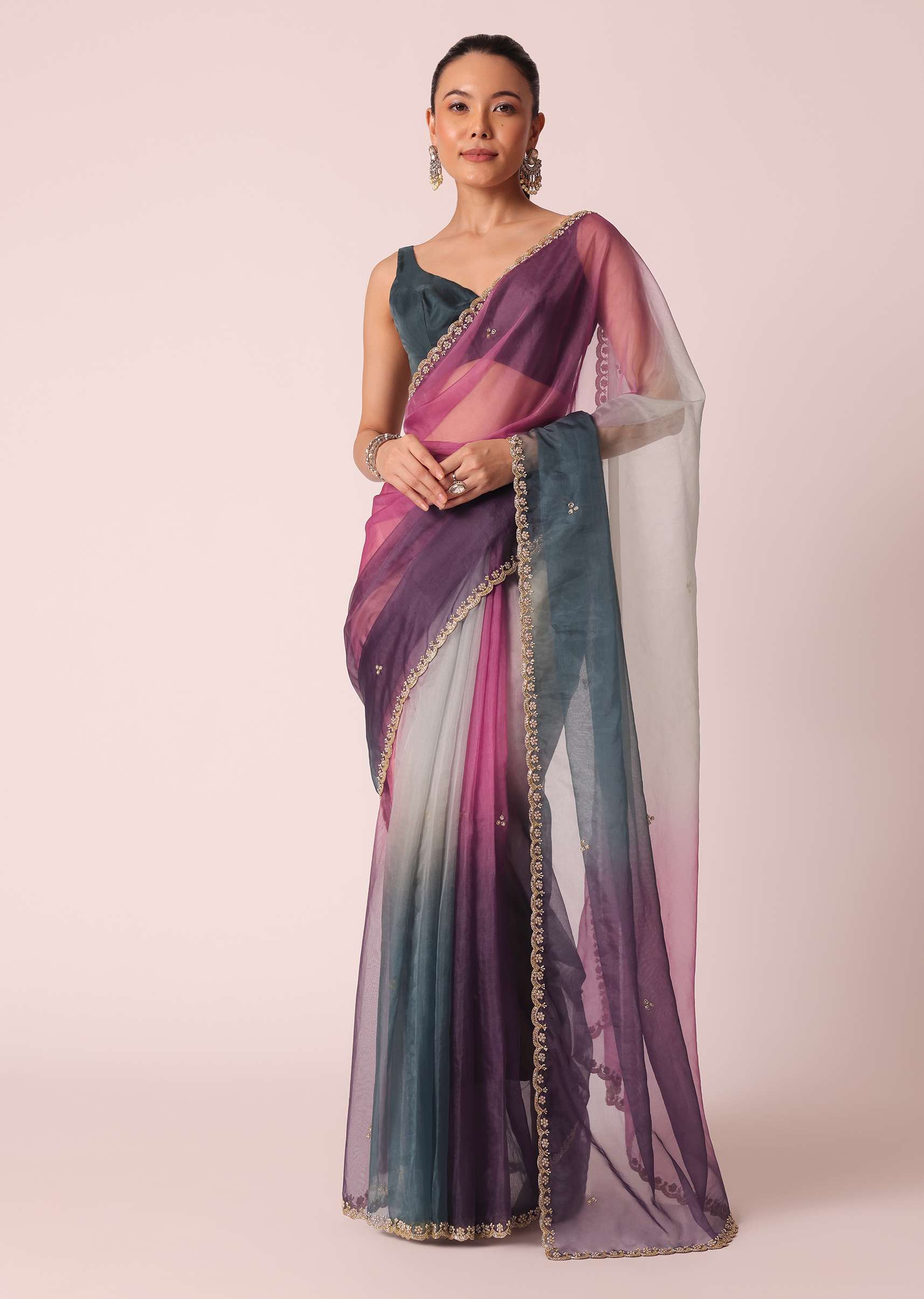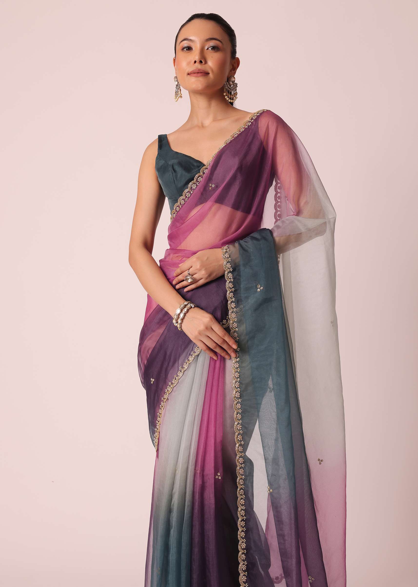 Wrap yourself this festive season in this beautiful ombre shaded saree. Featuring multi-hues, on a sheer organza base. It comes enhanced with intricate cutdana glistenings and scallop cutwork border. Perfect to strike a fashionable pose, it comes with an unstitched blouse piece. Awarded As The Most Trusted Brand We'Re Delivering Styles You Love Just As Promised.