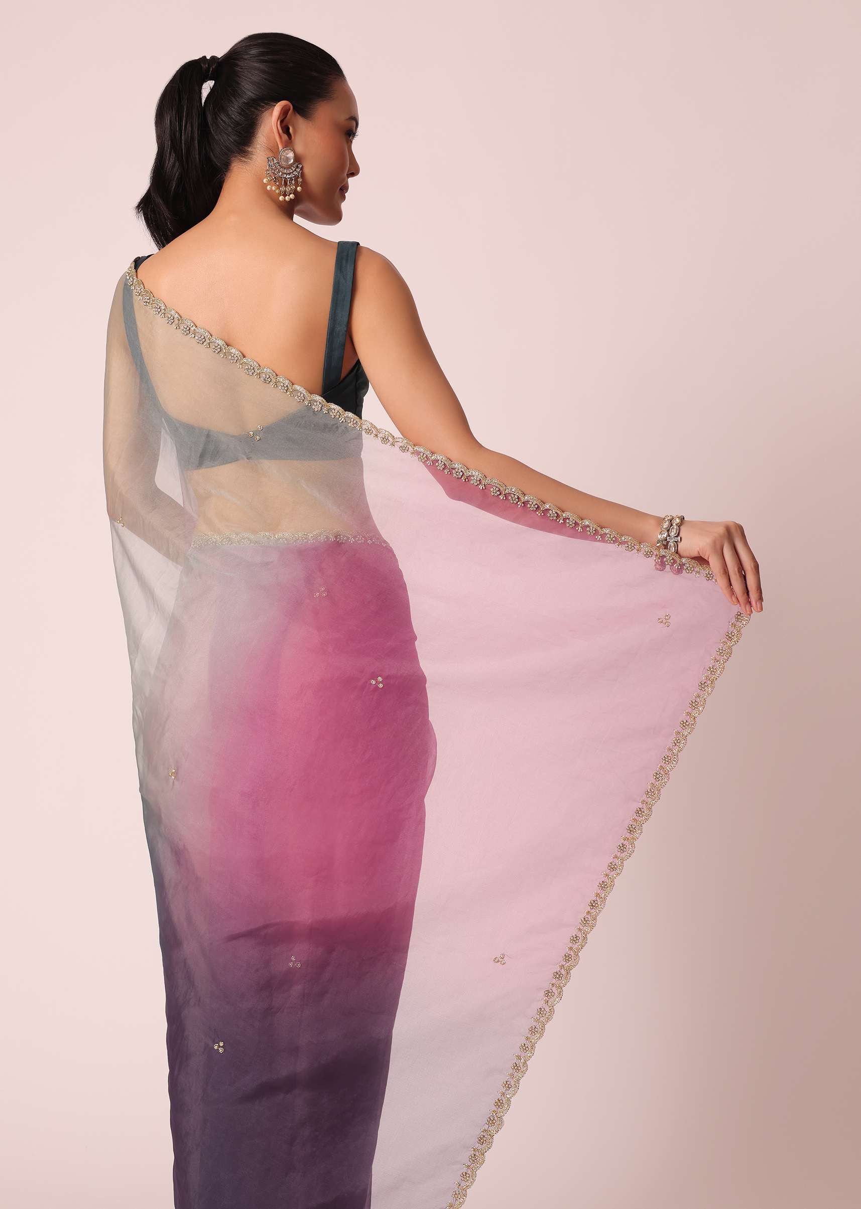 Wrap yourself this festive season in this beautiful ombre shaded saree. Featuring multi-hues, on a sheer organza base. It comes enhanced with intricate cutdana glistenings and scallop cutwork border. Perfect... More Product Details