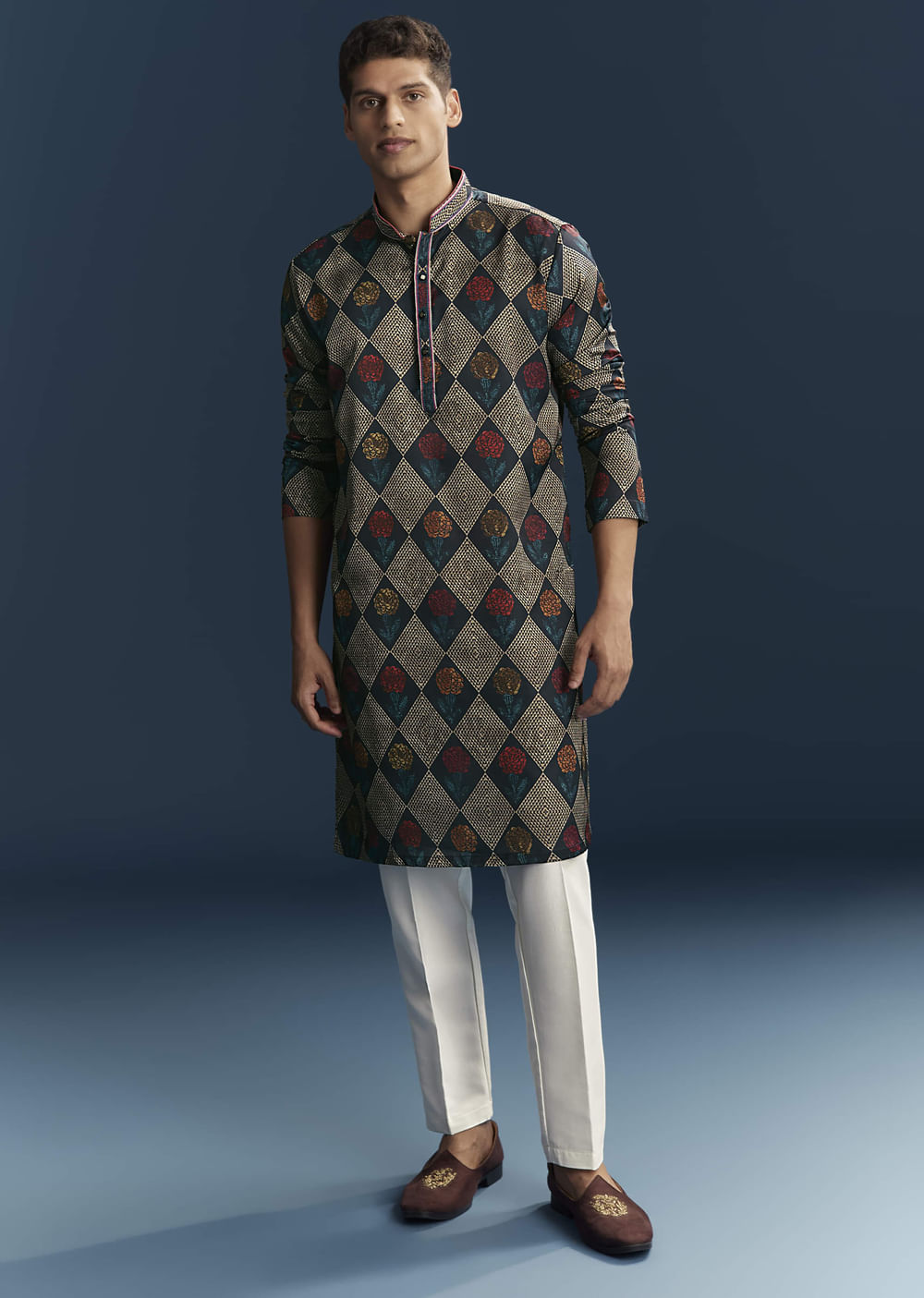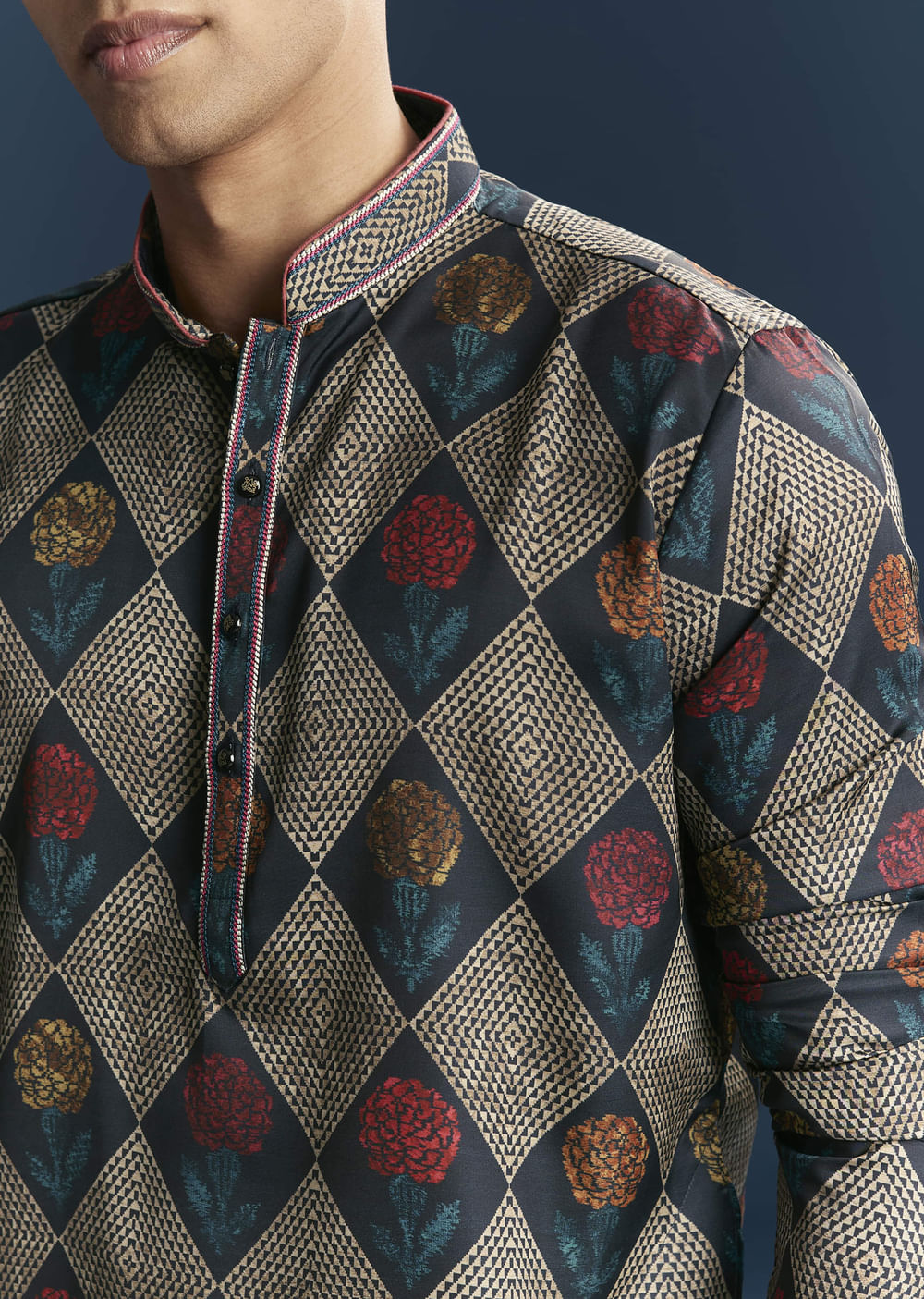 Festive and graphic, this multicolour art silk men’s kurta comes with diamond, geometric and floral prints that bring statement energy to your rotation. The bold geometric laced print balances heritage... More Product Details