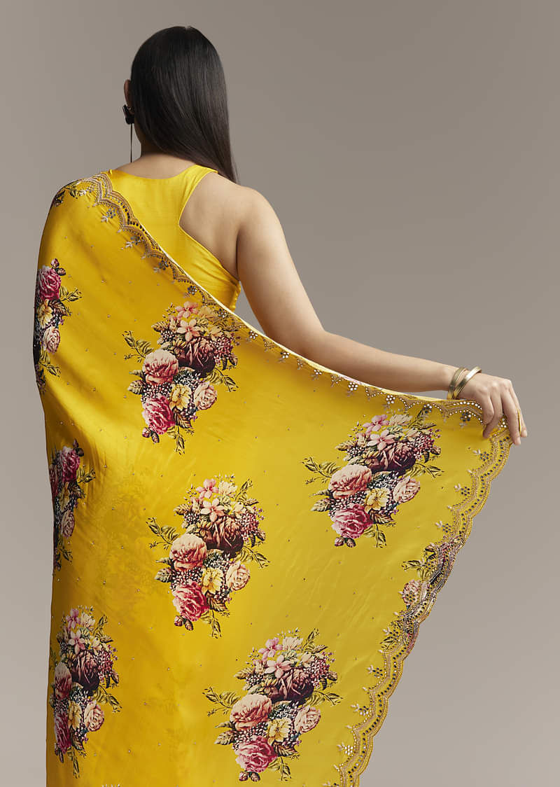 A mustard crepe saree adorned with lively digital floral prints, sequins, and mirror work along a scalloped border—made for festive flair. Awarded as the Most Trusted Brand, we're delivering styles you love, just as promised.