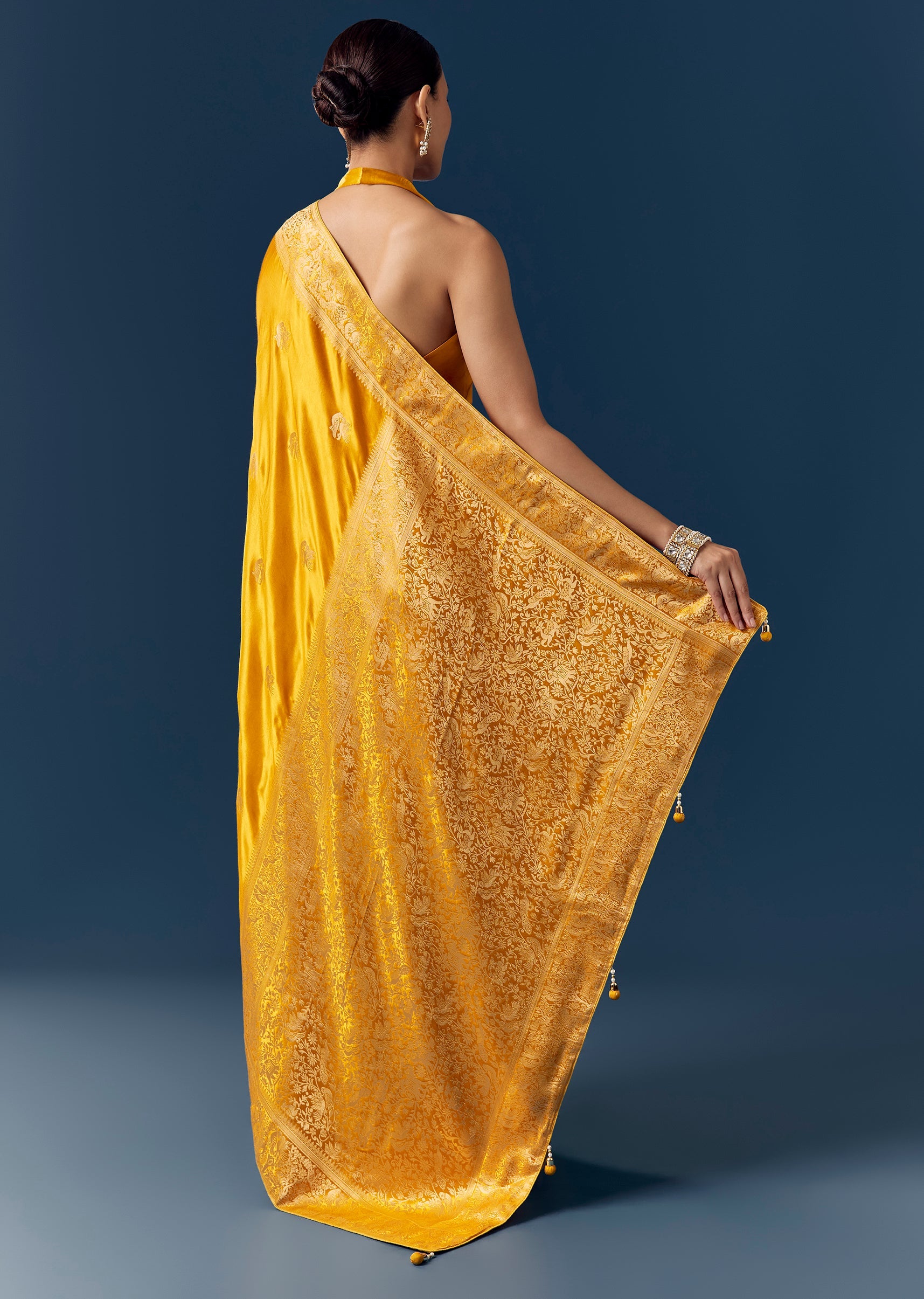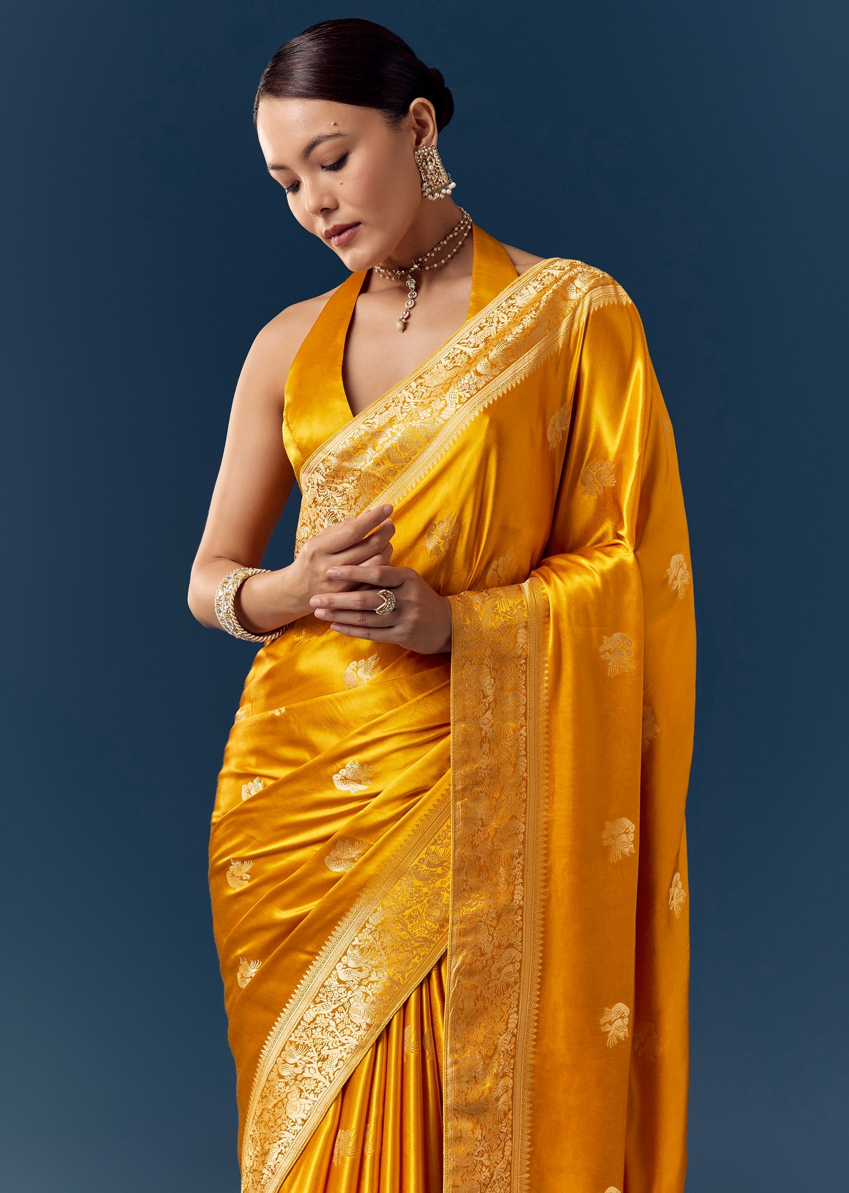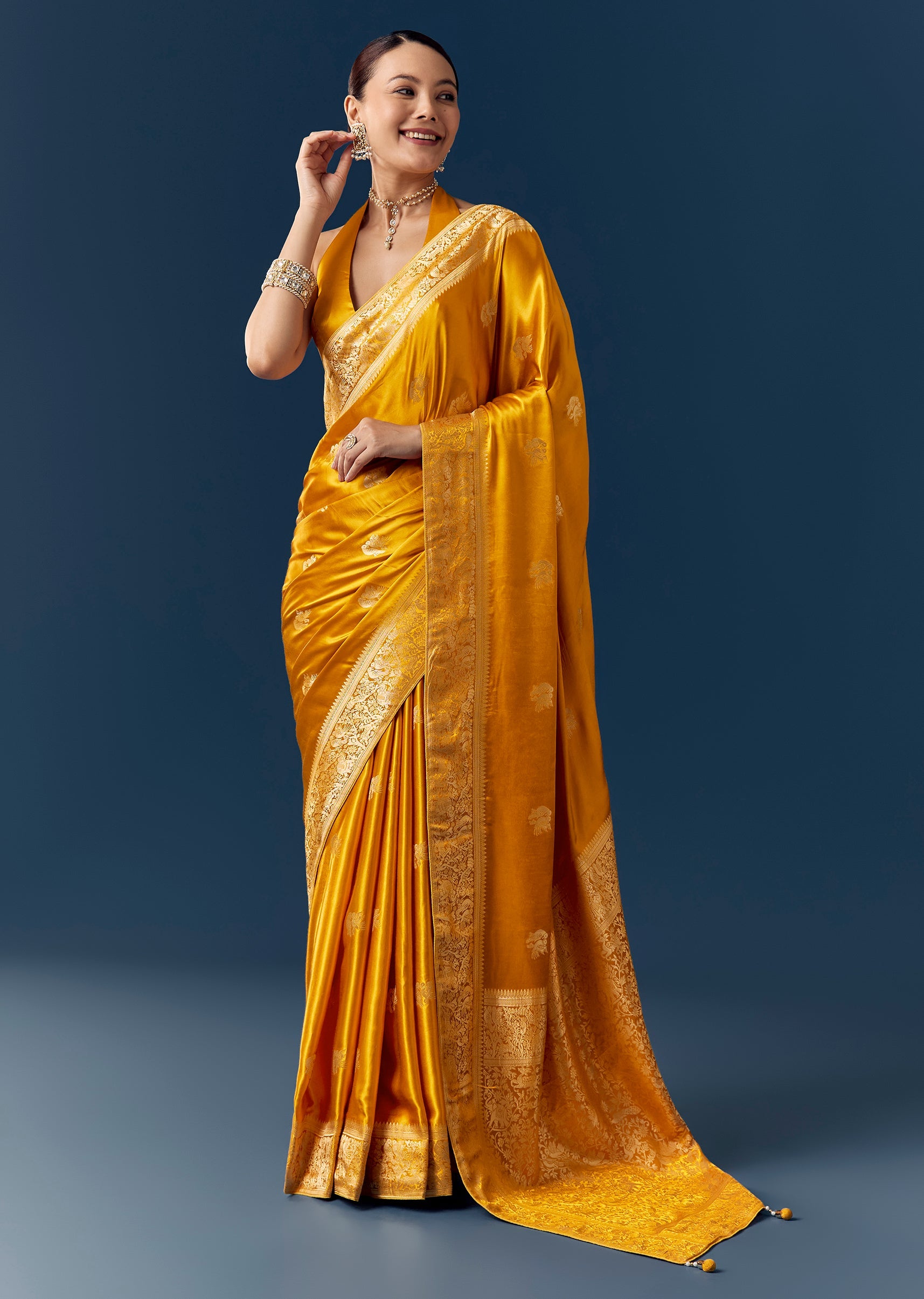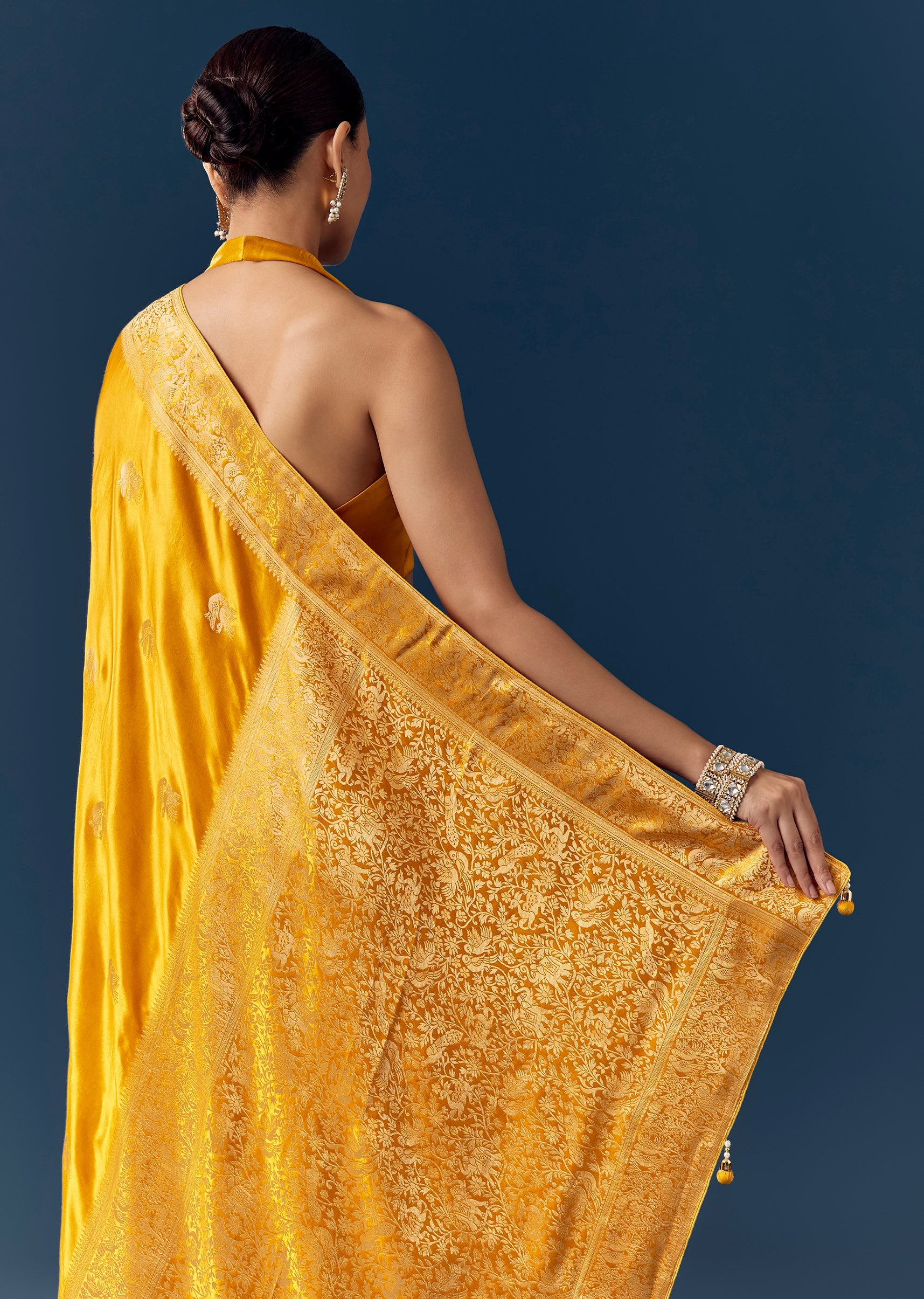 A mustard yellow satin silk saree featuring heavy zari woven butti, border, and bird motifs across the saree and pallu—made for standout festive wear, with unstitched blouse fabric included. Awarded as the Most Trusted Brand, we're delivering styles you love, just as promised.