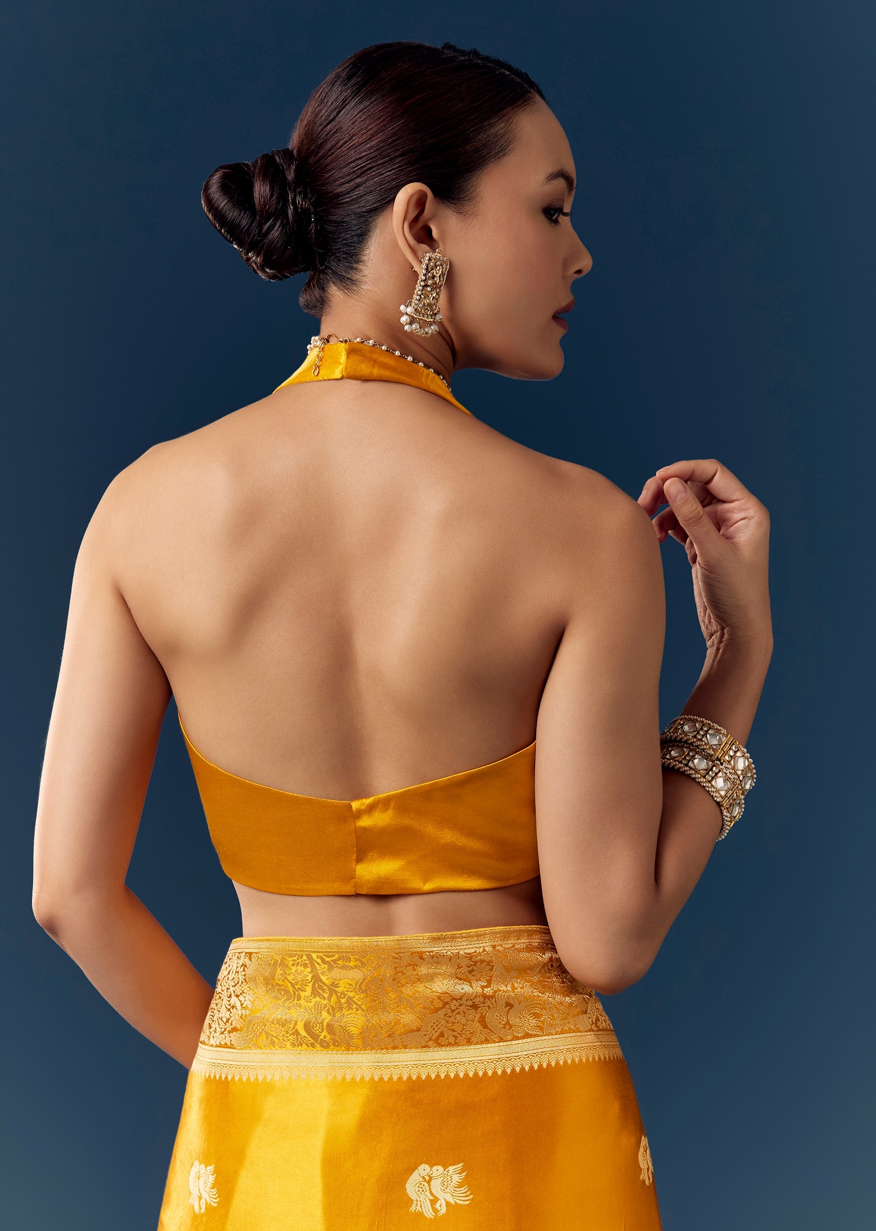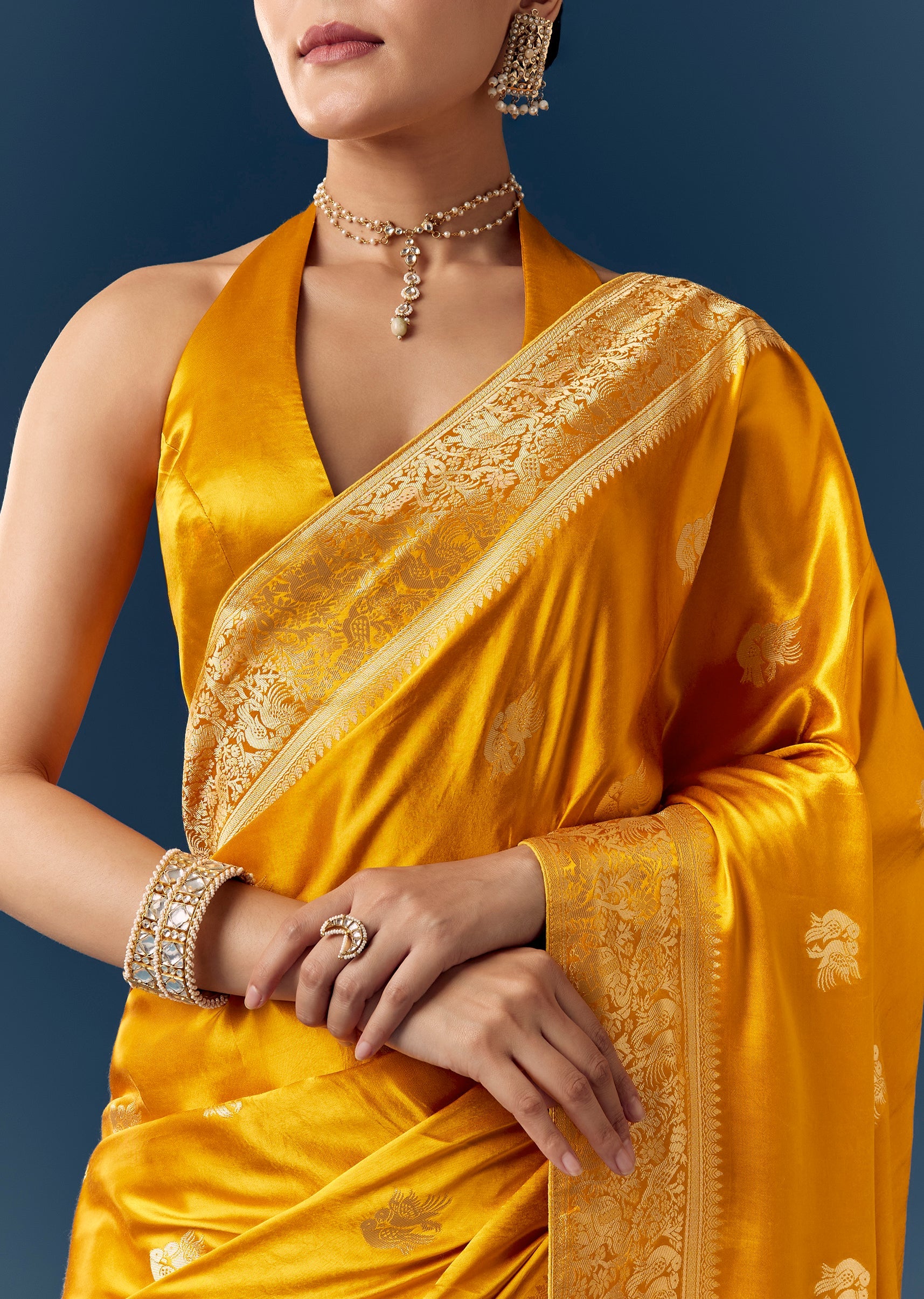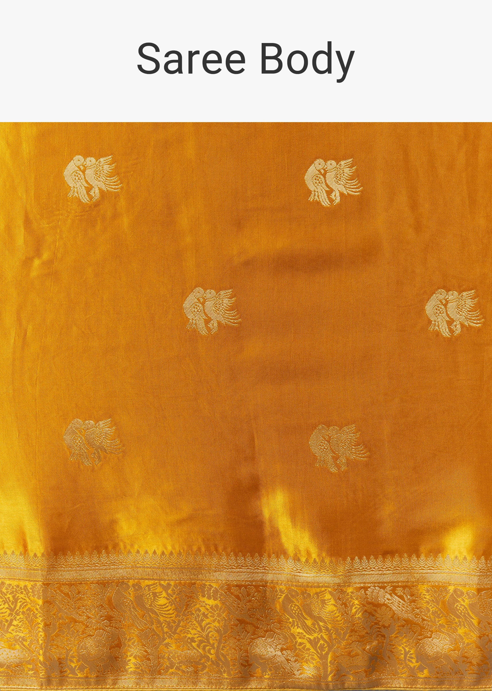 Mustard Satin Silk Saree with Bird Motif Zari Weave
