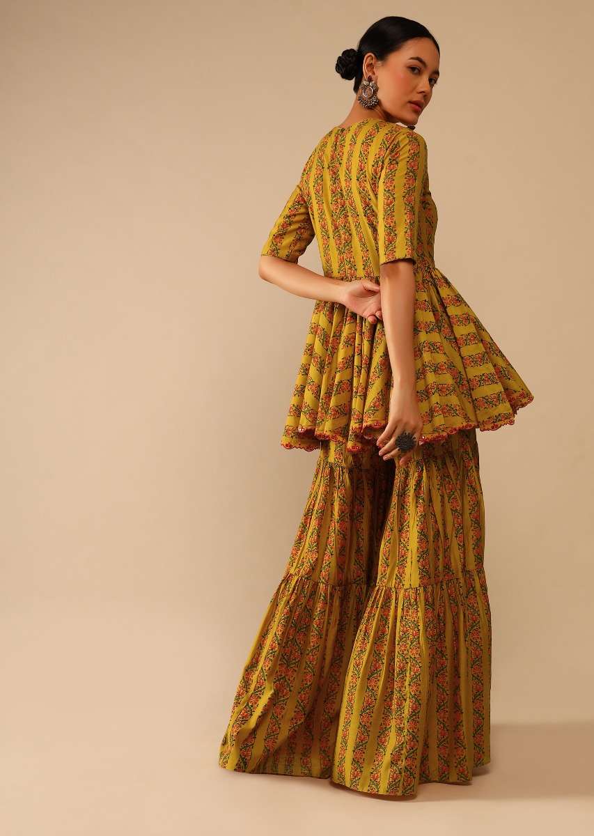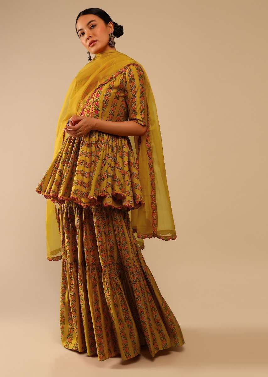 Mustard Sharara Suit In Cotton Blend With Peplum Kurti Adorned In Floral Print And Thread Embroidery