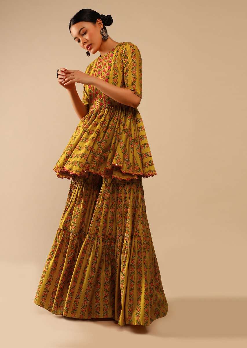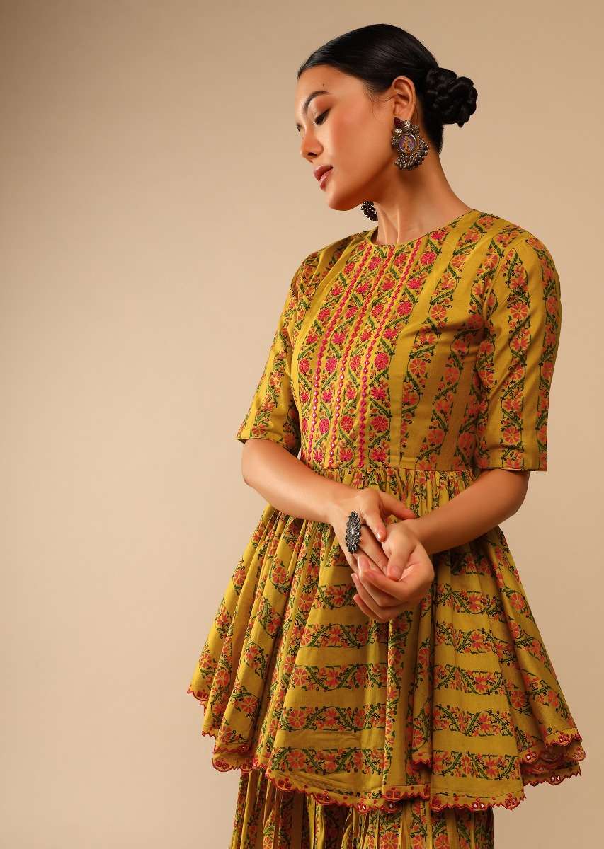 Mustard sharara suit in cotton blend with peplum kurti.It is adorned with floral print and embroidery detailing on the yoke and border using resham and abla work.It is crafted with... More Product Details