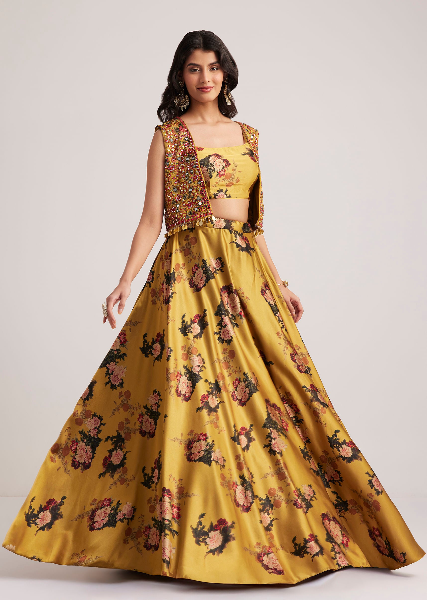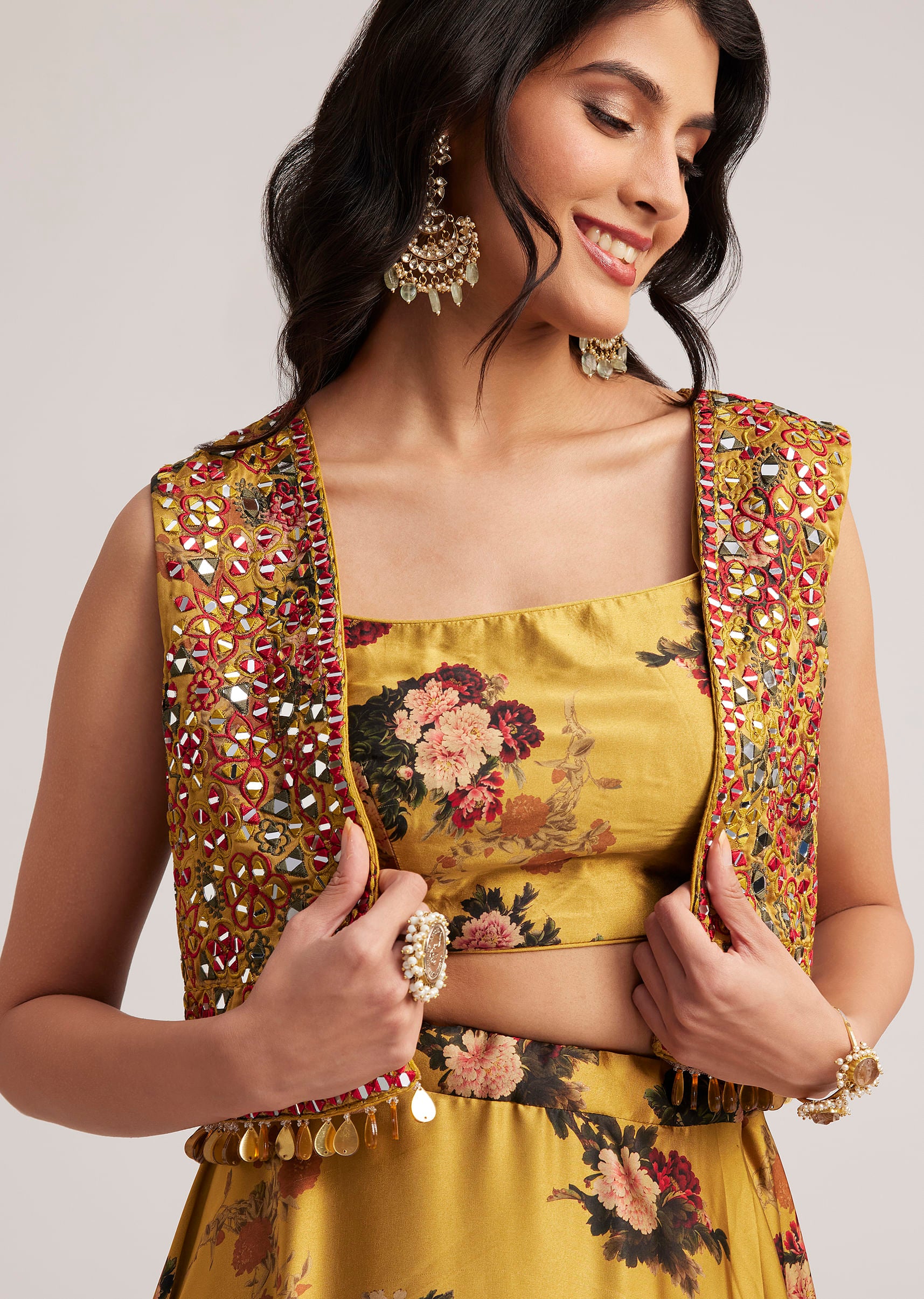 - Drape yourself in elegance with this mustard silk set, featuring a floral printed crop top and skirt paired with a resham-embroidered jacket adorned with intricate mirror work and tassel detailing.