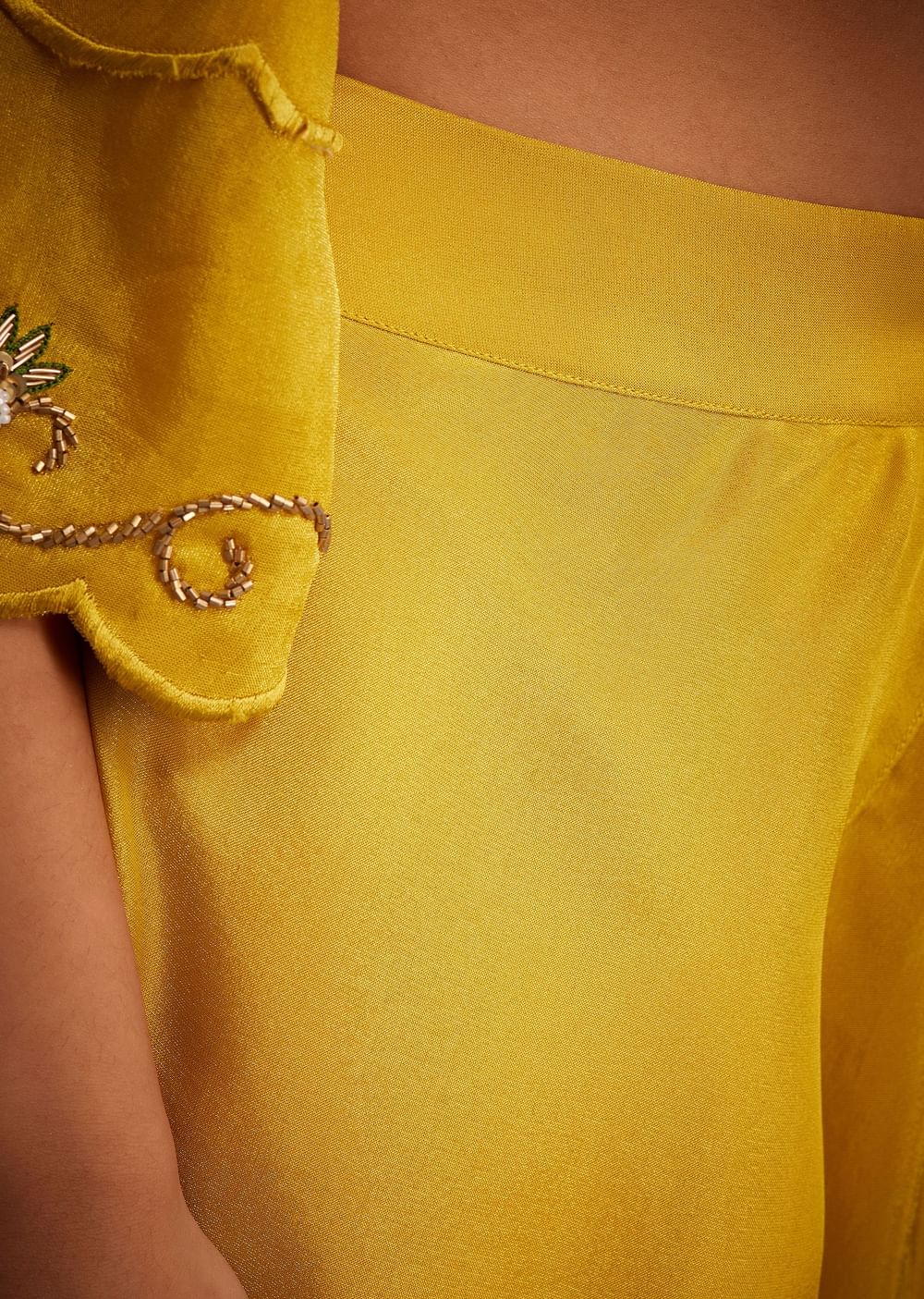 - Make a bold statement with this Mustard Tissue Dhoti Set, featuring intricate Zardosi, Sequins, Moti, and Resham embroidery.