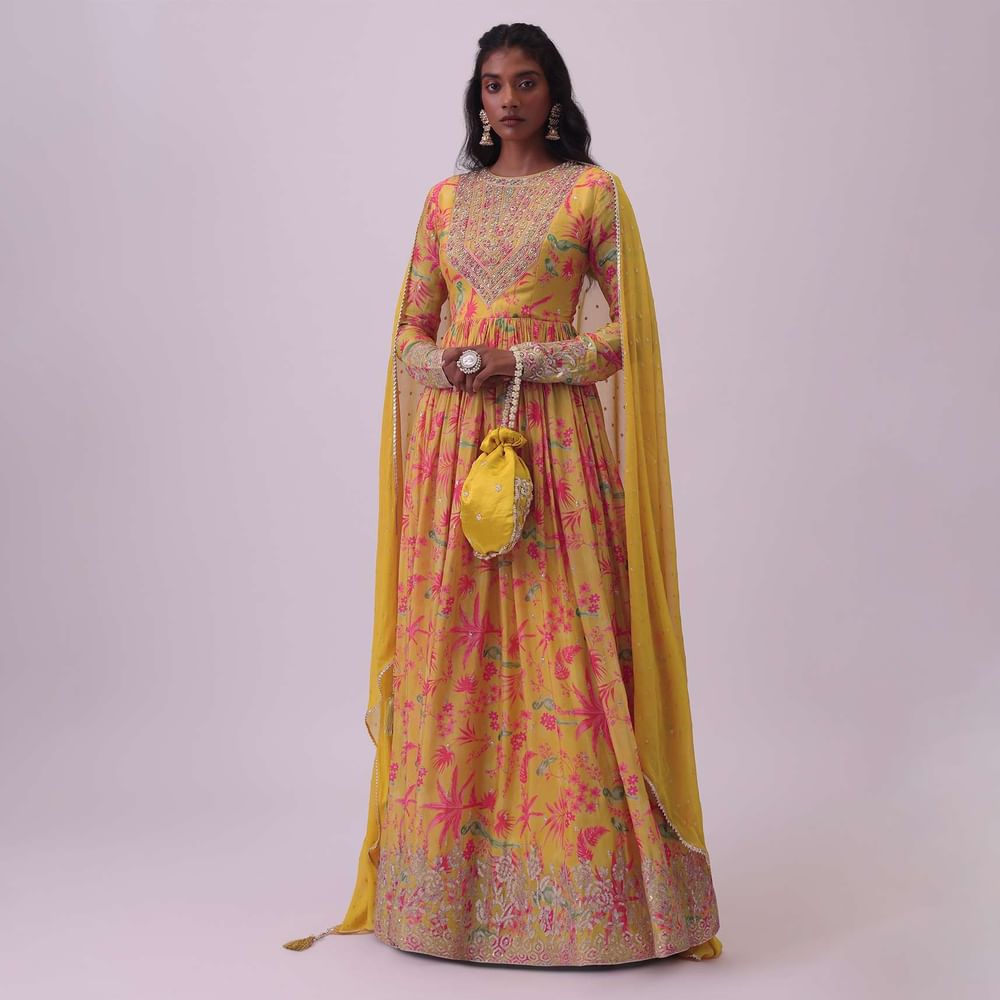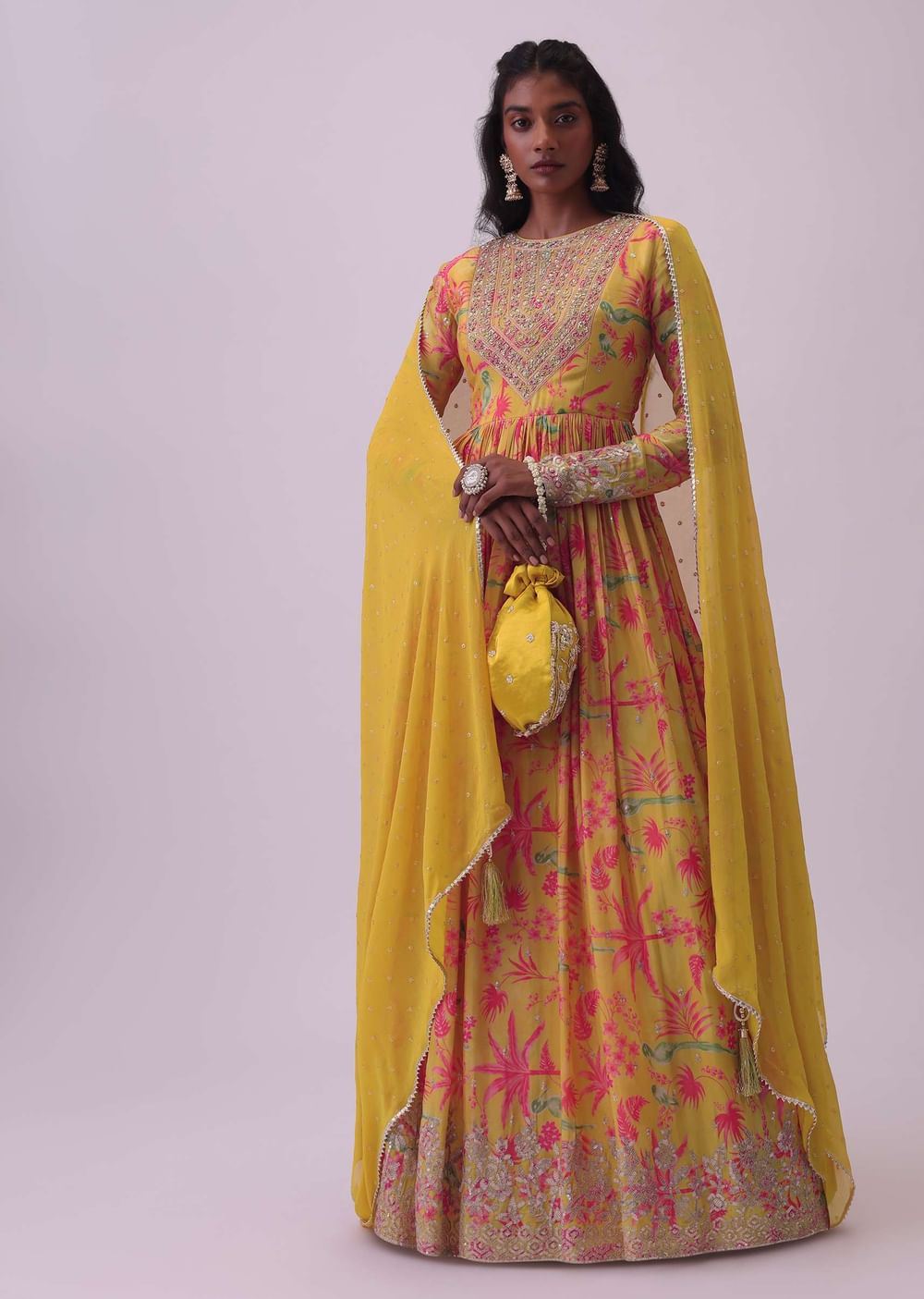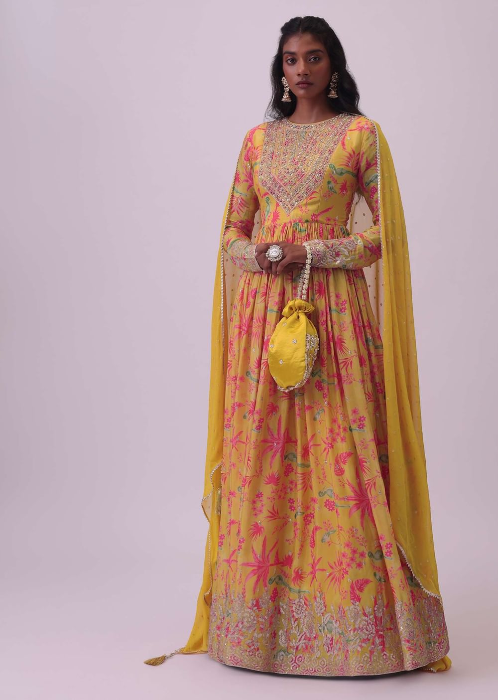Introducing our exquisite mustard yellow anarkali crafted in luxurious chinon fabric. Adorned with intricate floral embroidery, combining sequins, resham, beads, and zari, this ensemble beautifully blends traditional and contemporary aesthetics.... More Product Details