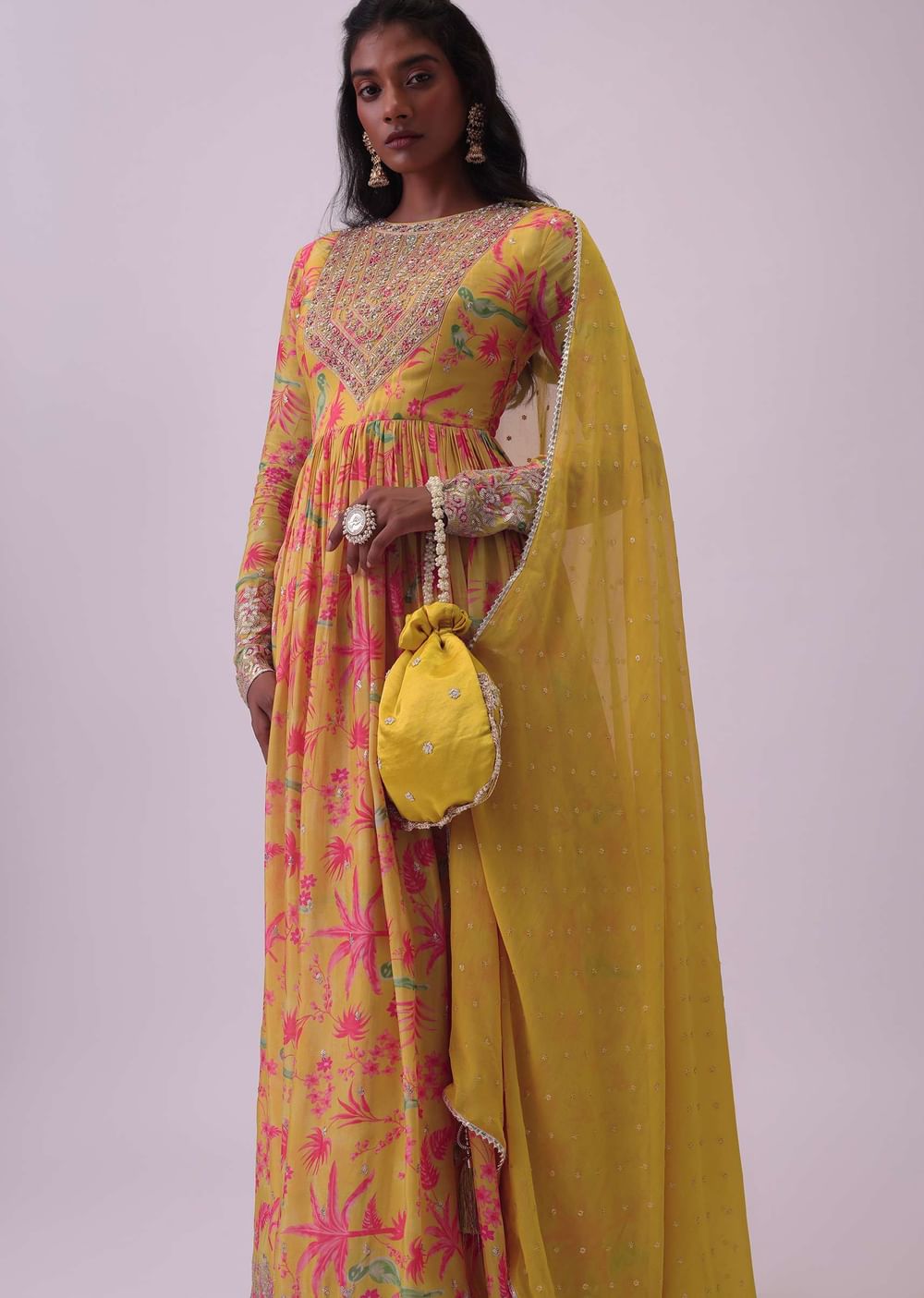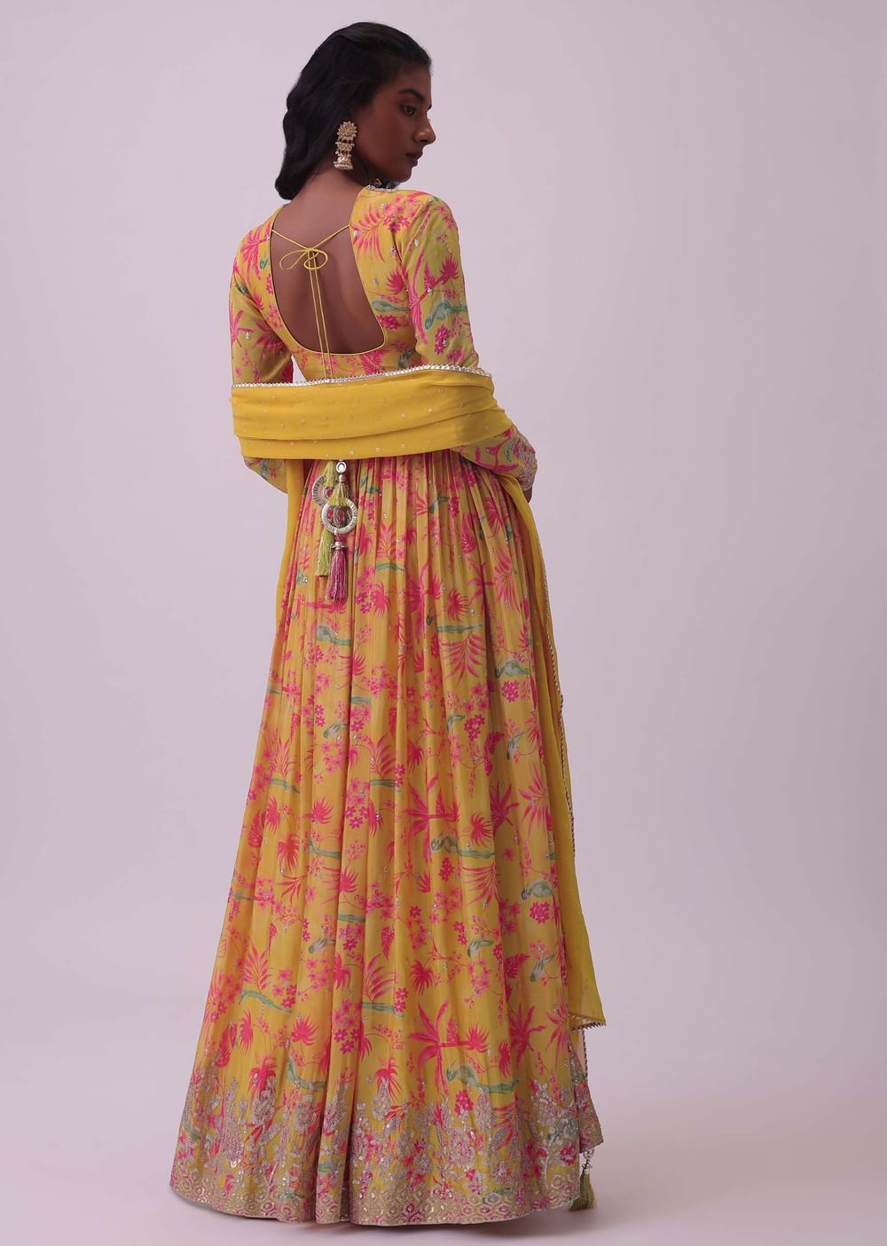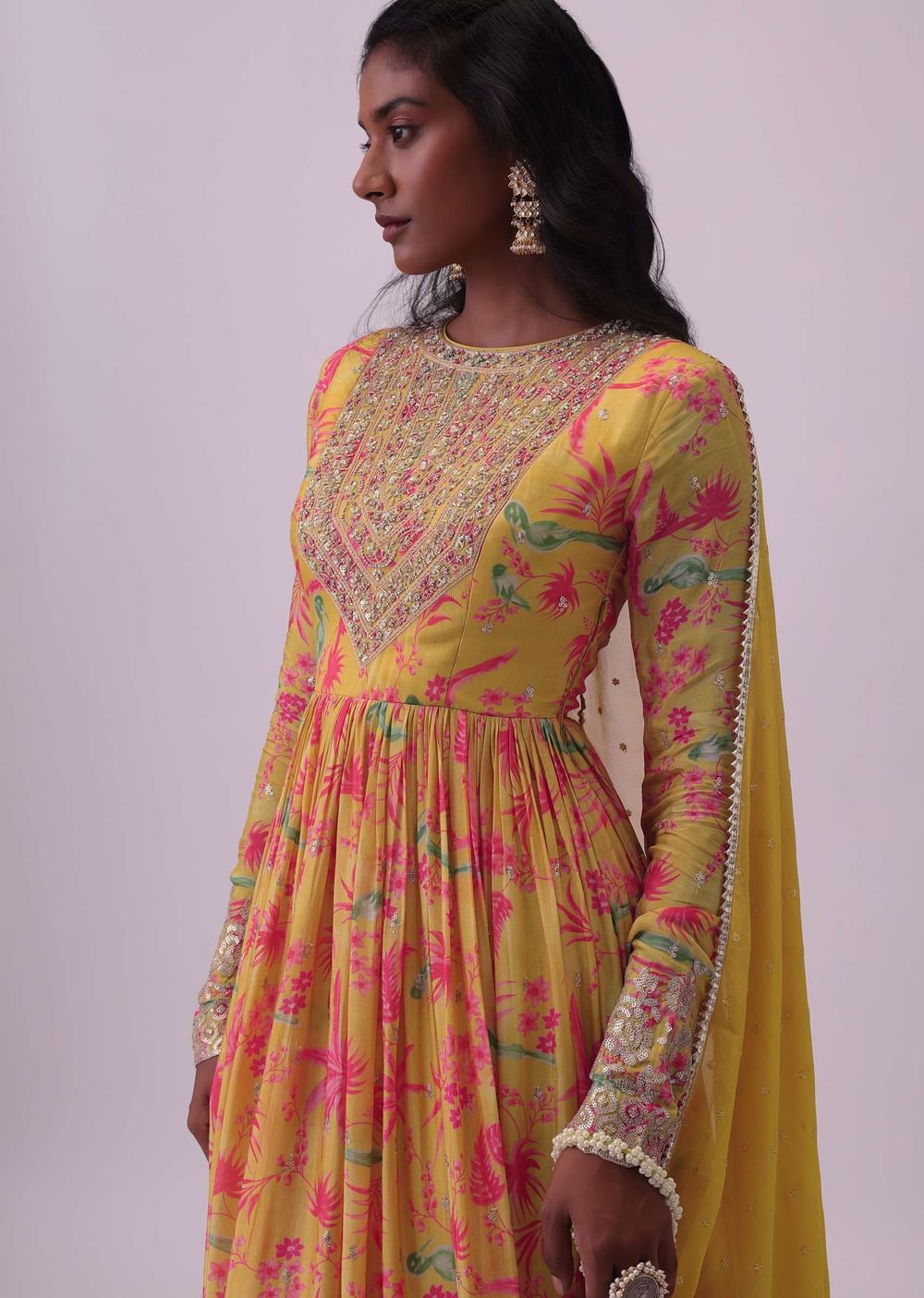 Introducing our exquisite mustard yellow anarkali crafted in luxurious chinon fabric. Adorned with intricate floral embroidery, combining sequins, resham, beads, and zari, this ensemble beautifully blends traditional and contemporary aesthetics.... More Product Details