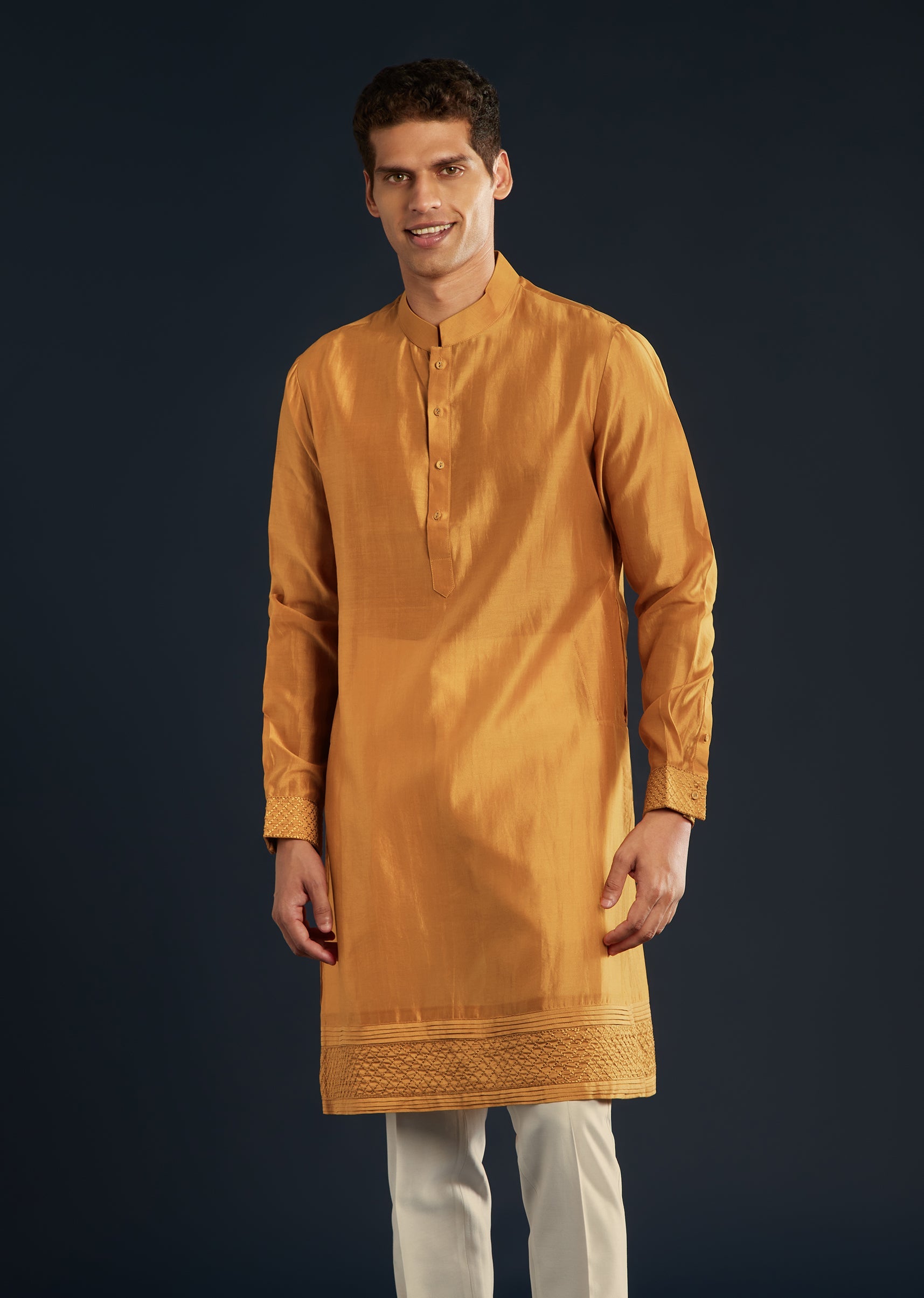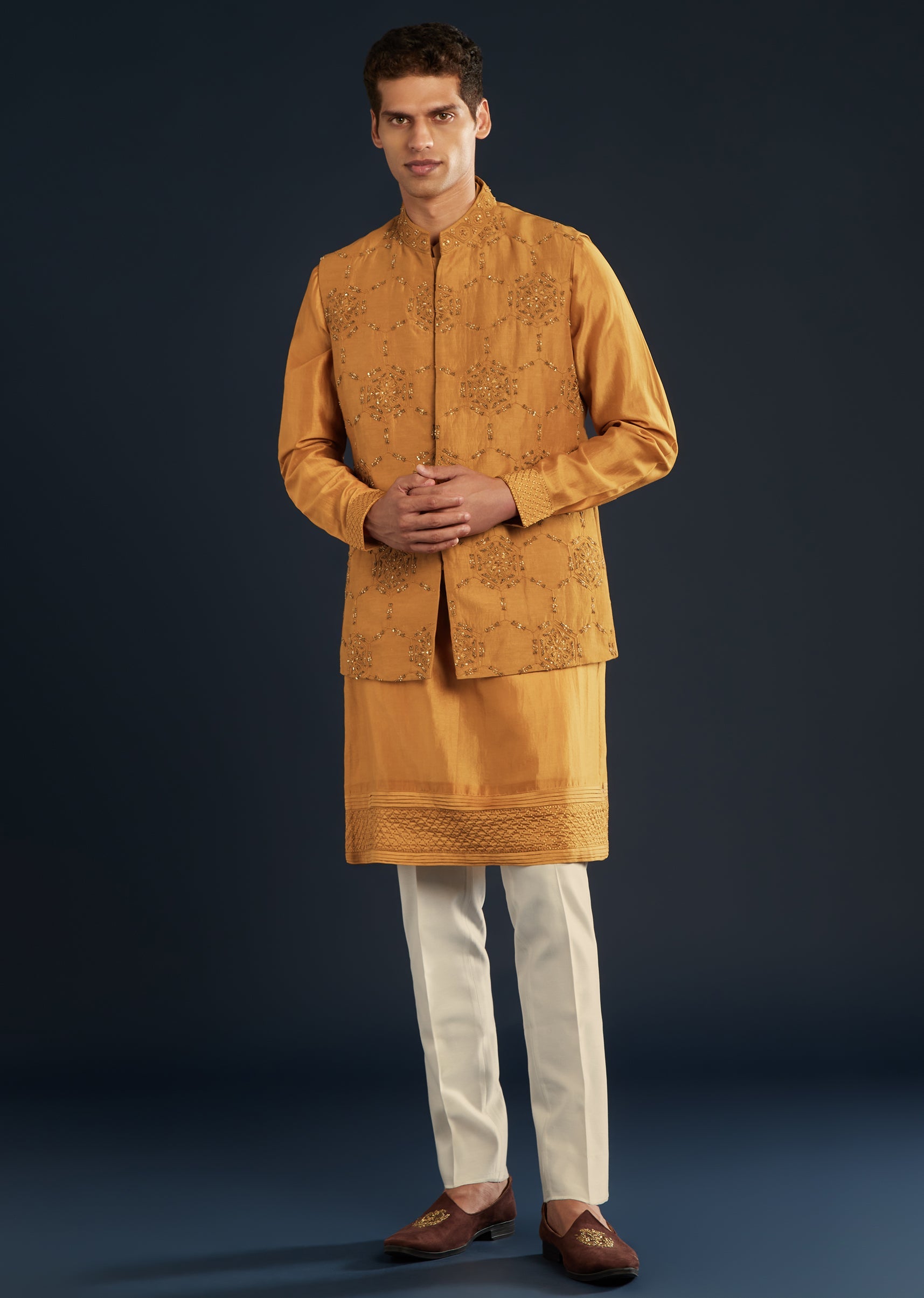 Resplendent silhouettes meet contemporary designs with this mustard yellow men’s jacket kurta set. Finished with dori wotk on the jacket, the glistening sequins and cutdana embellishment catches light in motion.... More Product Details