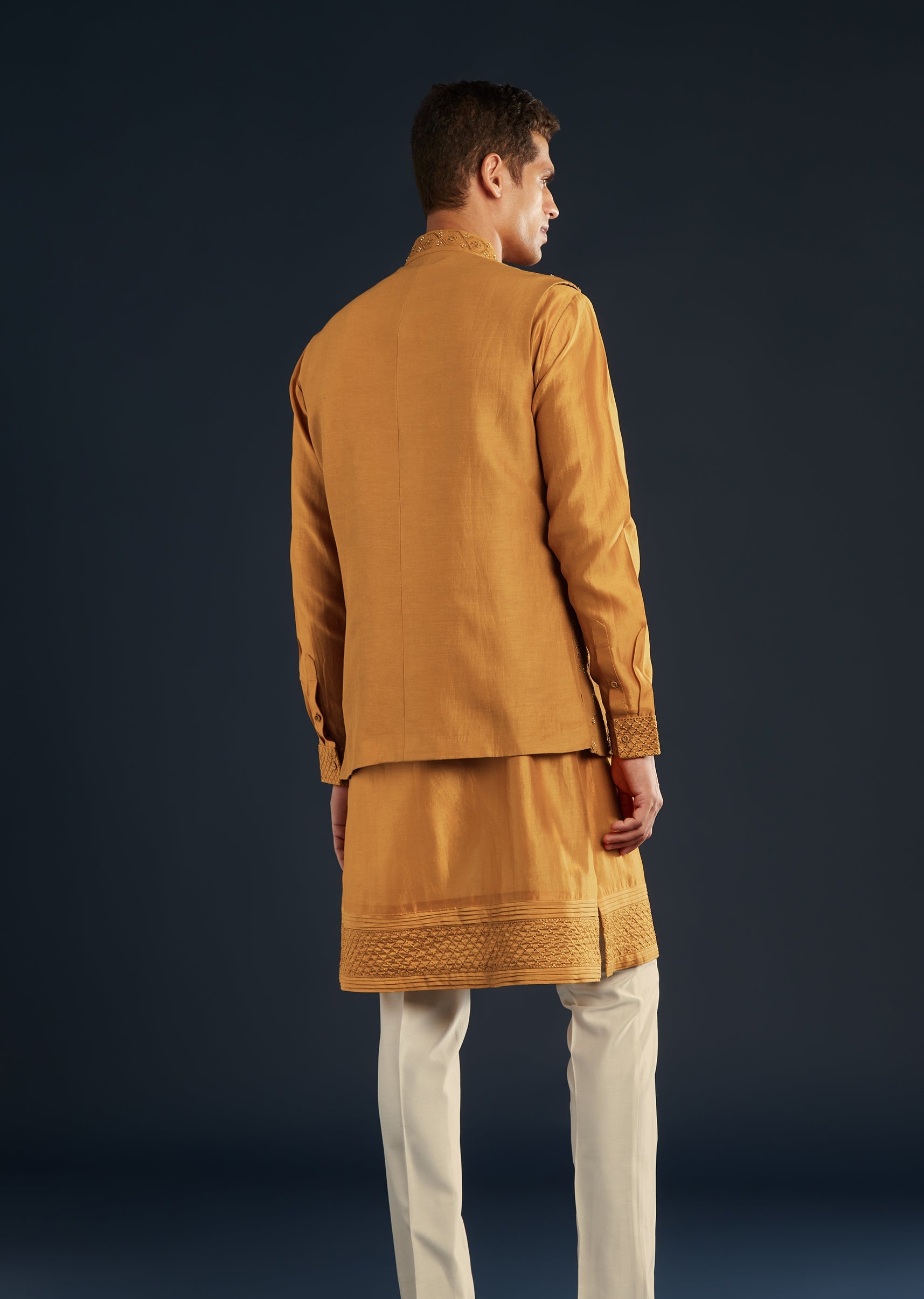 Mustard Yellow Chanderi Jacket Kurta Set With Dori Work