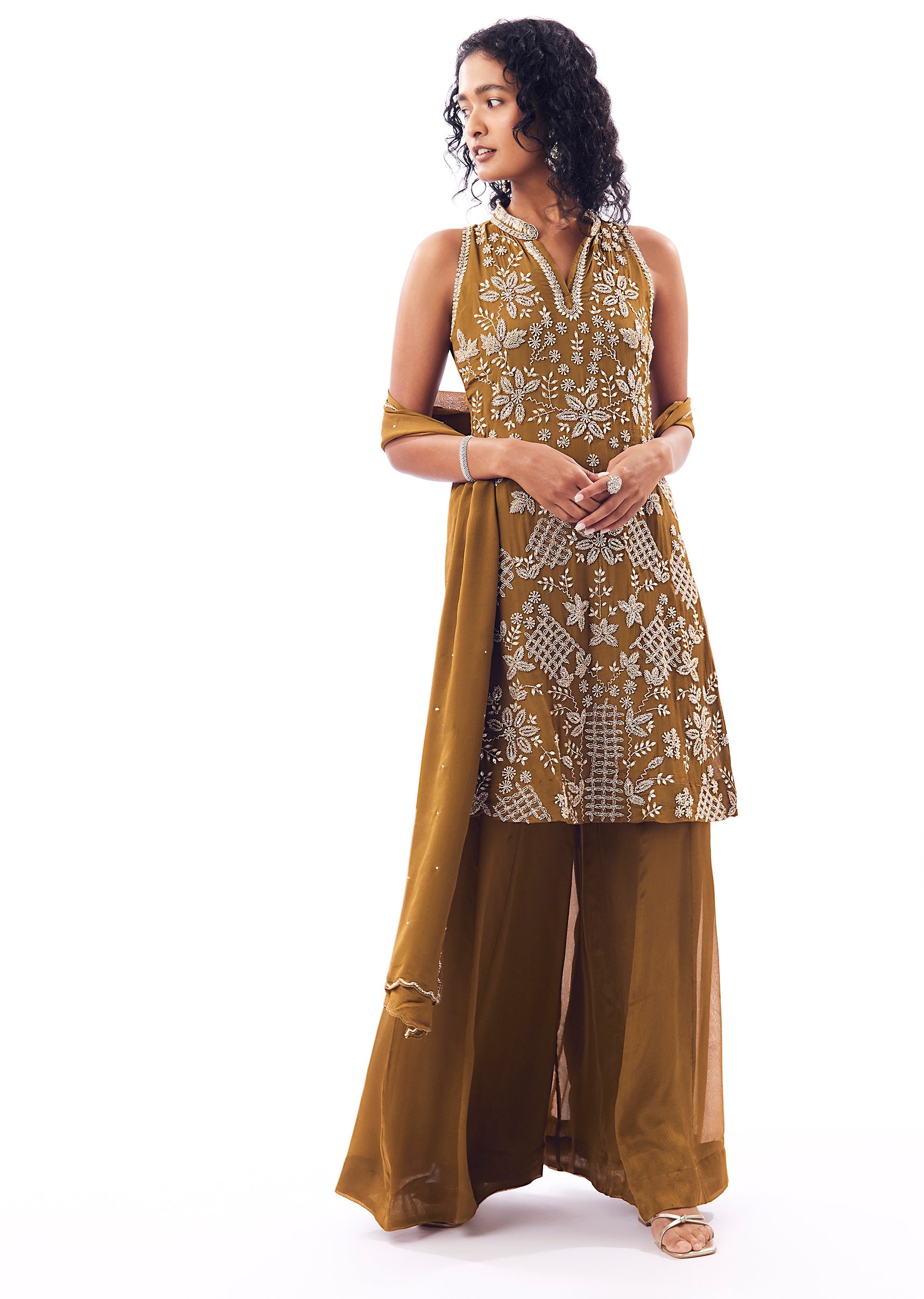 A festive palazzo suit in chinon featuring a knee-length straight kurta finished with bead and cutdana work. Styled with a partially elasticated wide palazzo and a matching dupatta, this set... More Product Details