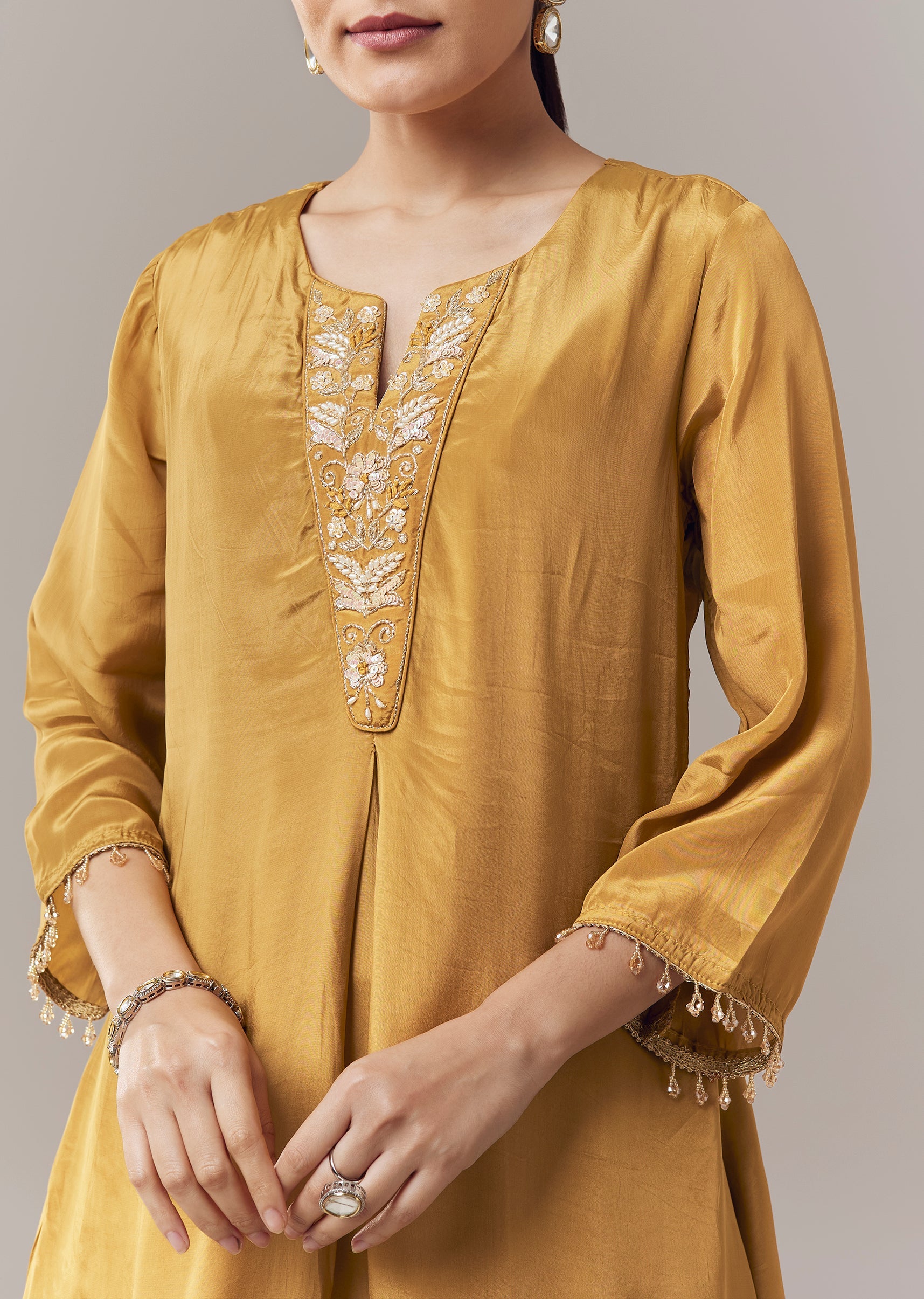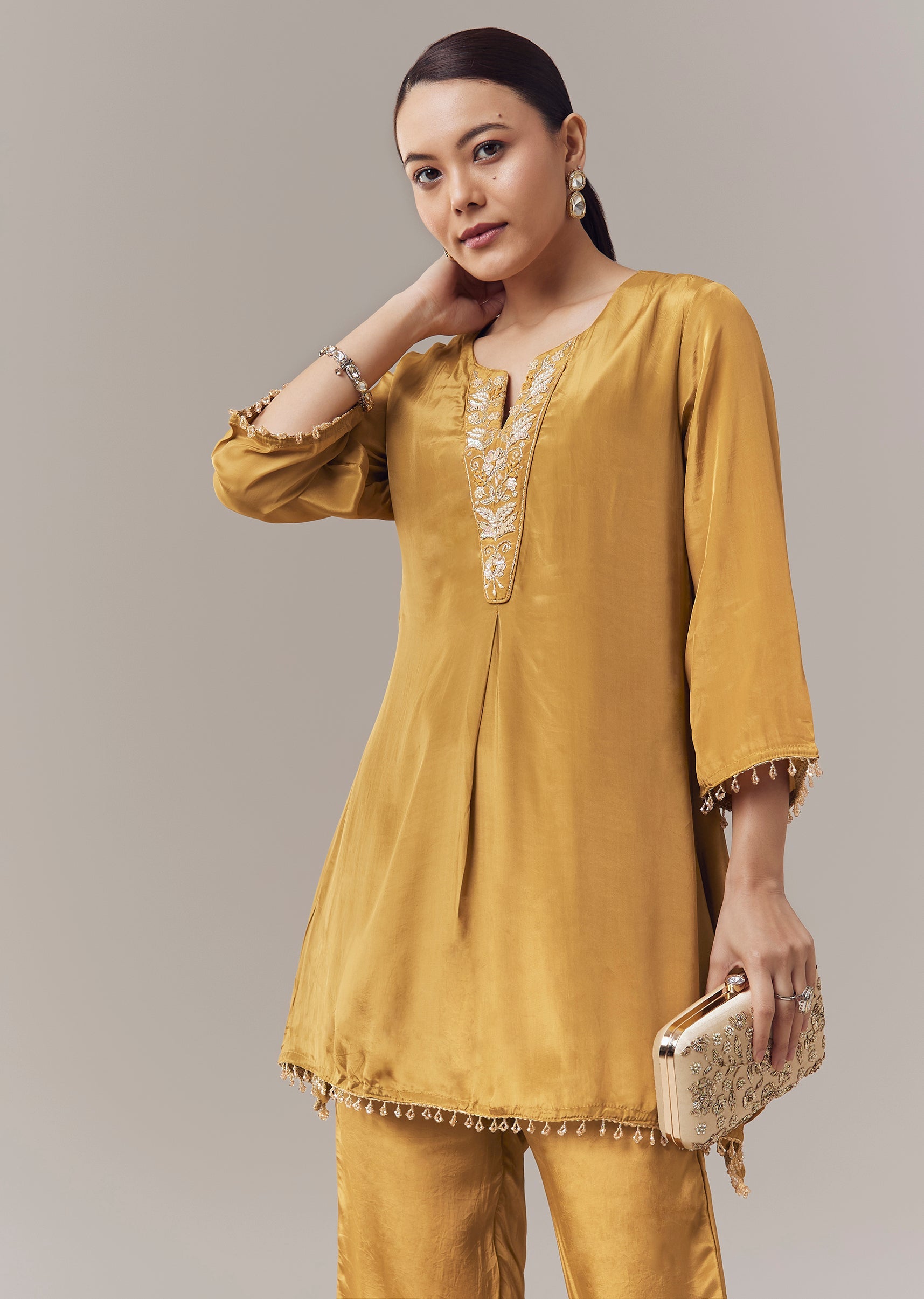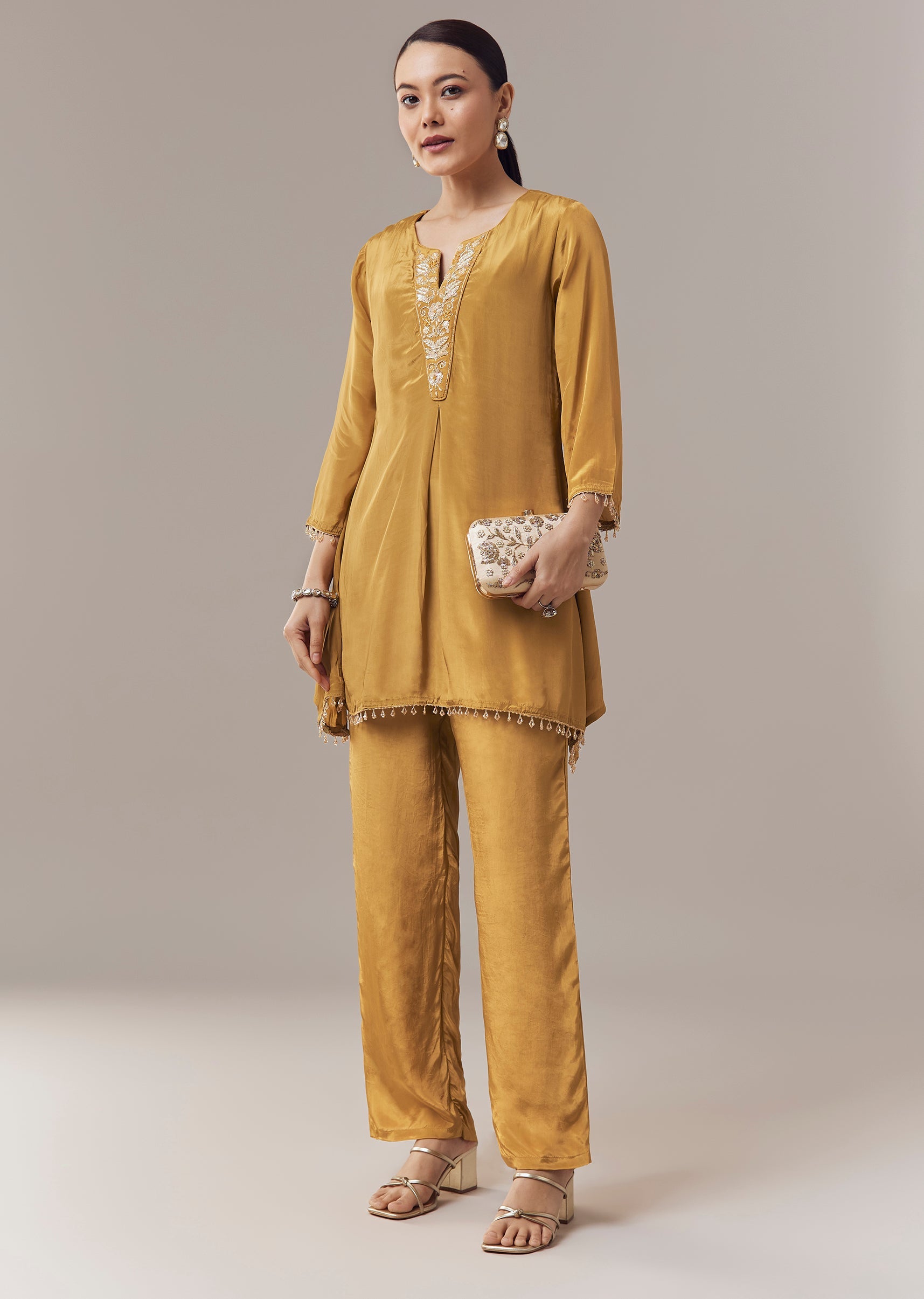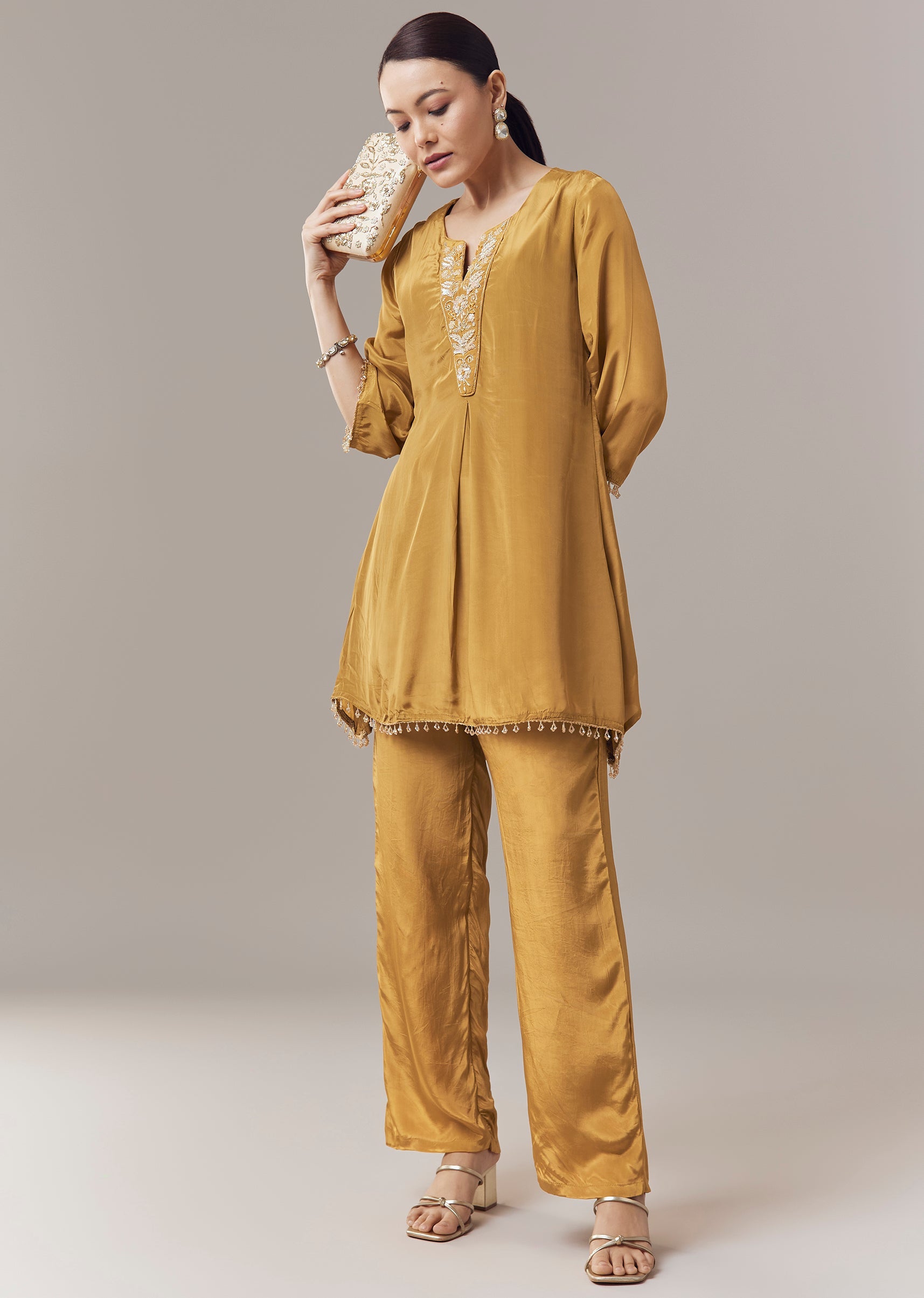 Vibrant and festive, this mustard yellow coord set kurti is crafted in soft crepe fabric for a comfortable and elegant feel. The kurti is adorned with intricate sequins and zari... More Product Details