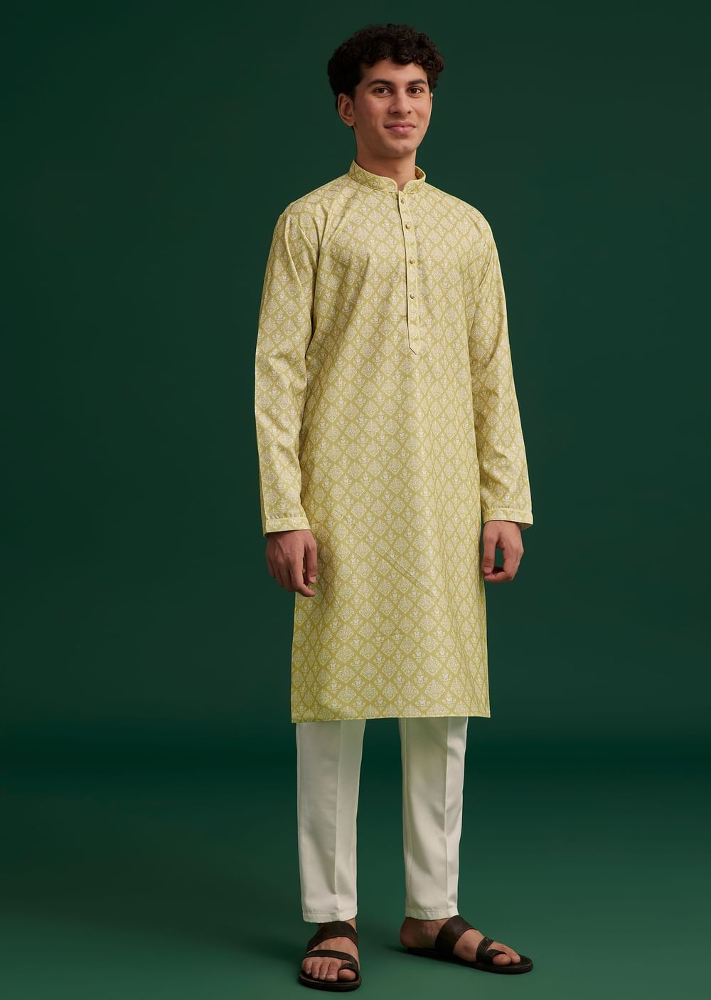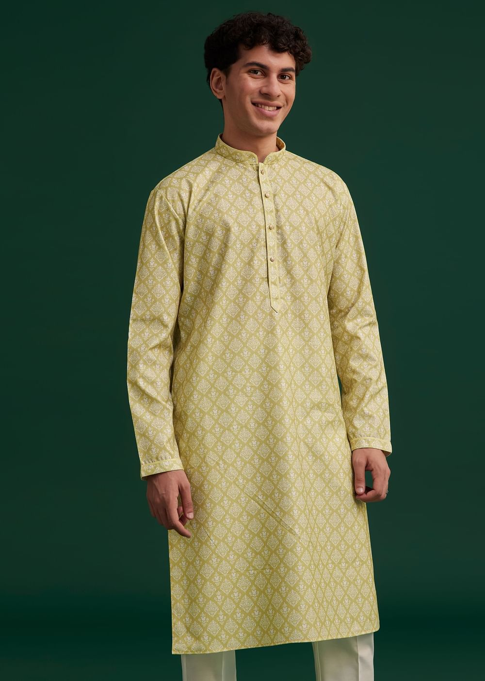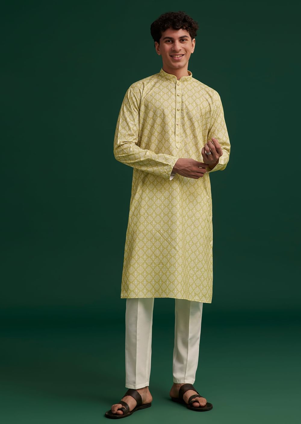 - Embrace Timeless Tradition With This Mustard Yellow Cotton Kurta Set Adorned With An Intricate Geometric Print That Exudes Understated Elegance.