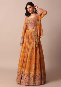 Mustard Yellow Embroidered Choli With Printed Jacket And Lehenga