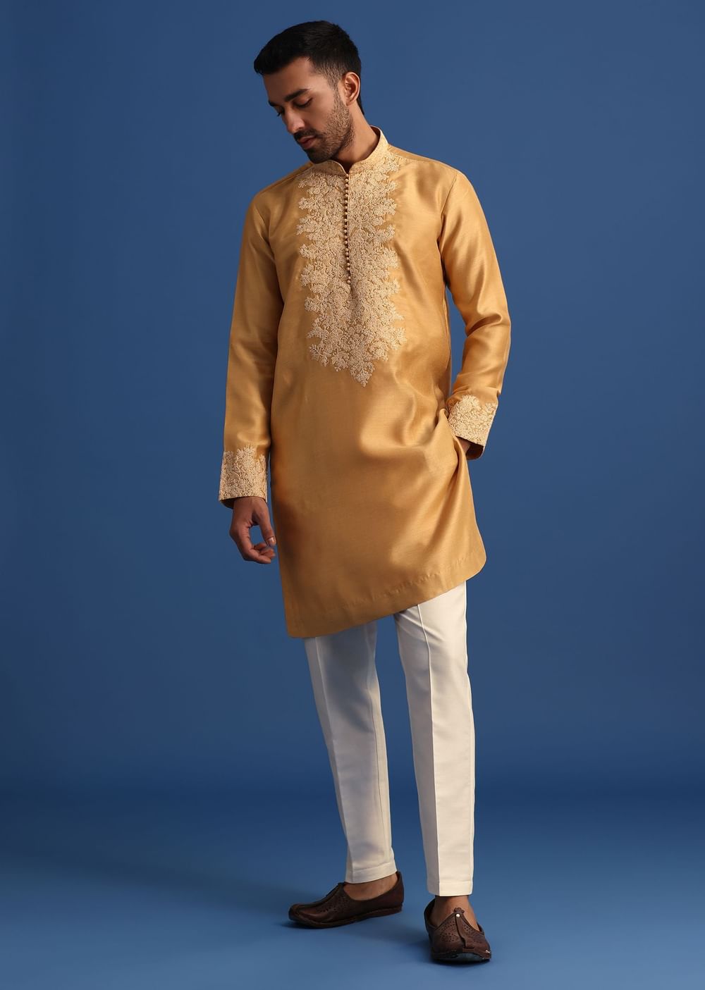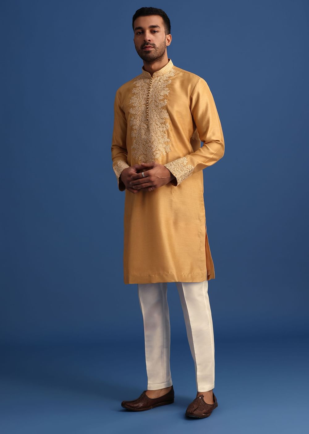 Step out in this vibrant mustard yellow kurta set to shine at every celebration. Tailored from blend of rich silk fabrics, the kurta is accented with detailed kantha work floral... More Product Details