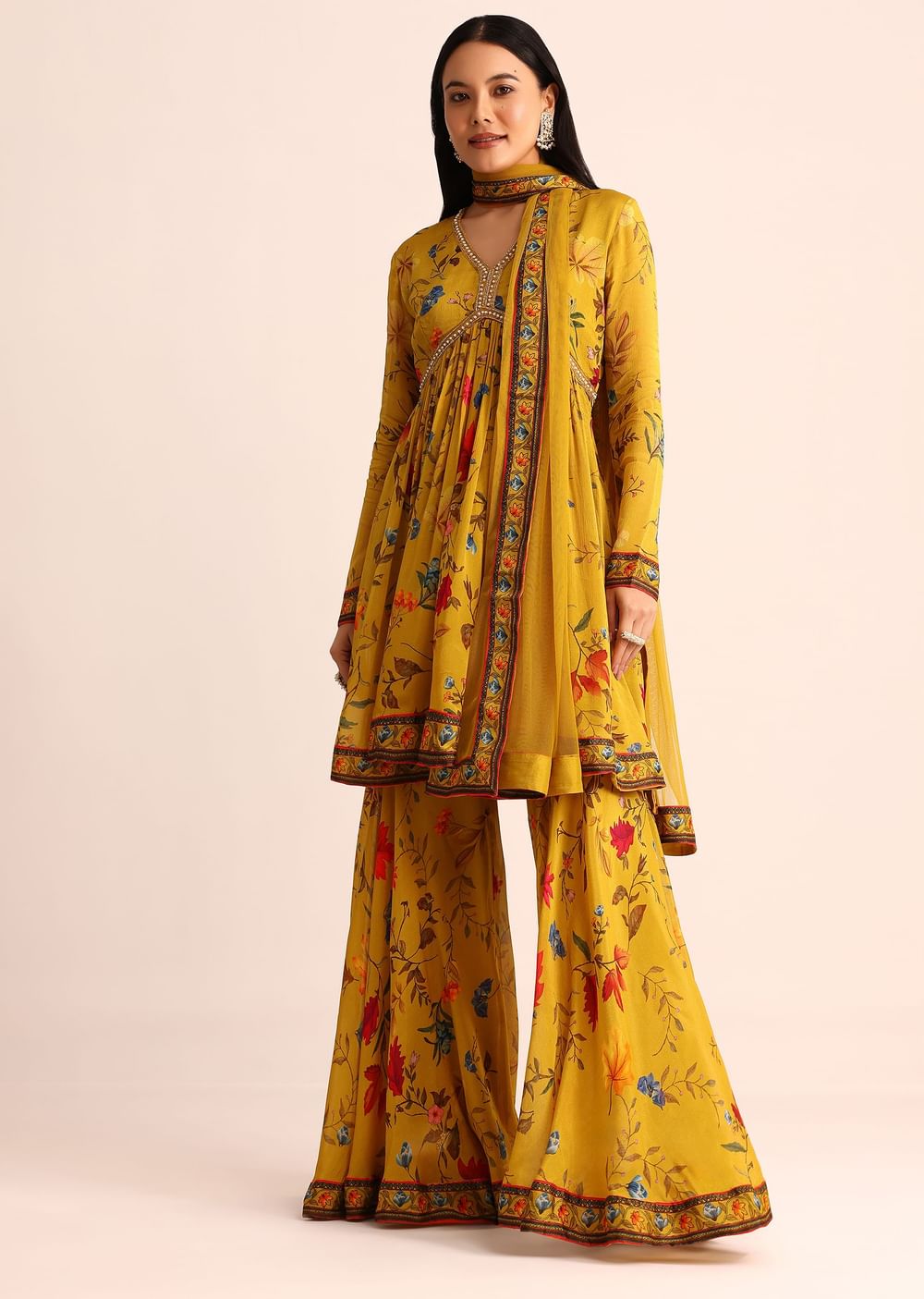 Mustard Yellow Floral Printed Kurta Sharara With Dupatta