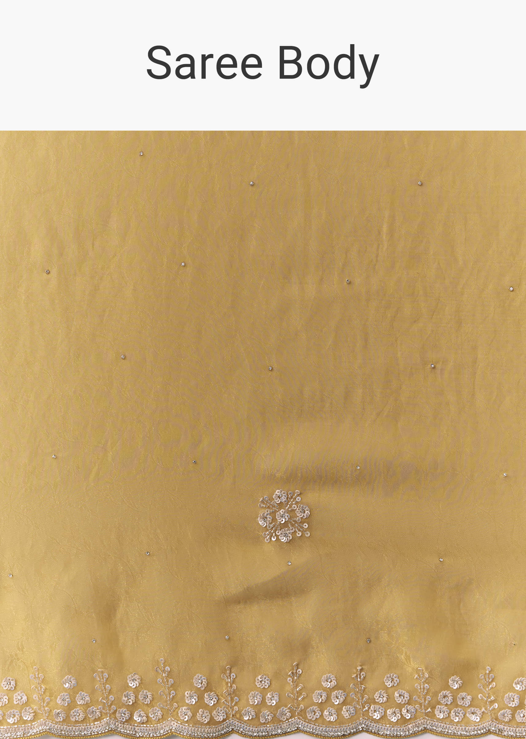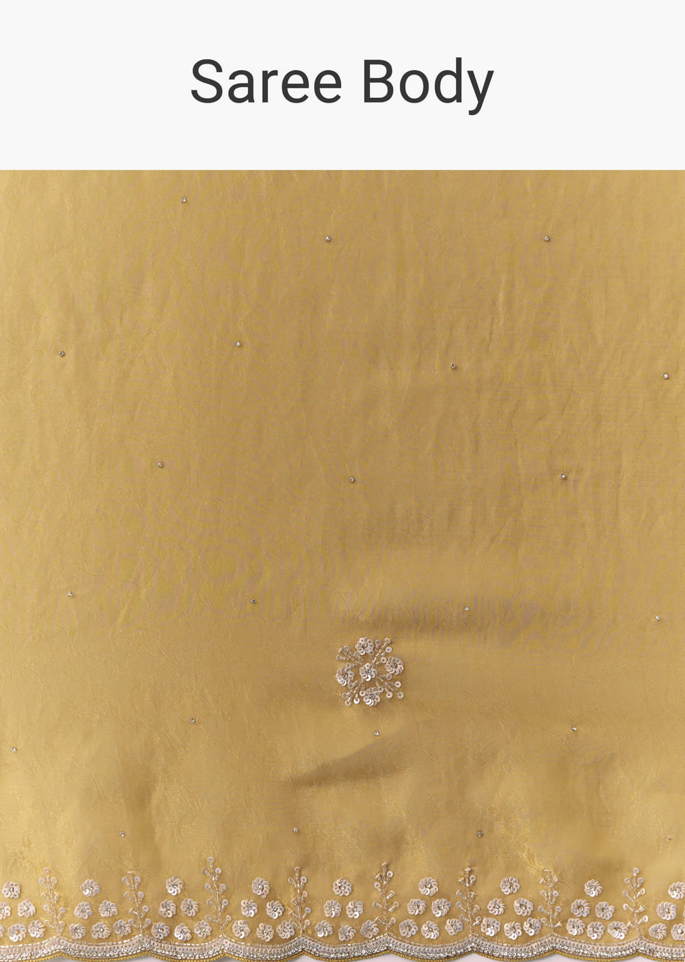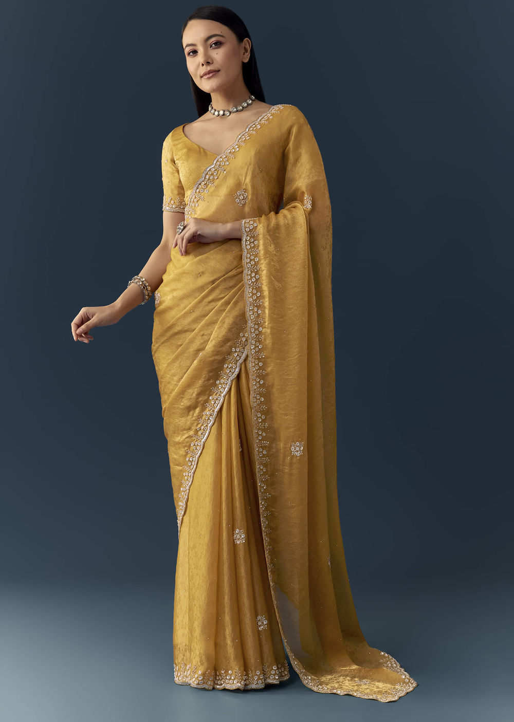 Exude refined charm with this mustard yellow jacquard printed tissue saree, adorned with a beautifully scalloped cutwork border. The saree is delicately embroidered with cutdana and sequins and embellished with shimmering stones, adding a touch of festive sparkle. Crafted in luxurious tissue fabric with a rich jacquard weave, it offers a graceful drape and radiant appeal. Awarded as the Most Trusted Brand, we're delivering styles you love, just as promised.