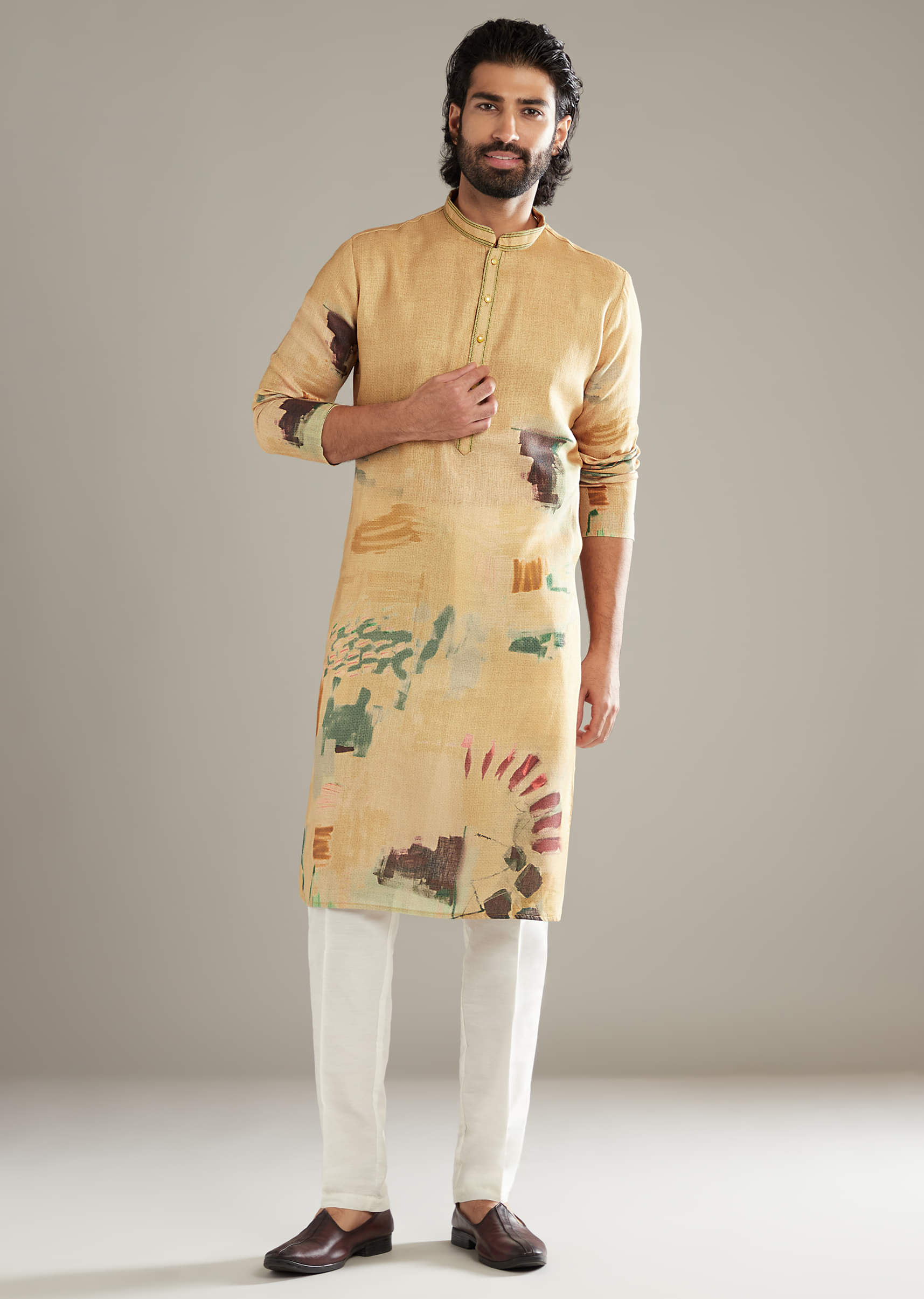 Start strong and stay effortless as this mustard yellow linen blend men’s kurta set brings movement through an artful abstract. The colour carries confidence while the cut keeps everything grounded.... More Product Details