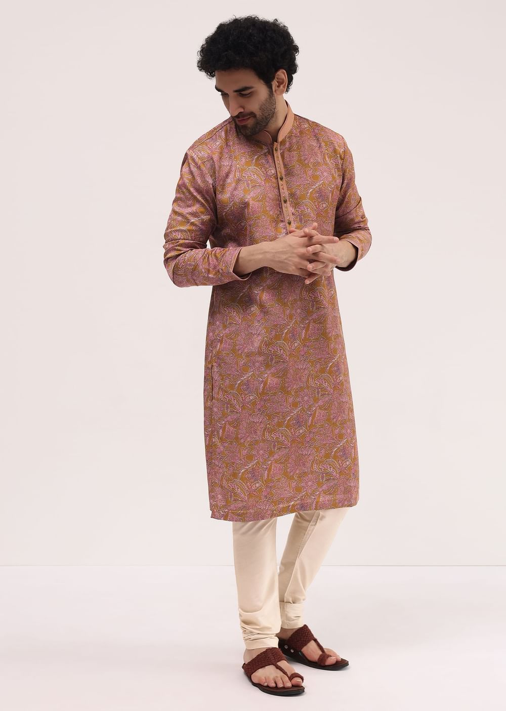Mustard Yellow Printed Silk Kurta Pyjama For Men