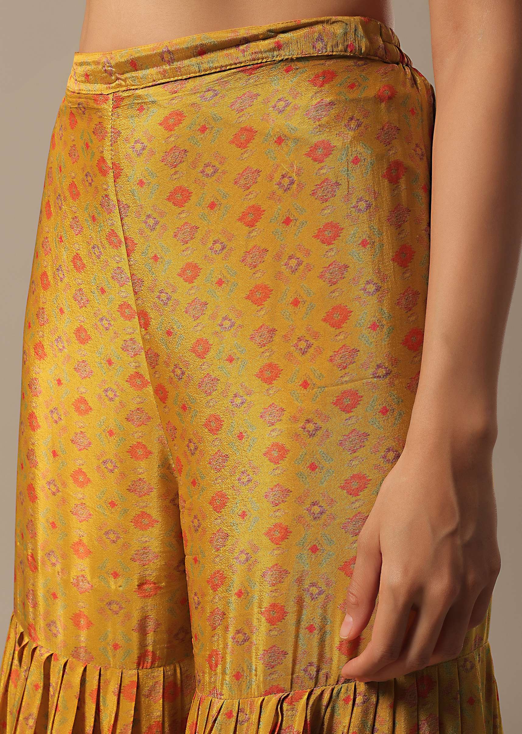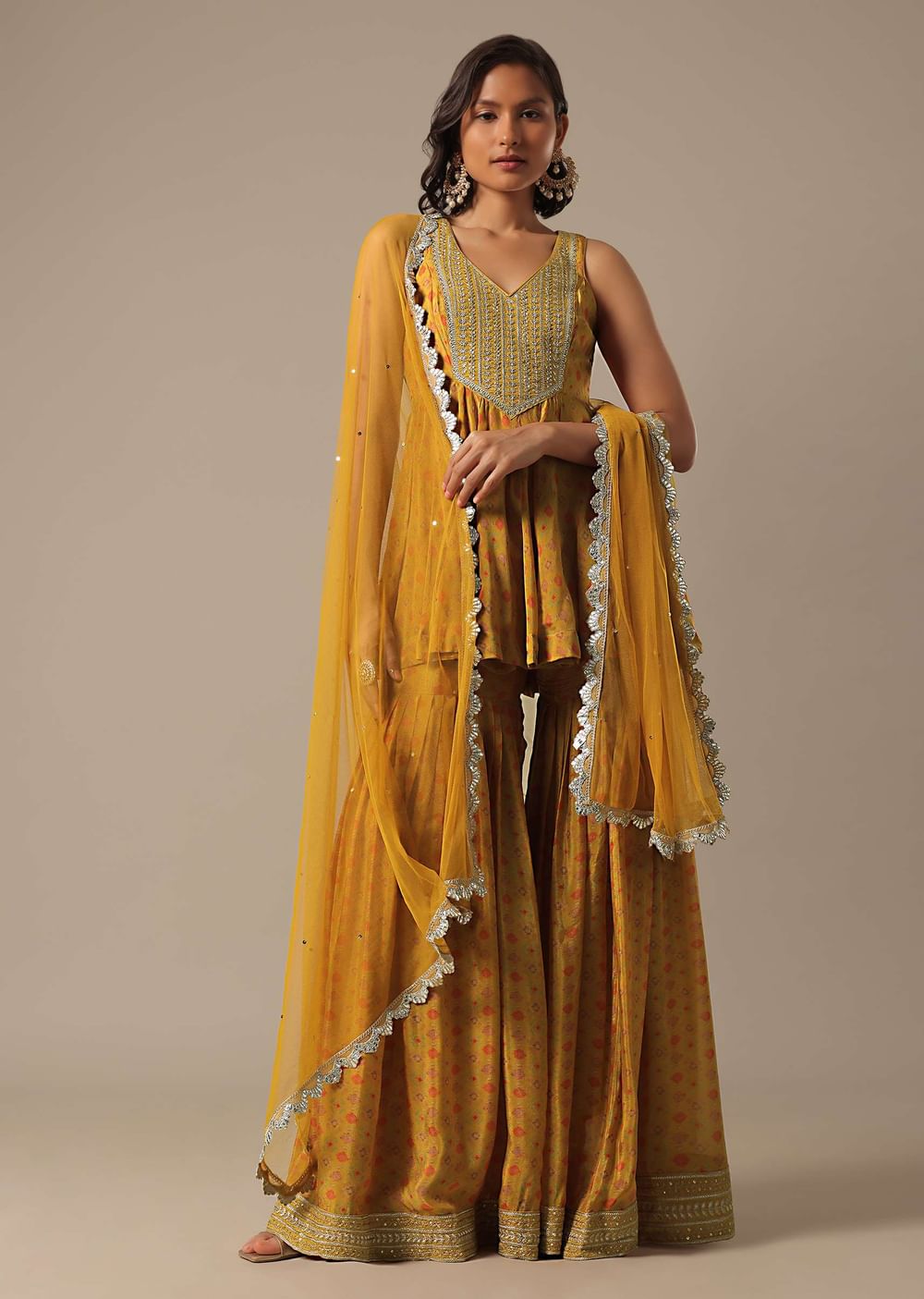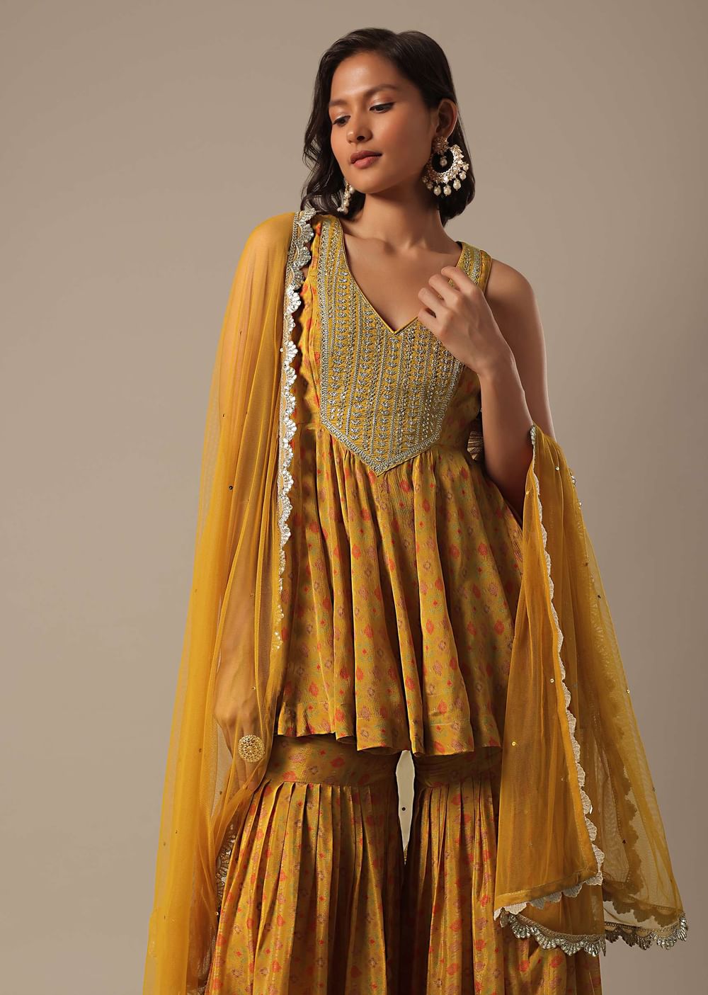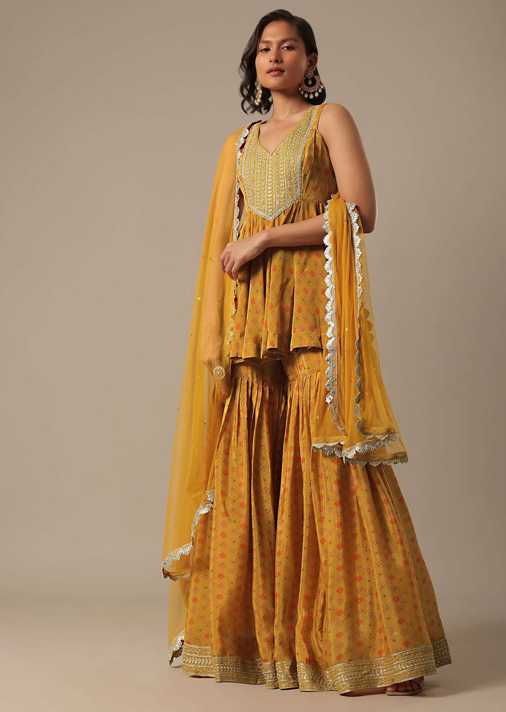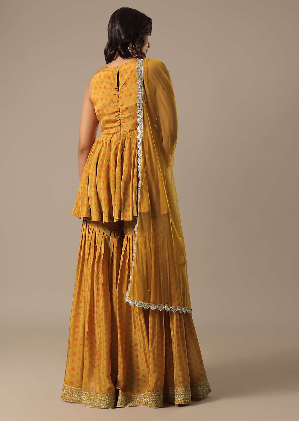 Mustard Yellow Sharara Set With Printed Peplum Top And Dupatta