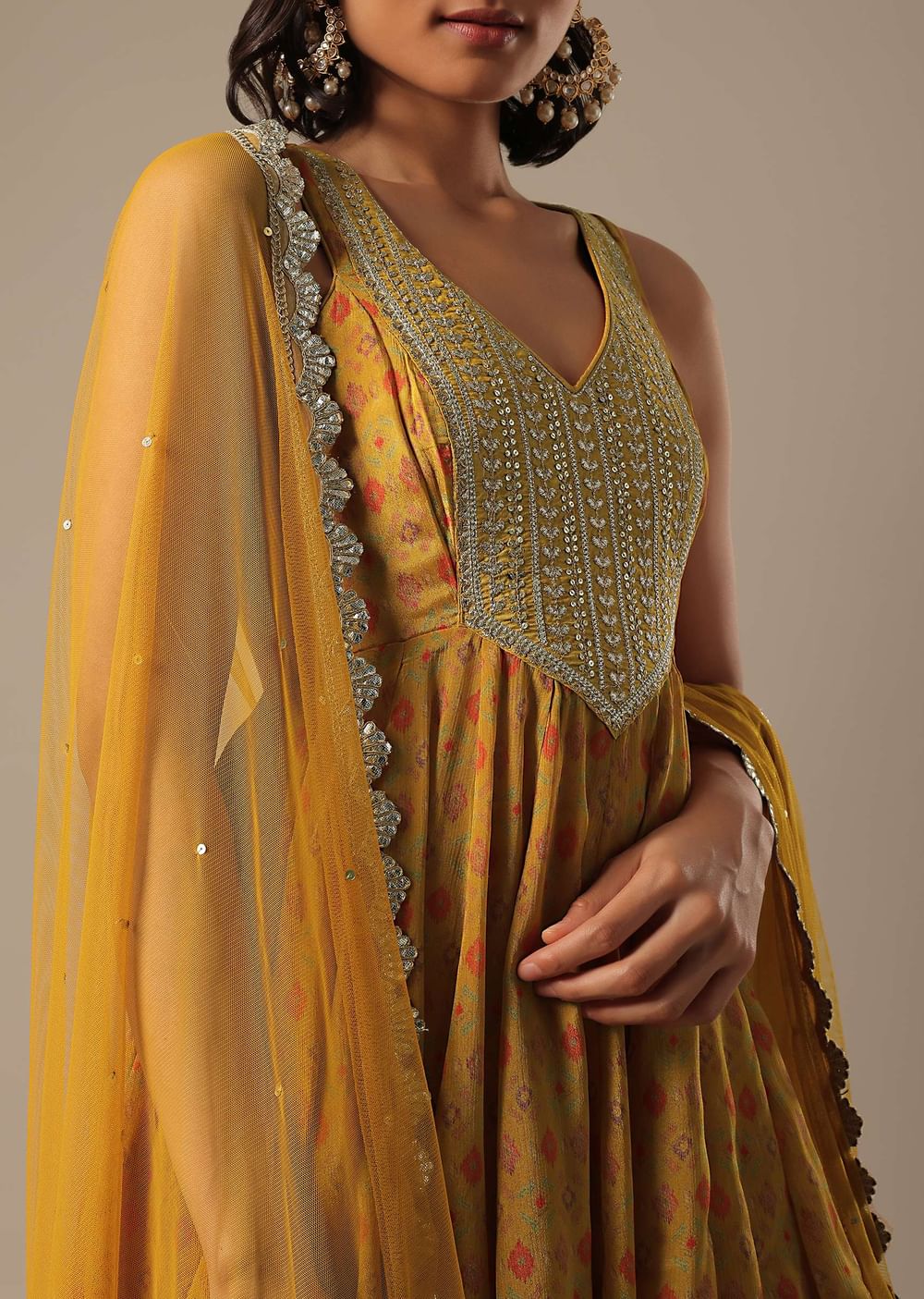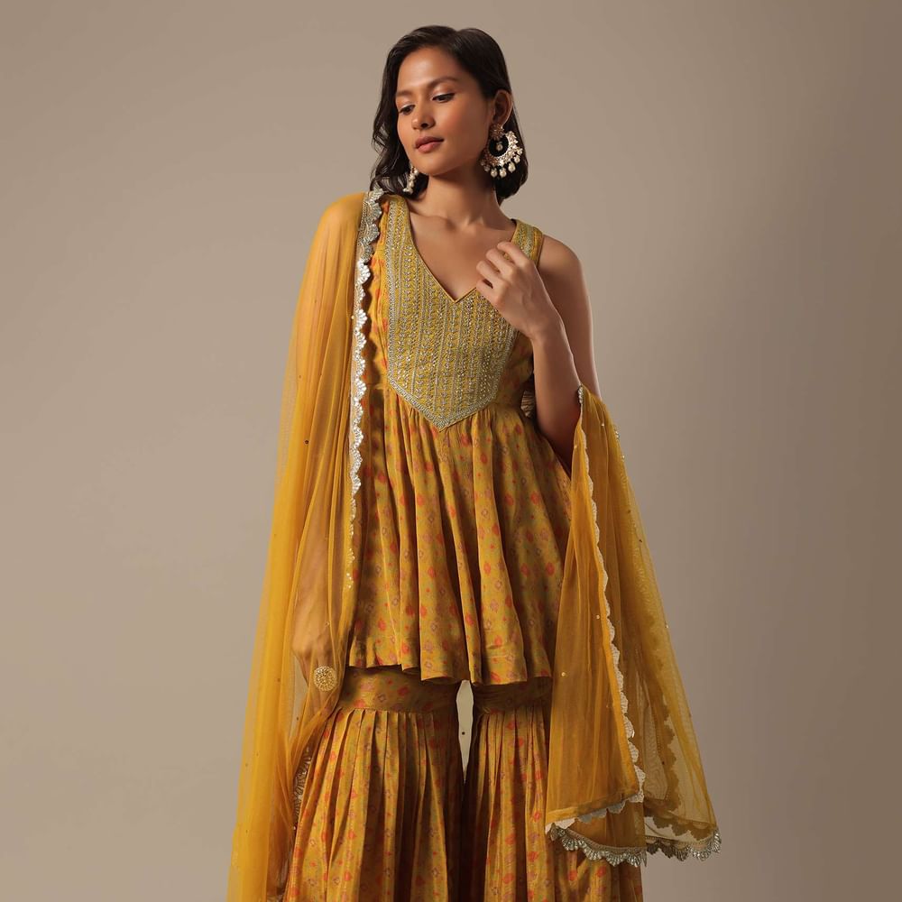 Introducing our stunning and vibrant mustard yellow sharara set for a memorable wedding season. Tailored in a vivid hue the sharara comes with an embroidered peplum top. Designed with intricate... More Product Details