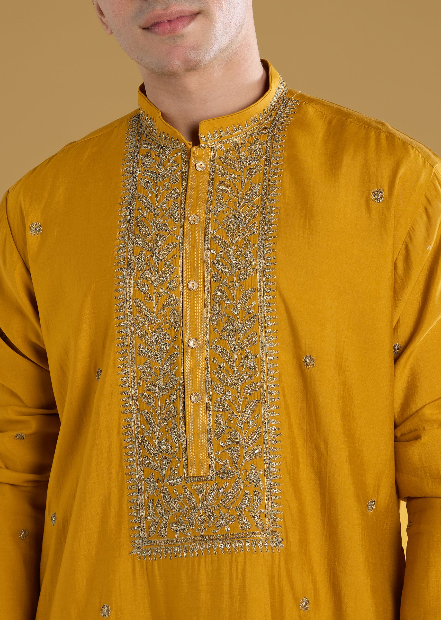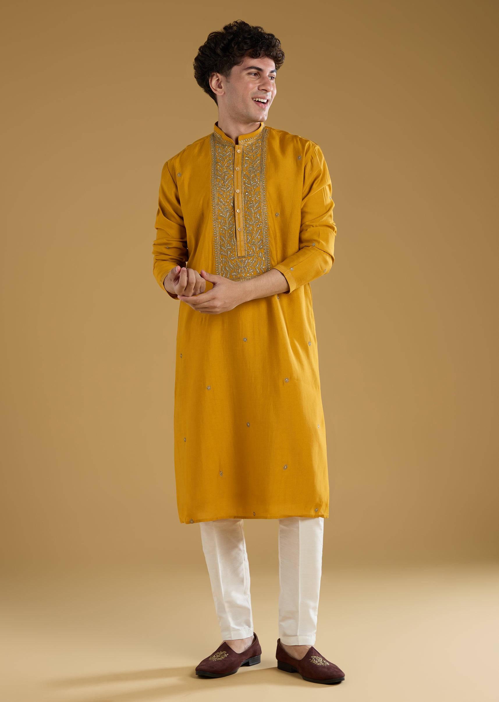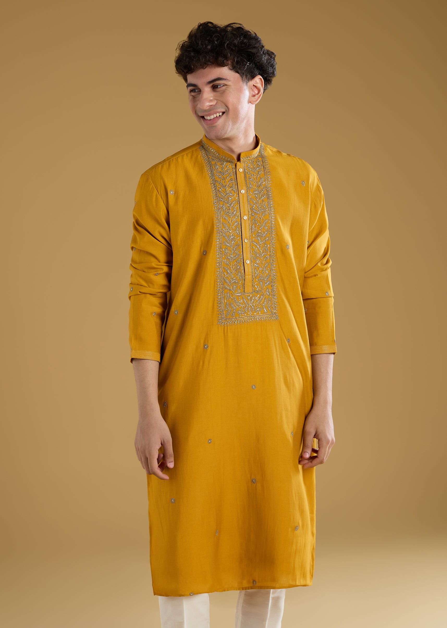 Bright and cheerful, this mustard yellow men’s kurta set in a color pop tone is perfect for pooja, haldi, and wedding celebrations. Crafted in smooth silk fabric, it features subtle thread detailing that adds texture and festive charm. The mandarin collar and full sleeves create a structured and polished silhouette, making it ideal for wedding guests who want a vibrant yet refined look. Designed for comfort and style, this kurta set ensures a standout and graceful presence during celebrations. Awarded as the Most Trusted Brand, we're delivering styles you love, just as promised.