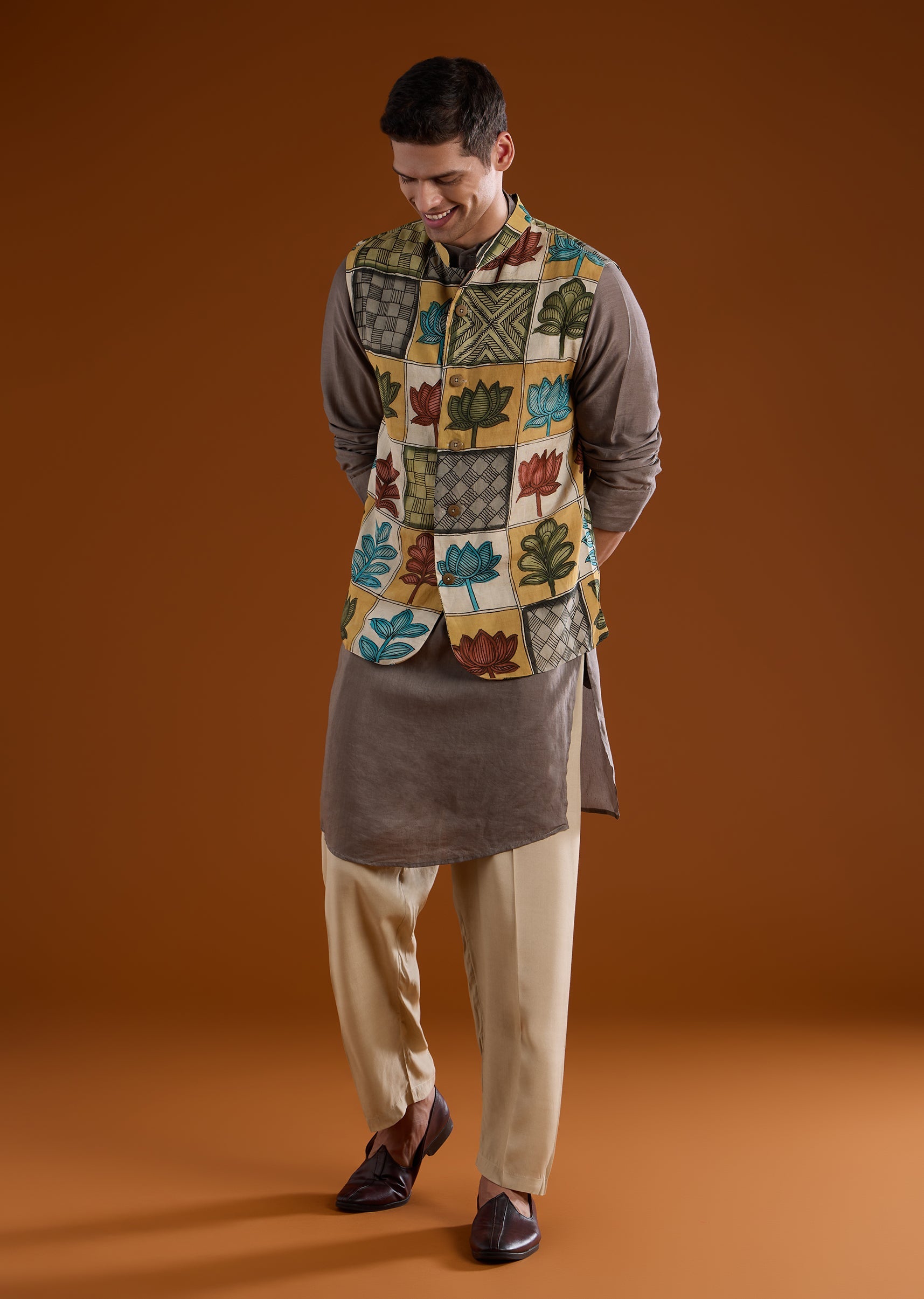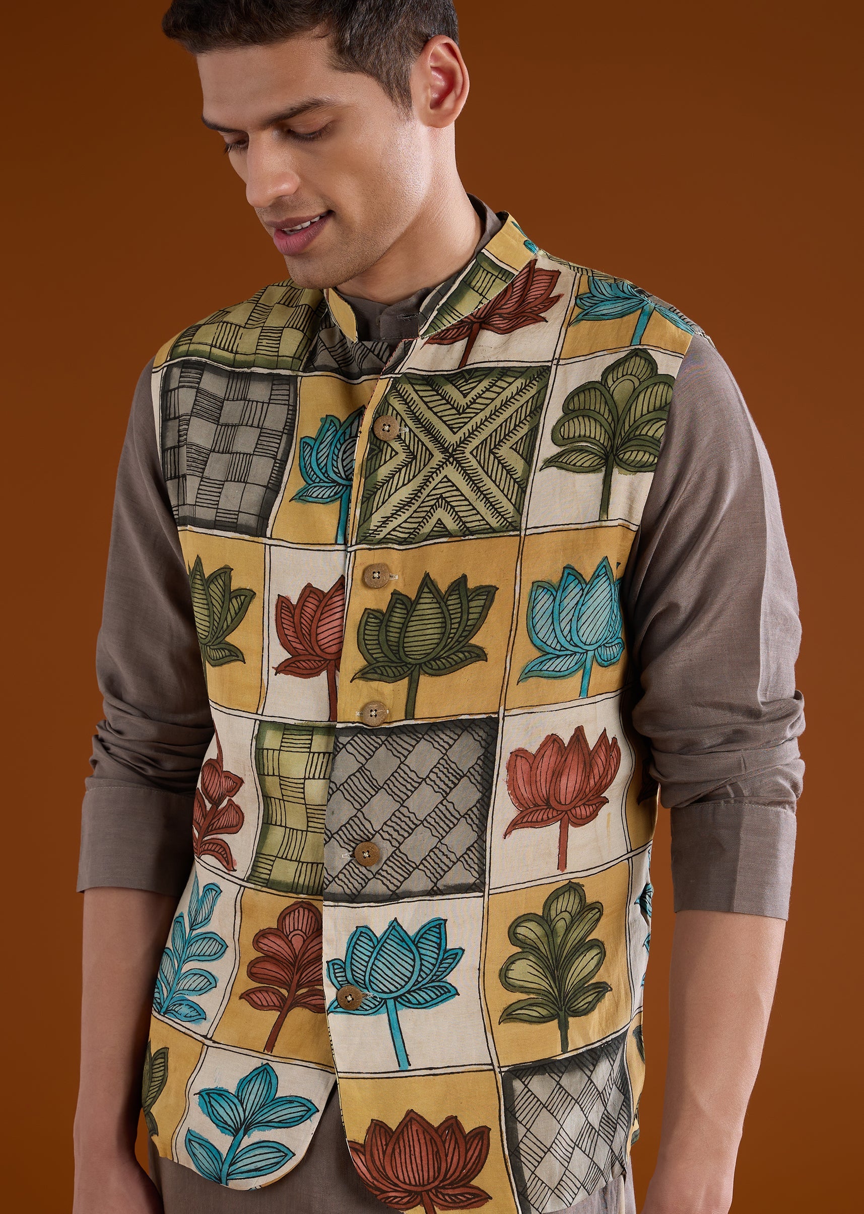 Mustard Yellow Silk Mens Kurta Jacket Set With Hand Painted Kalamkari