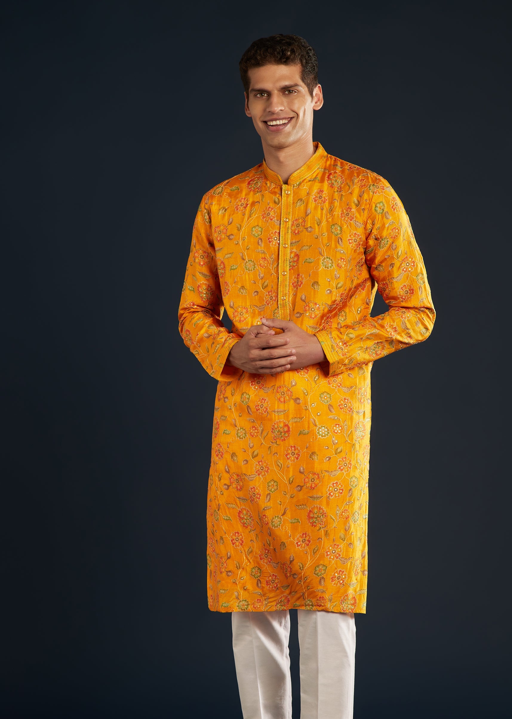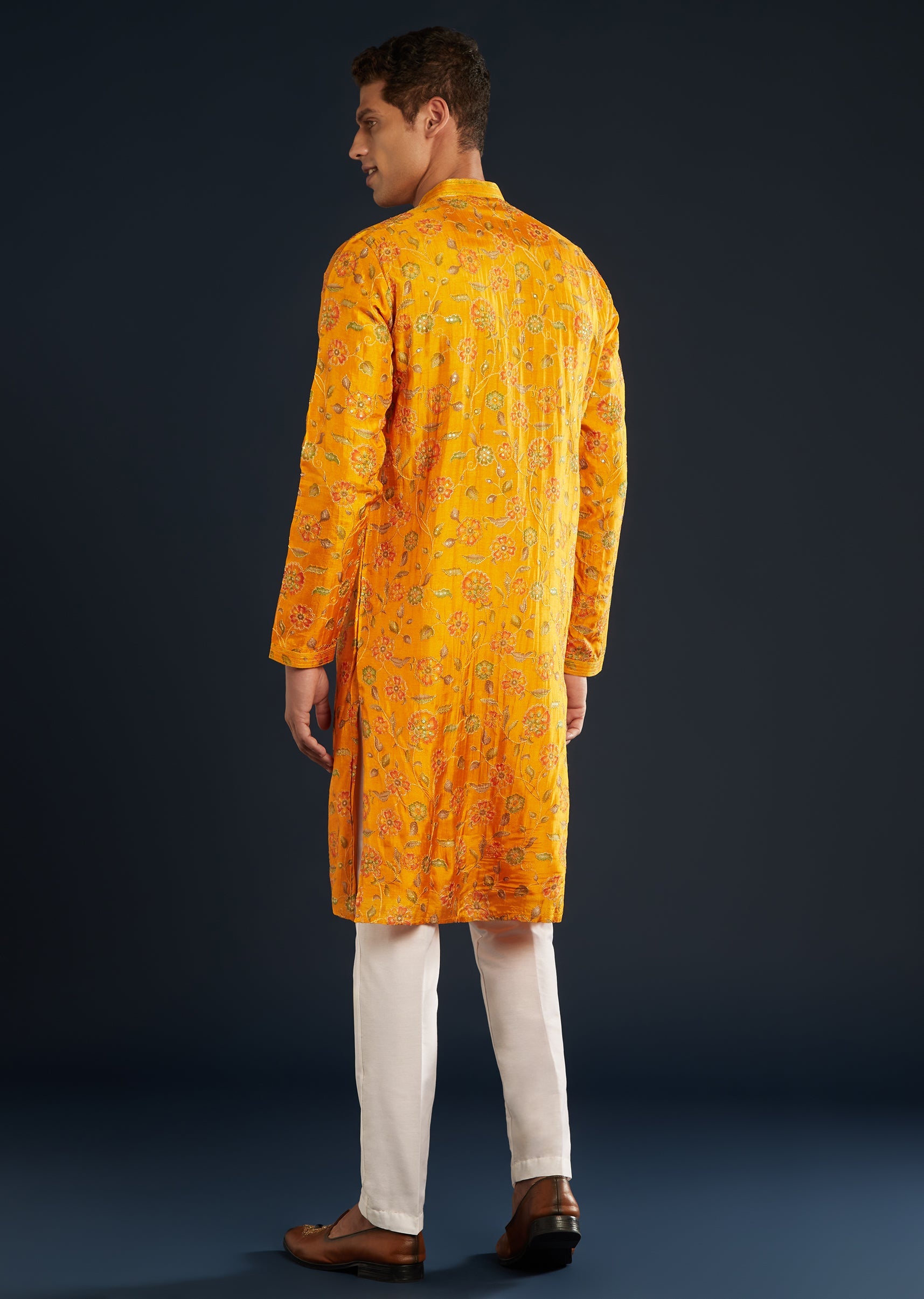 Mustard Yellow Silk Mens Kurta Set with Resham Sequins