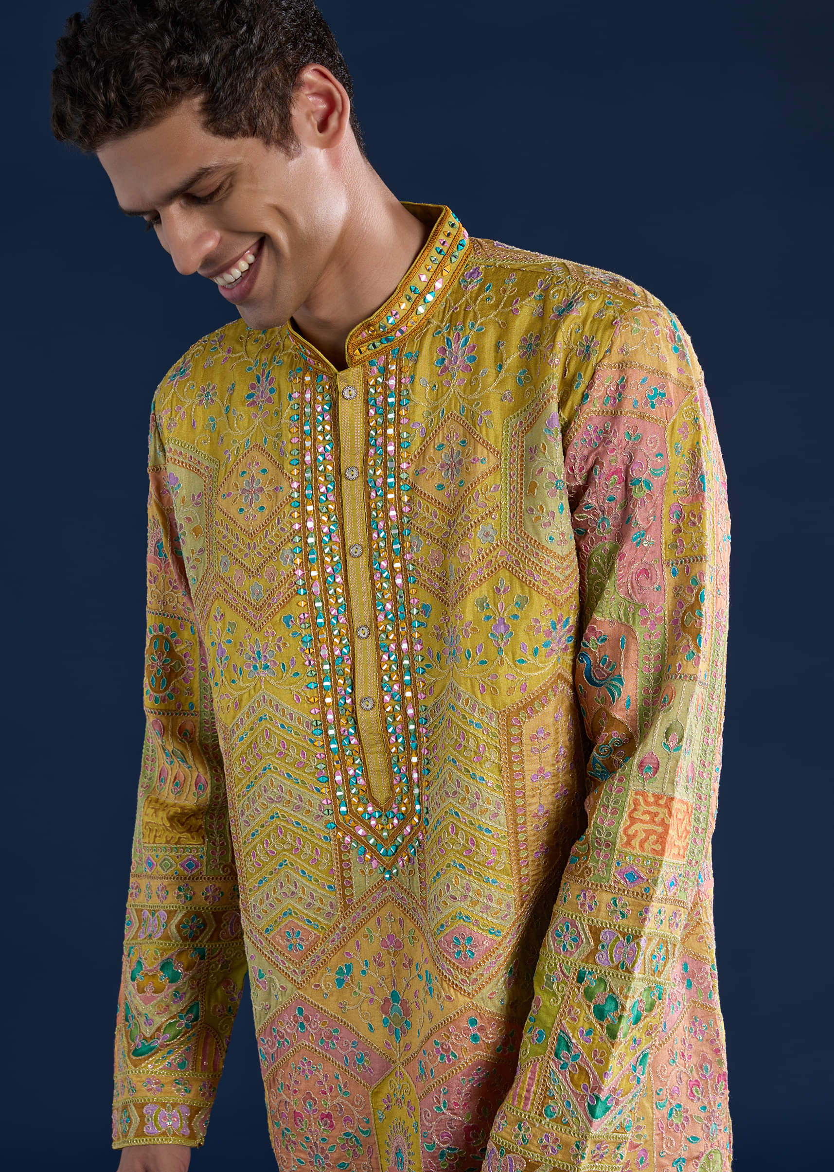 Fit Tips:Opt for a tailored fit through the shoulders and chest to enhance the kurta’s structured silhouette and mirror detailing.