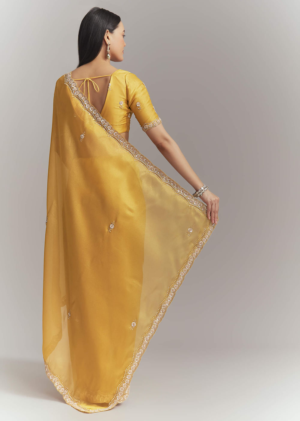 Mustard Yellow Tissue Embroidered Saree With Heavy Hand Embroidery