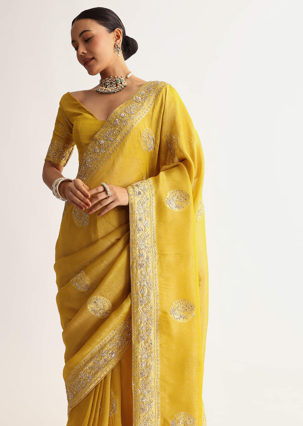 Bright mustard yellow silk saree richly embroidered on border and pallu. Features zardosi, sequins, and beads with zari weaves. Paired with a matching detailed blouse. Evokes festive warmth and elegance. Awarded as the Most Trusted Brand, we're delivering styles you love, just as promised.
