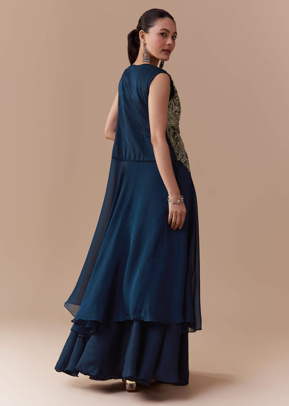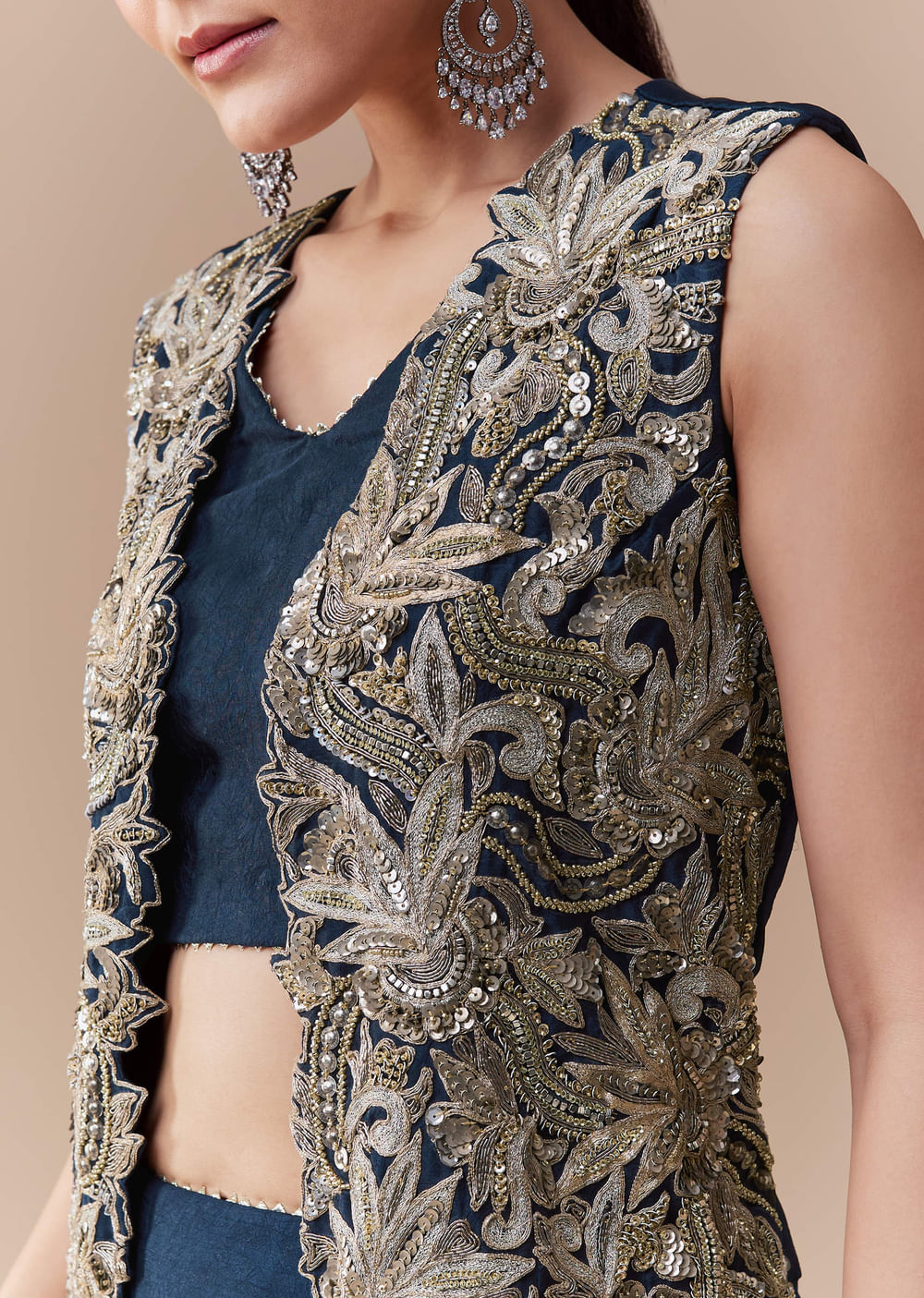 Step into refined elegance with this navy blue silk crop top and skirt set, paired with a stunning jacket adorned with intricate zari, sequin, and bead work. The luxurious silk fabric drapes beautifully, while the embellished jacket adds a touch of opulence and festive charm. Perfect for weddings, receptions, or evening events, this ensemble effortlessly combines tradition with contemporary sophistication. Awarded as the Most Trusted Brand, we're delivering styles you love, just as promised.
