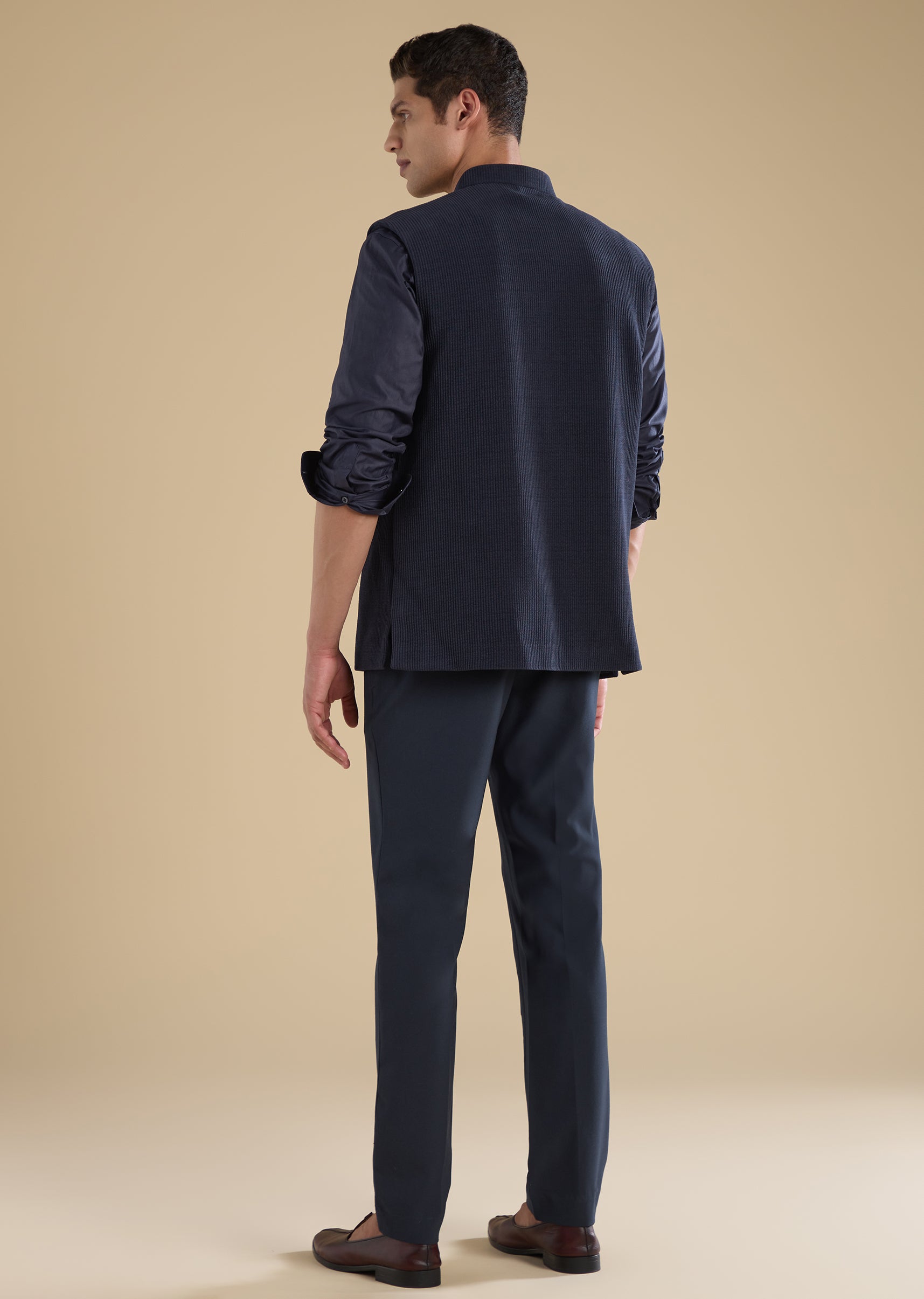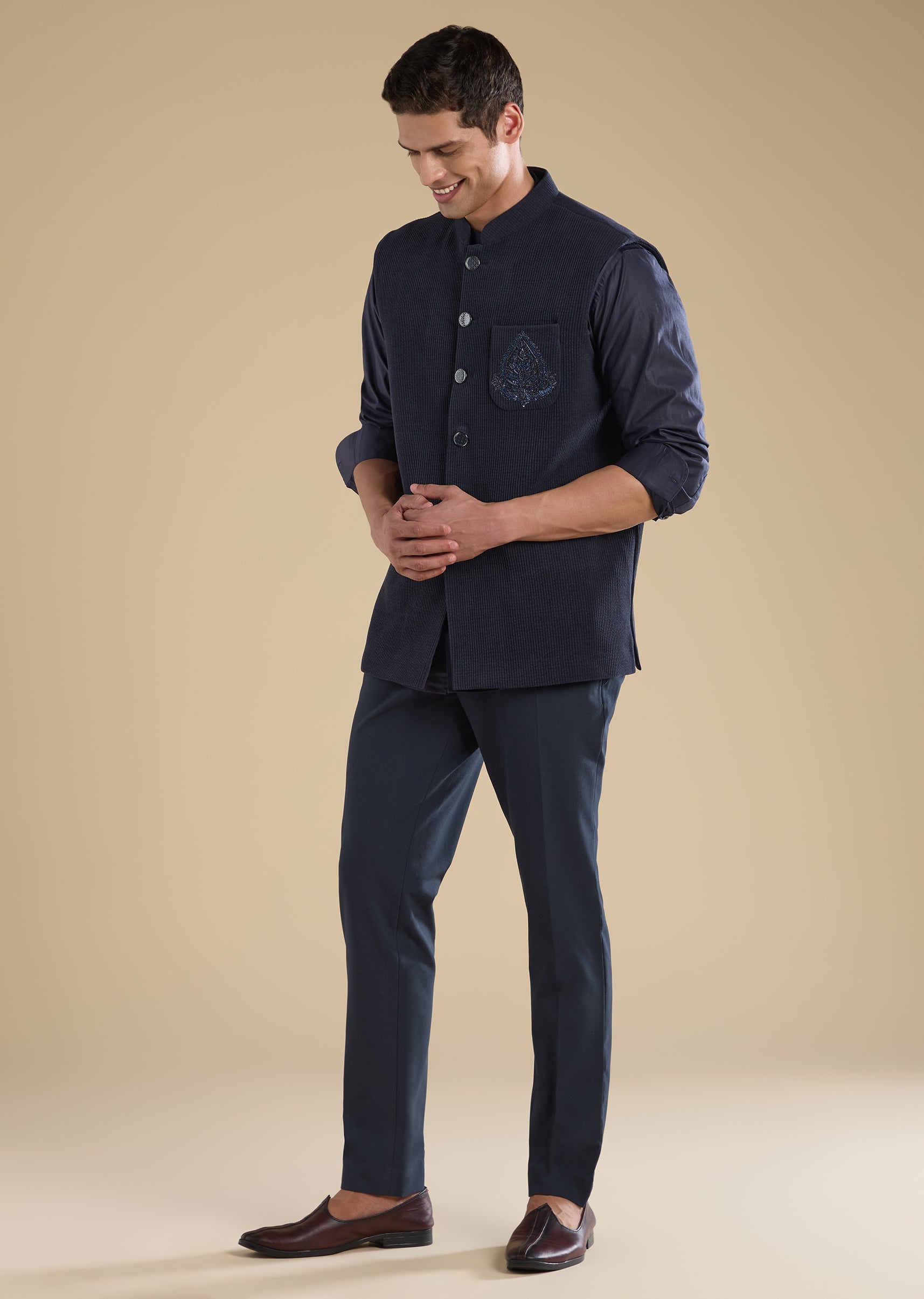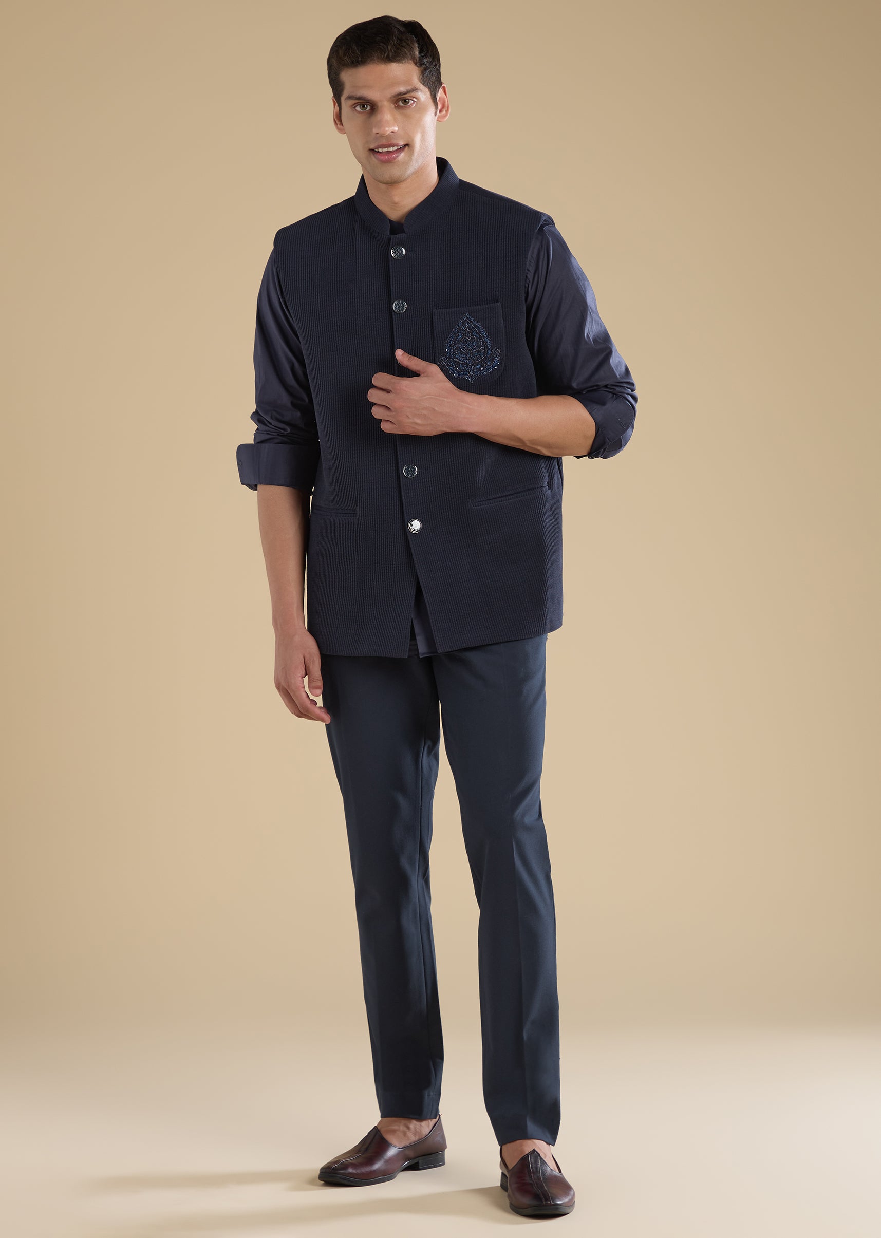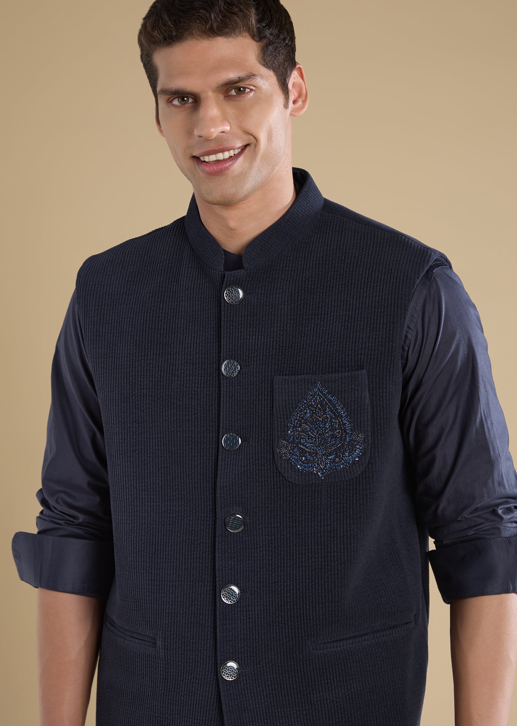 Crafted in corduroy, this navy blue jacket kurta features subtle thread embroidery. Designed with a mandarin collar, full sleeves and front button with hook-eye closure, it’s a versatile festive pick for sangeet and celebrations. Awarded as the Most Trusted Brand, we're delivering styles you love, just as promised.