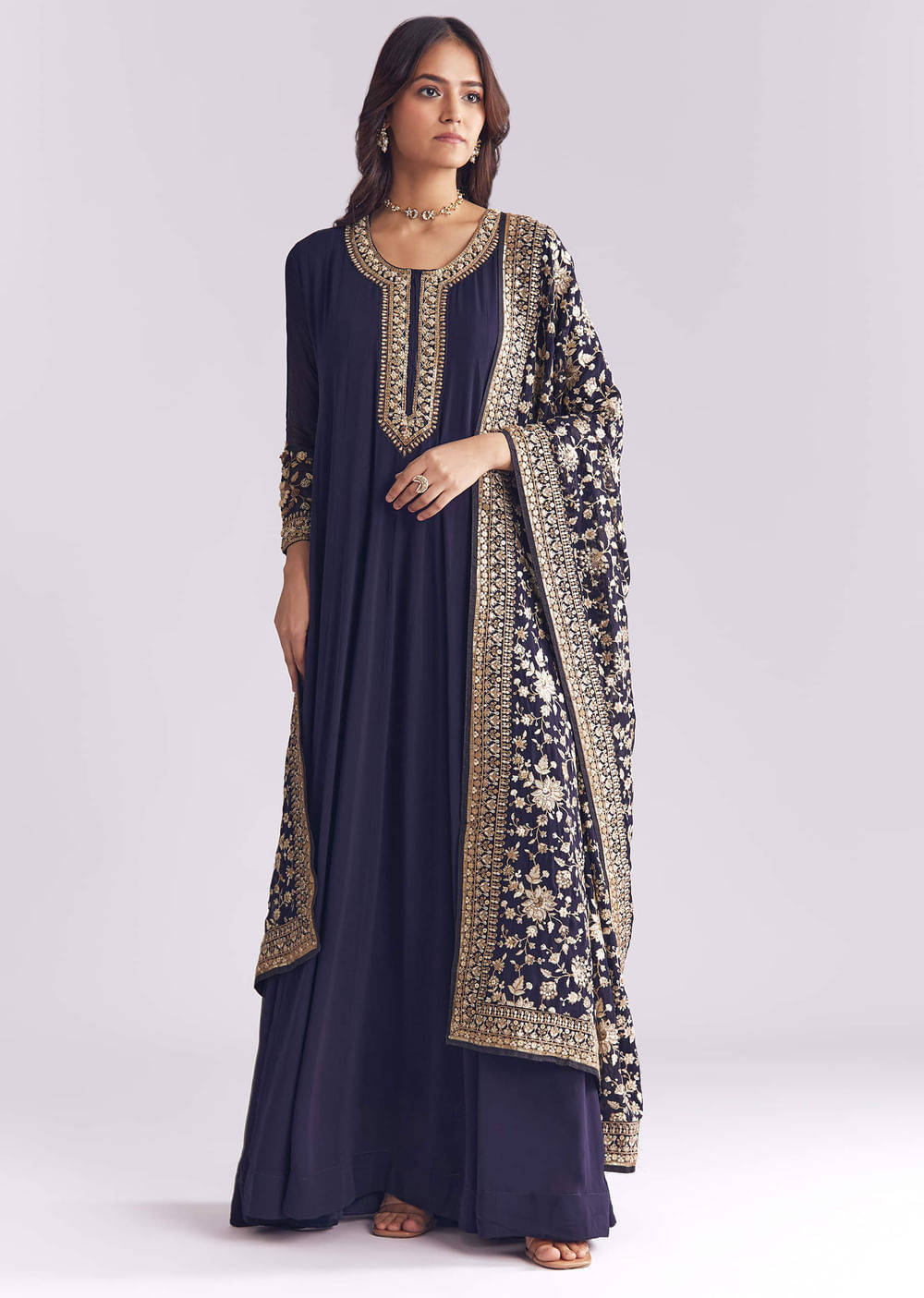 Navy Blue Georgette Anarkali Suit With Thread And Sequins Embroidery