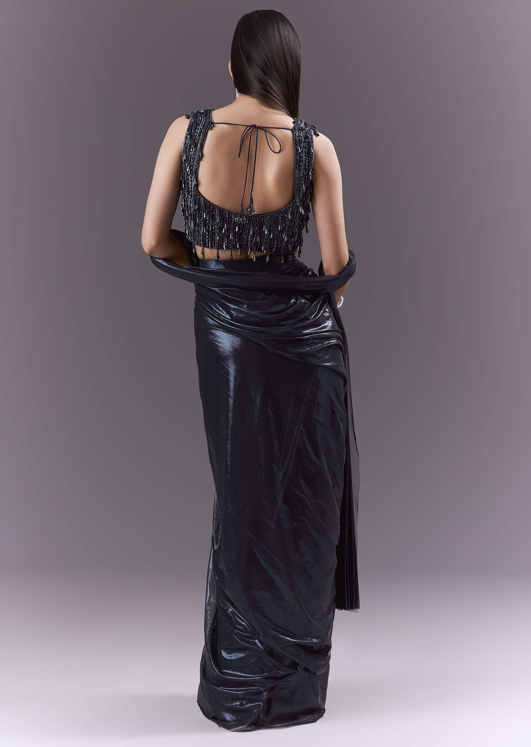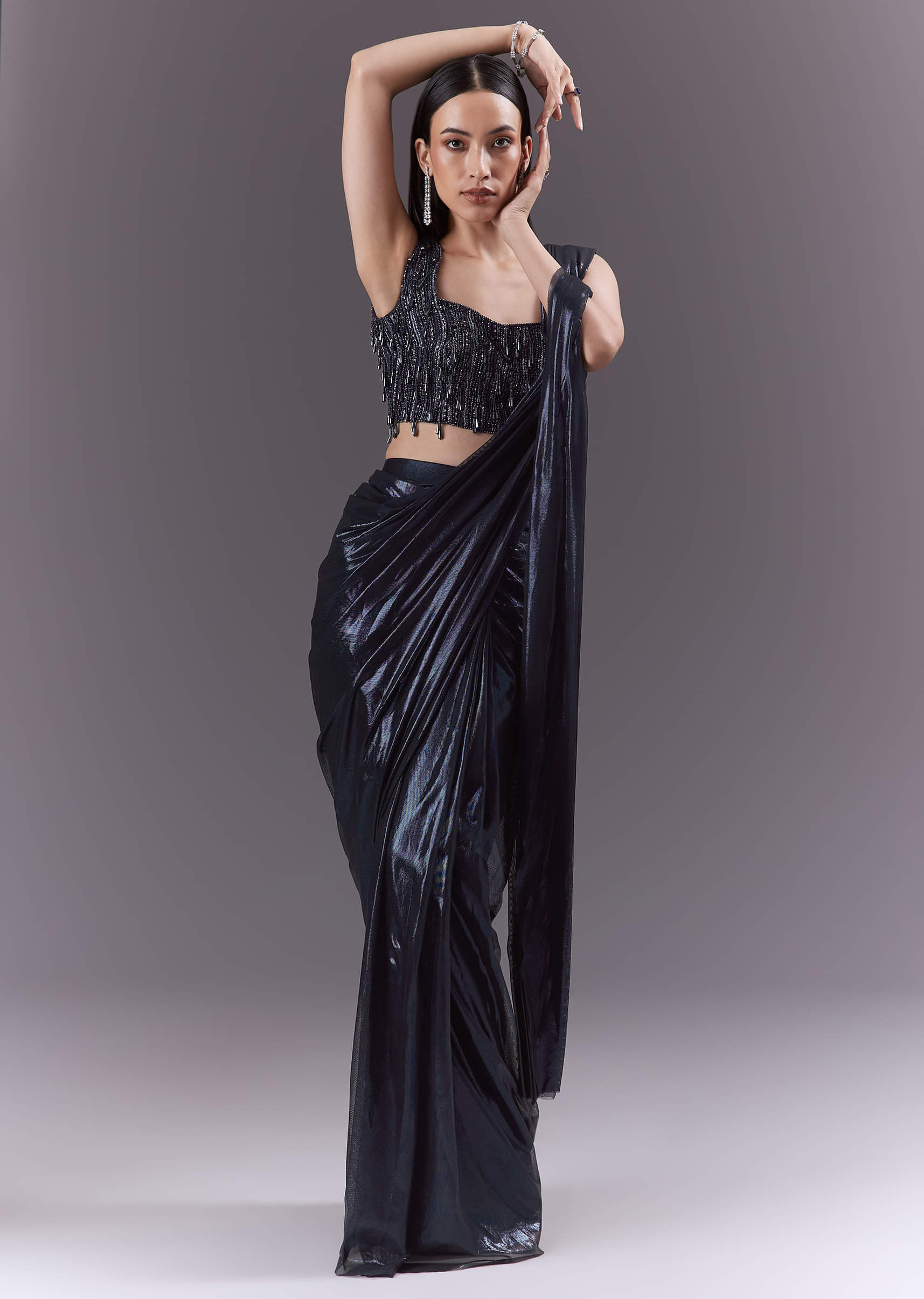 For after-dark drama, this navy blue imported fabric ready pleated saree teams a pre-stitched drape with a worked blouse in sequins, beads, cutdana and playful tassels. The deep tone and... More Product Details