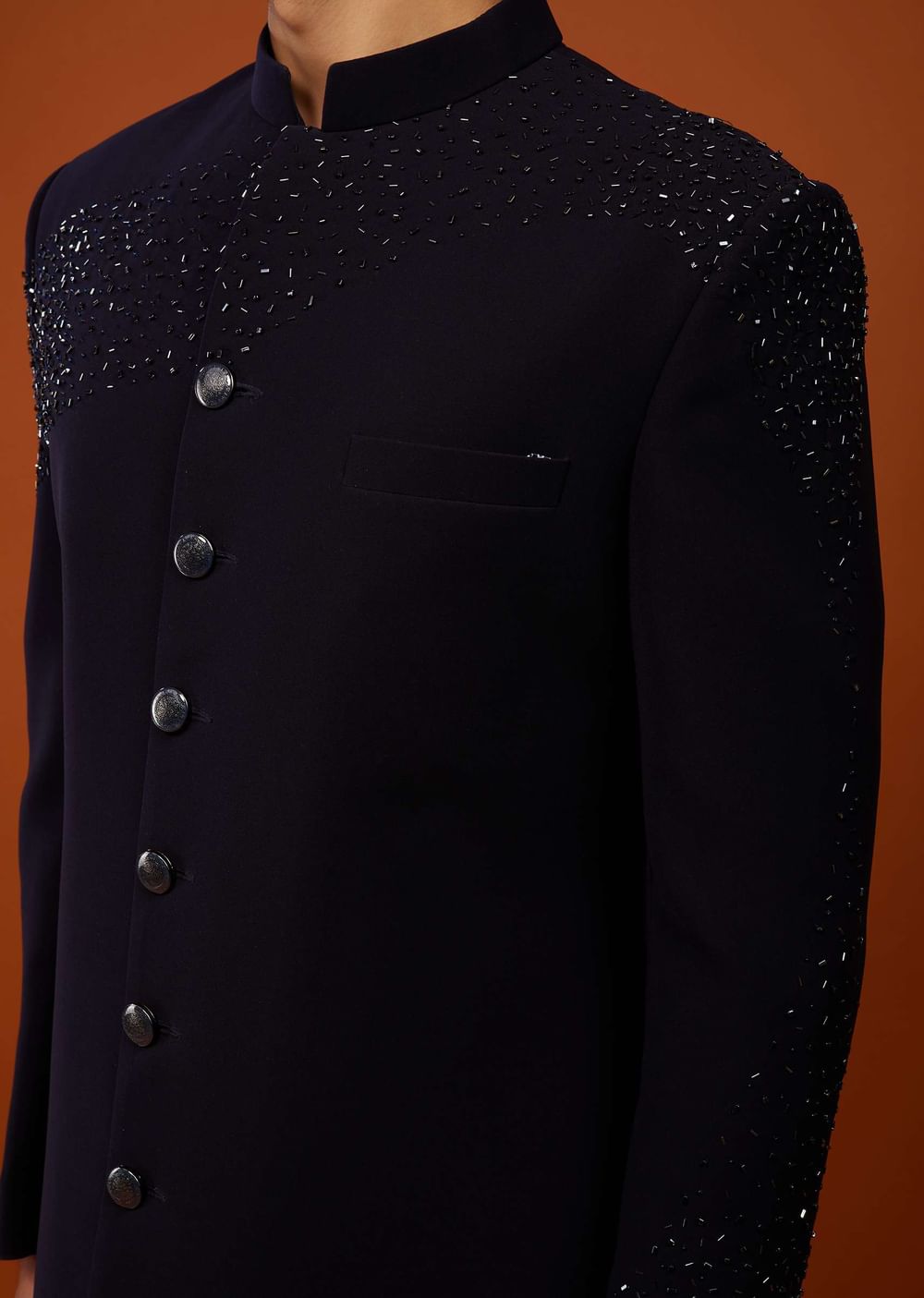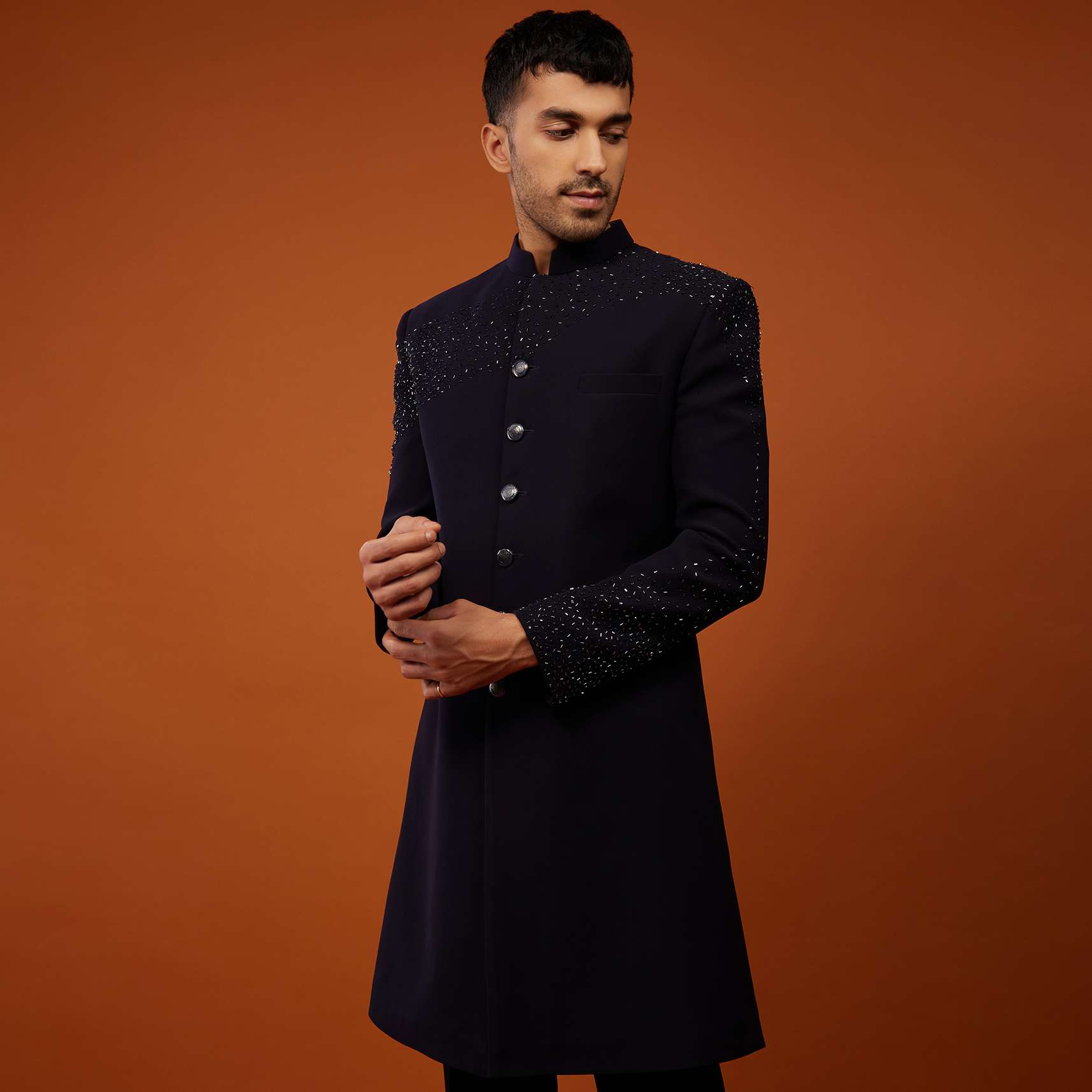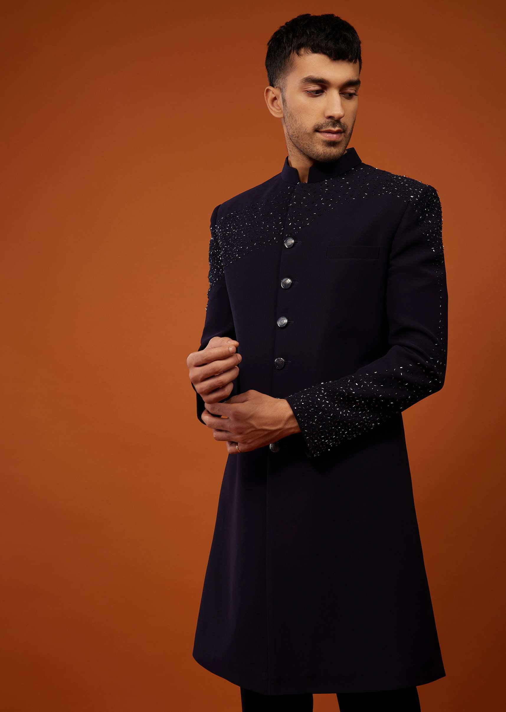 Navy blue embroidered indo-western sherwani set fabricated in Japanese suiting fabric.It comes in a mandarin collar neckline with cutdana embroidery and is paired with matching trouser pants.Buttons and Accessories may vary in color, shape and size. Awarded as the Most Trusted Brand, we're delivering styles you love, just as promised.